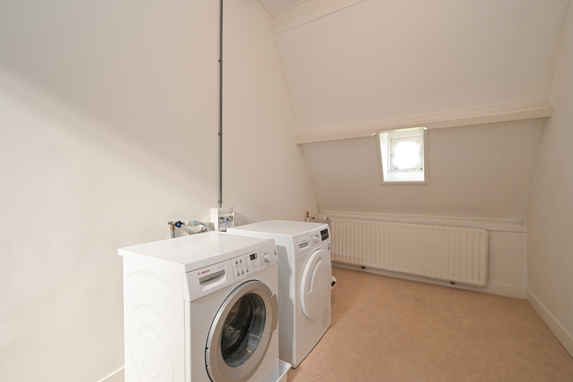 Zeer lichte overloop door het grote dakraam, wc met fonteintje, ruime voorkamer met dakkapel en inbouwkasten, hoog plafond met extra daglicht toetreding, voorzijkamer is in gebruik als laundry, ruime slaapkamer achter met ingebouwde kasten, achter zijkamer. De gehele verdieping heeft fraaie houten vloerdelen en de laundry ruimte (of achter zijkamer) biedt voldoende mogelijkheden om een extra douche en wastafel aan te brengen, zie artist impression (voor ca. €16.000 - €18.000; offerte is beschikbaar). De achterkamers bieden gedeeltelijk vrij zicht en kijken ook uit op het fraaie gebouw van het Haganum.