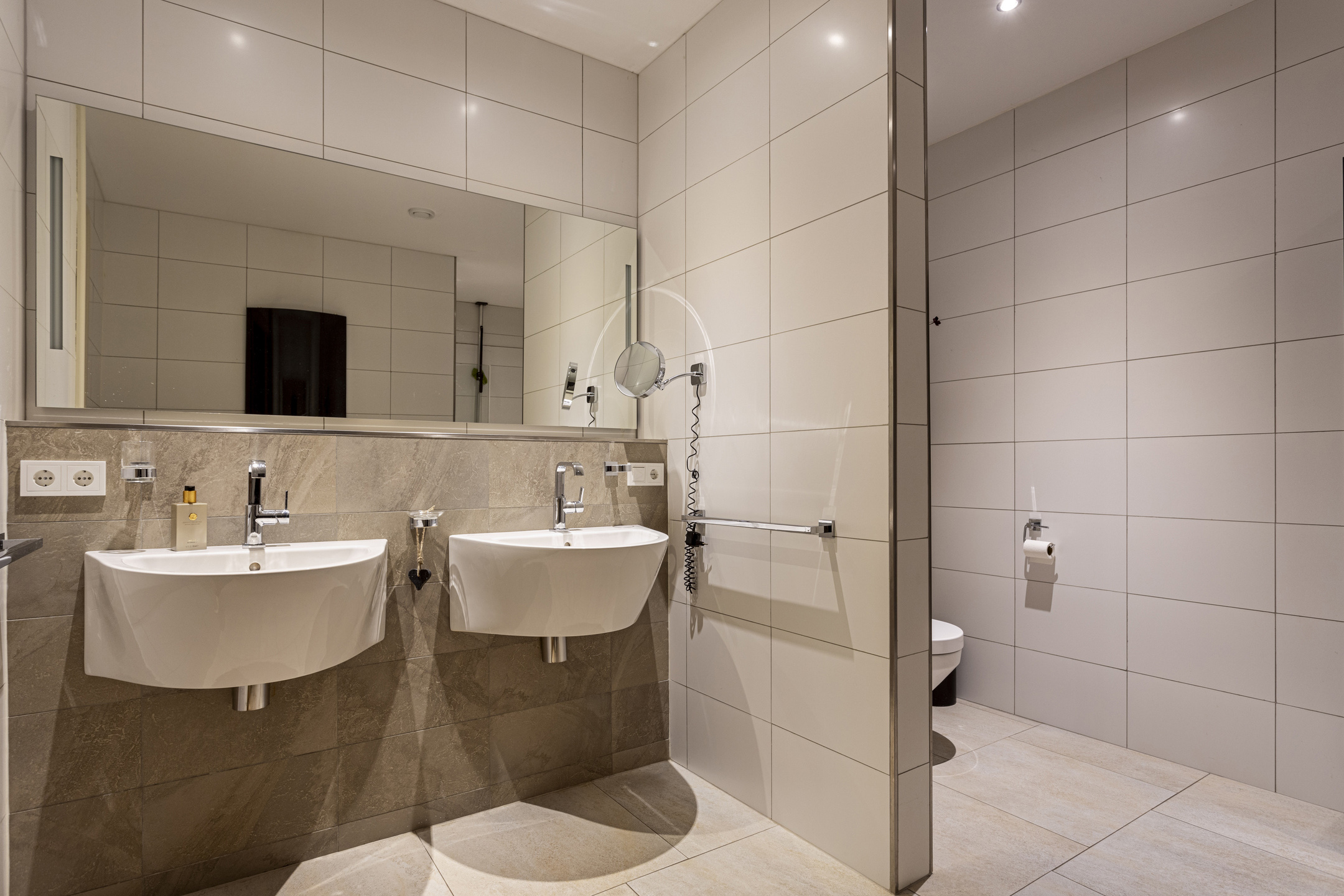 De grote slaapkamer is te bereiken middels de badkamer: met de allure van een exclusief resort, is deze voorzien van een dubbele douche met regendouche, een vrijstaand bad met uitzicht op de tuin, en een grote dubbele wastafel.