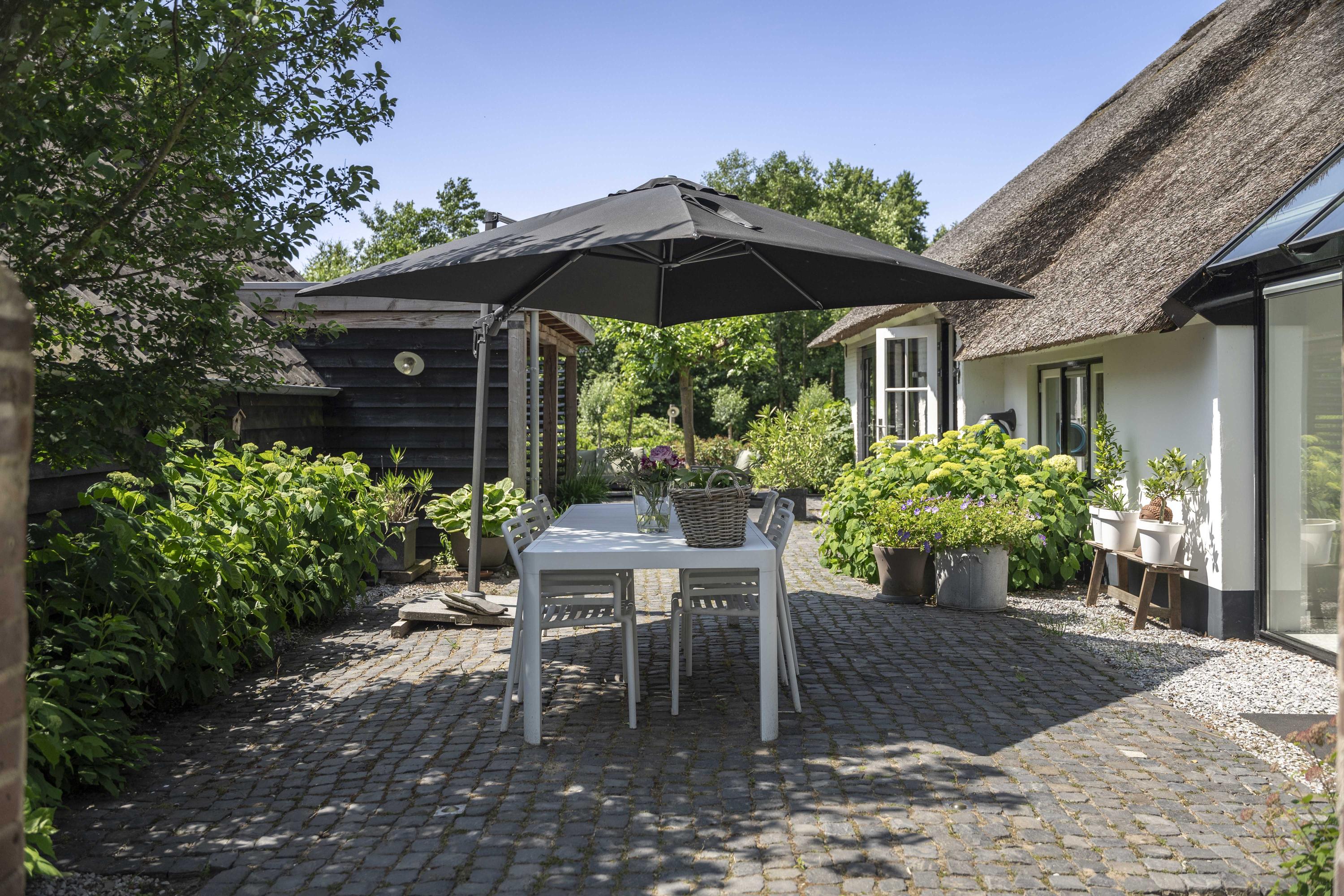 De witte gevels en de grote rieten kap zijn als eerste zichtbaar, wanneer men vanaf de Larense kant aan komt rijden. Een klassieke schoonheid is het, nummer 84, zo’n beetje gelegen op de kop van de dijk. Het hek opent automatisch en onder de banden knerpt het grindpad wanneer u hier de royale oprit oprijdt. Een plek die tot de verbeelding spreekt, die inspireert. Dat is terug te zien in het fenomenale interieur, want vanbinnen verrast de woning met eigentijds en innovatief design.