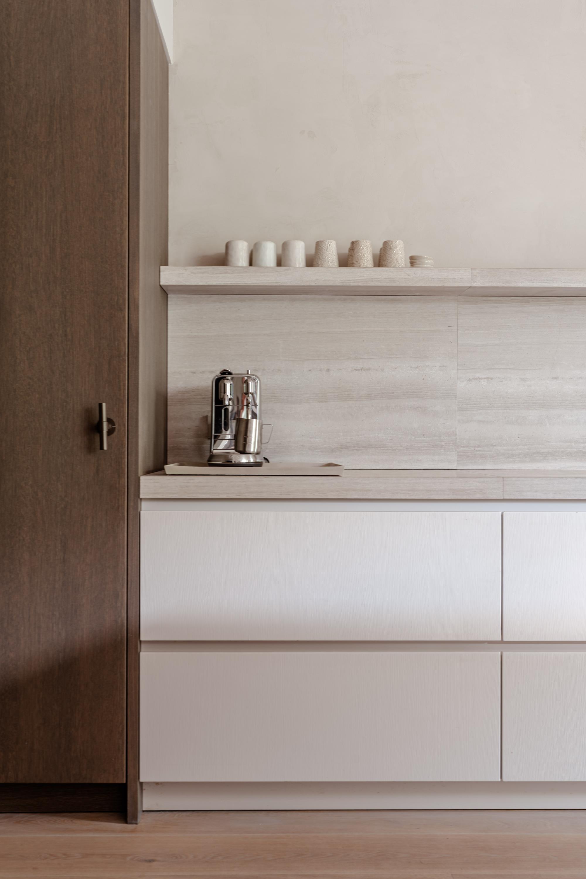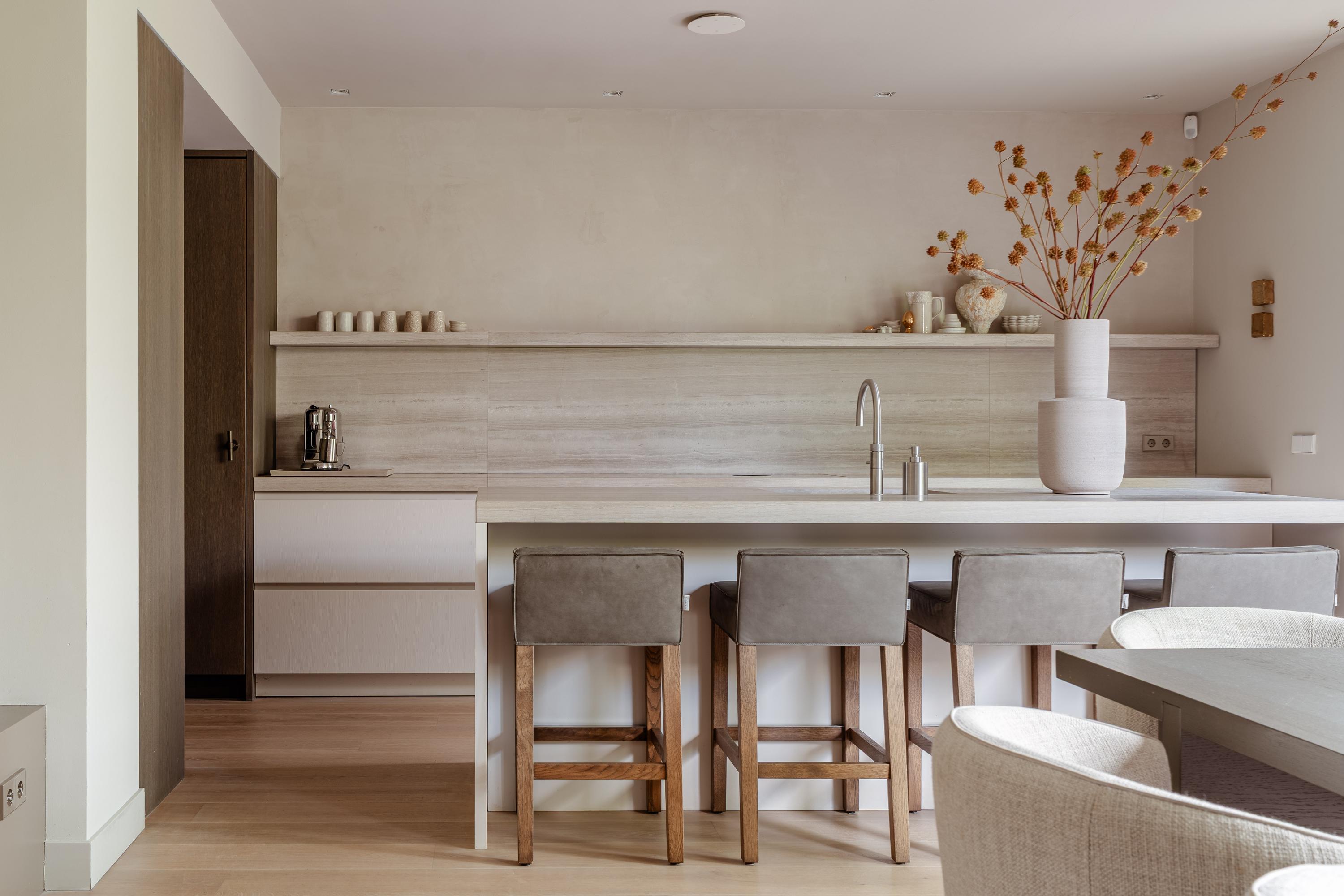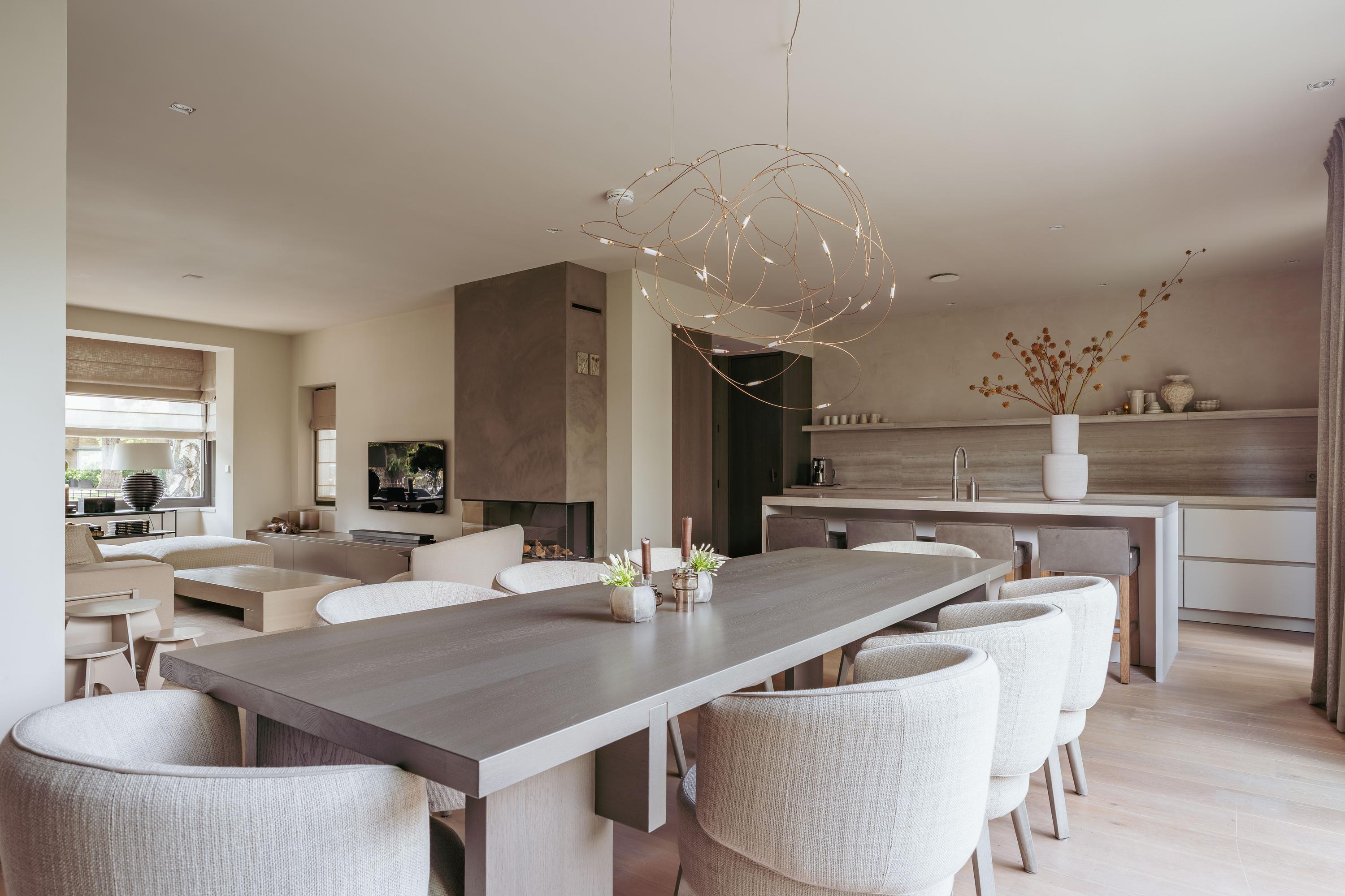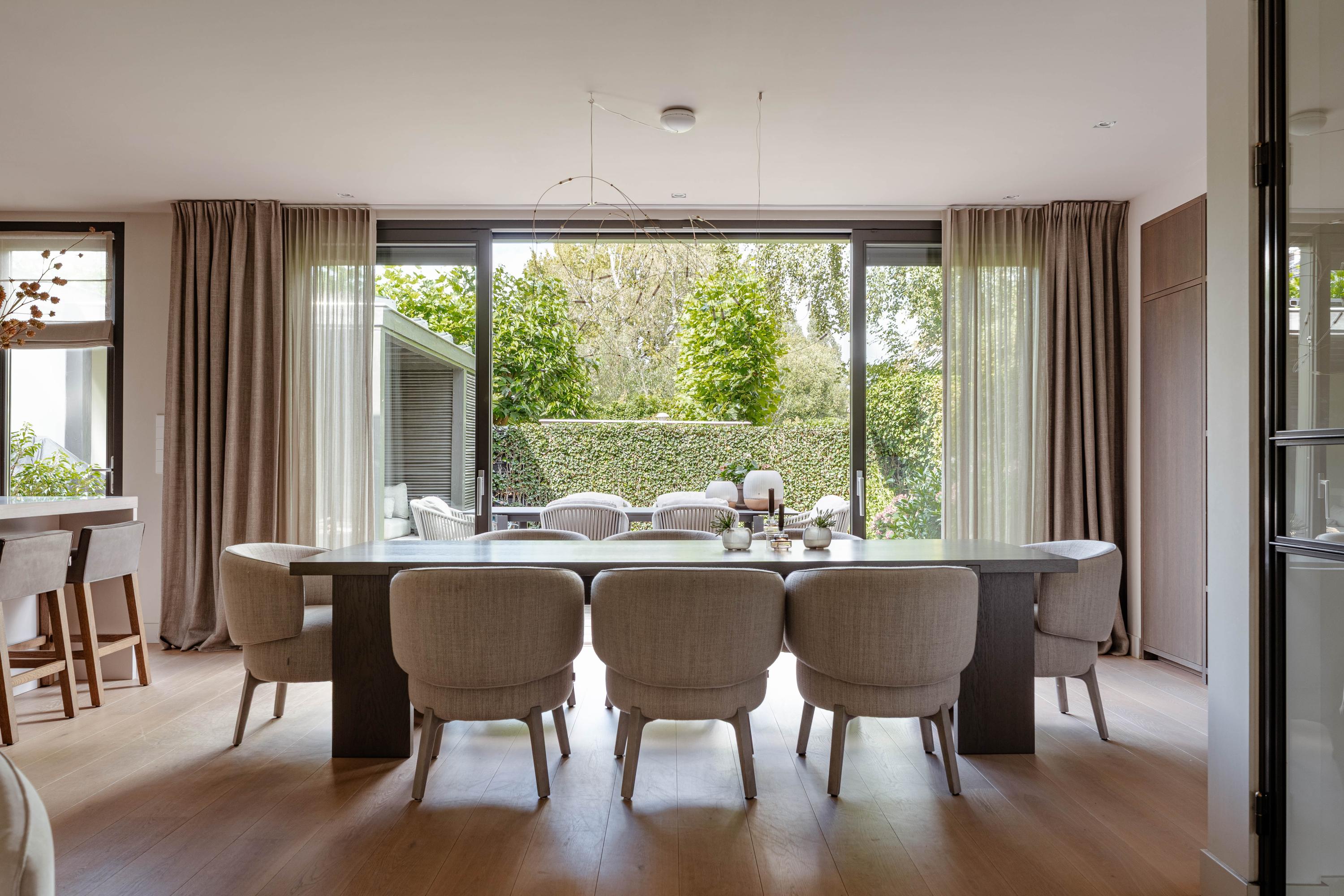 Grenzend aan de woonkamer bevindt zich de eetkamer, met een schuifpui die directe toegang biedt tot het terras. Een elegante houten designkast van Piet Boon, inclusief Liebherr wijnklimaatkast, maakt dit tot de ideale plek voor lange diners en intieme borrels. De aangrenzende keuken is een meesterwerk van design en functionaliteit. Het marmeren kookeiland vormt het middelpunt. Verder is de keuken uitgerust met hoogwaardige Miele-apparatuur, waaronder een oven, combi-oven/magnetron en koel-vriescombinatie en een Quooker Cube (voor direct kokend, gekoeld én bruisend water). De wandopstelling met zes brede soft-close laden in licht houtfineer biedt royale bergruimte en versterkt de serene uitstraling.