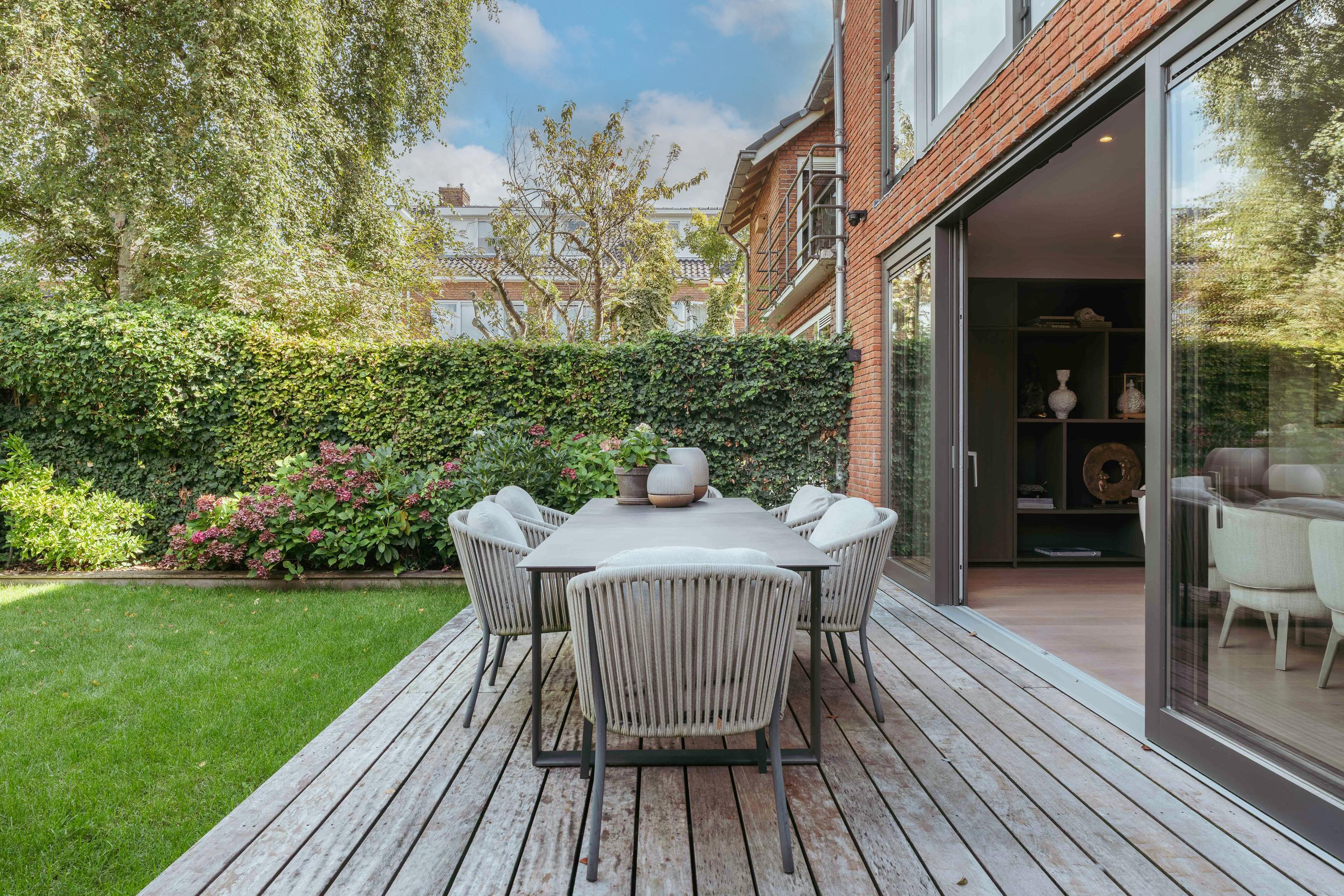 De achtertuin is ingericht met vergrijsde hardhouten vlonderplanken, weelderige hortensia’s en groene hedera. Hier vindt u een heerlijke plek om te ontspannen in alle privacy. In de schuur is extra bergruimte en er is een separaat gedeelte voor de warmtepomp. Ook is er een doorgang naar het beveiligde achterpad, ideaal als achterom voor de kinderen.