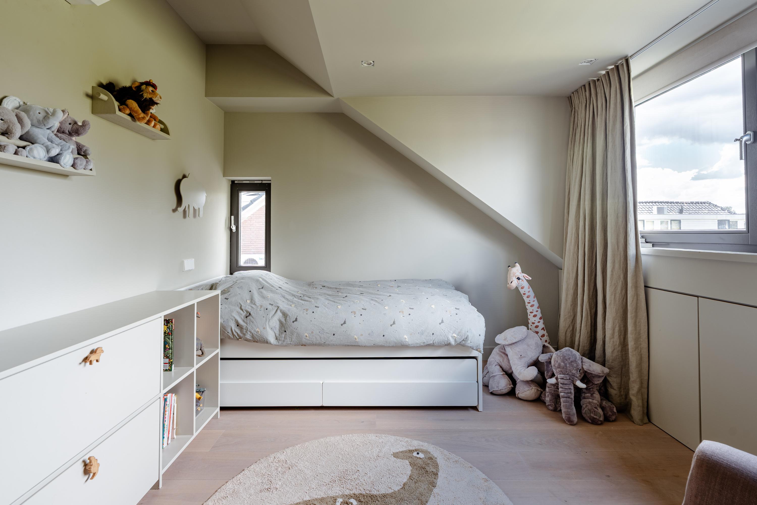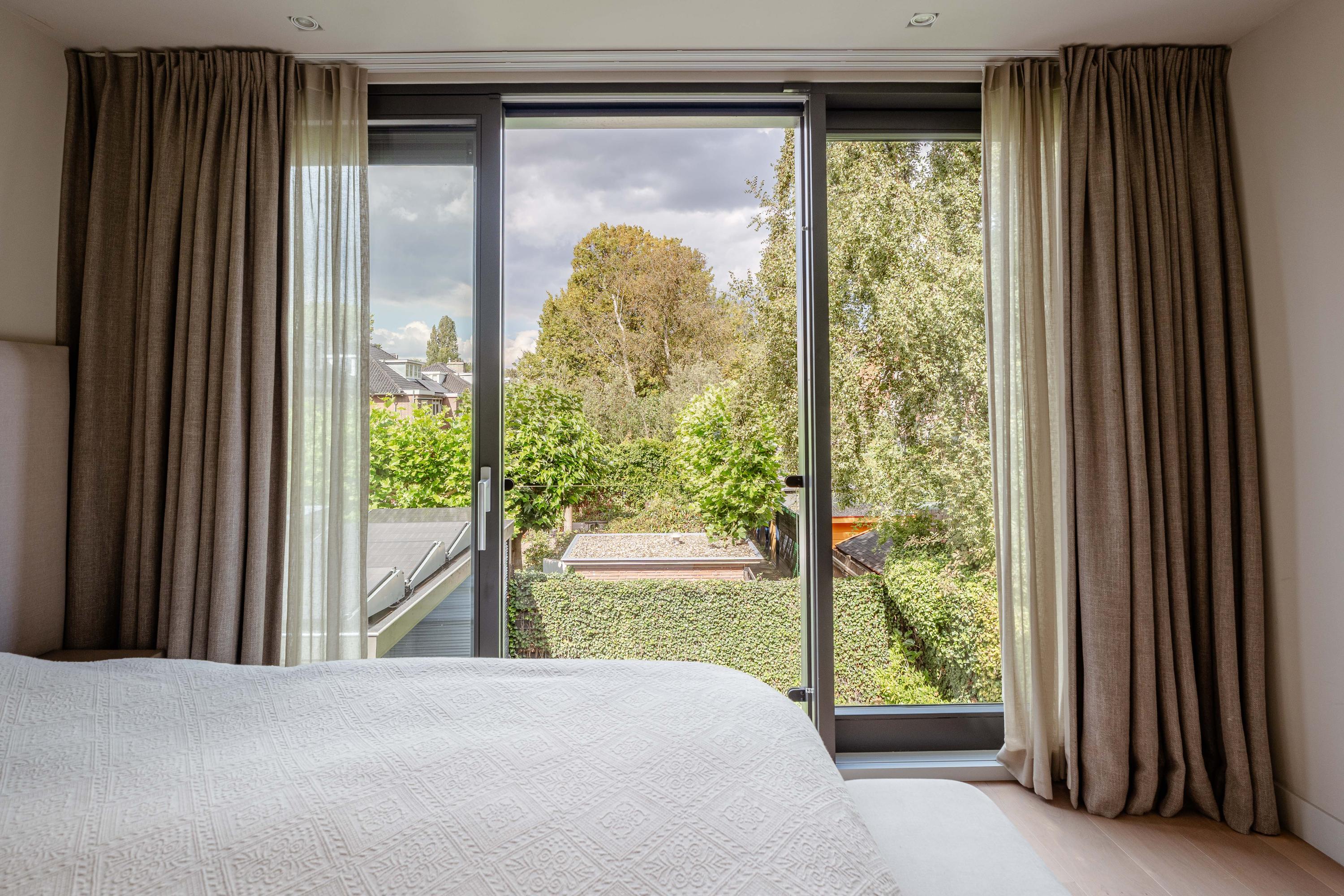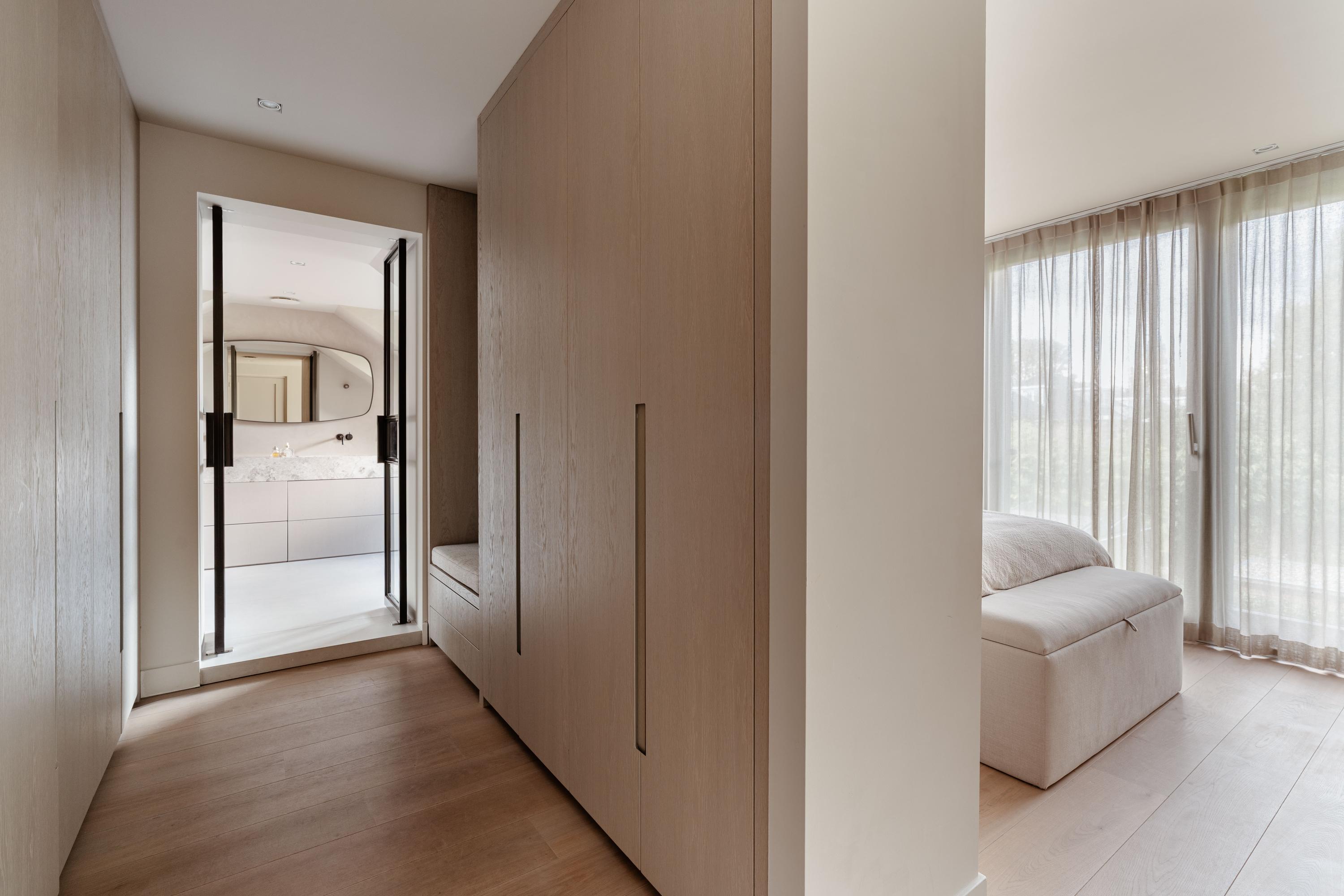 De masterbedroom is een waar toevluchtsoord. Het inbouw headboard met taupe leren nachtkastjes en koperen lampjes geeft de ruimte een hotelwaardige uitstraling. Dankzij de dubbele raambekleding – doorschijnend én verduisterend – geniet u van maximale flexibiliteit. De ruime inloopkast, met laden, schoenenkasten en hanggedeeltes, geeft toegang tot de ensuite badkamer.