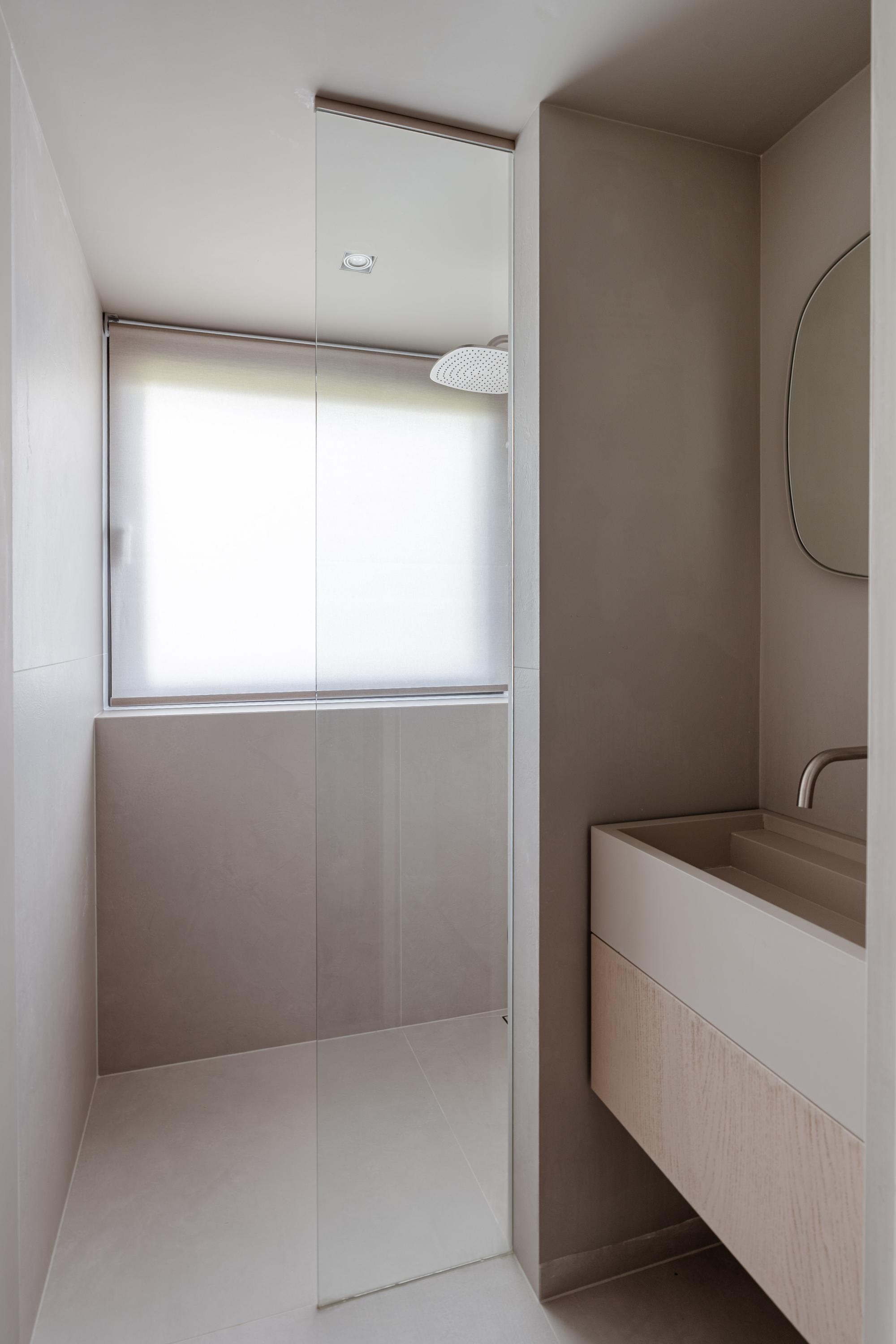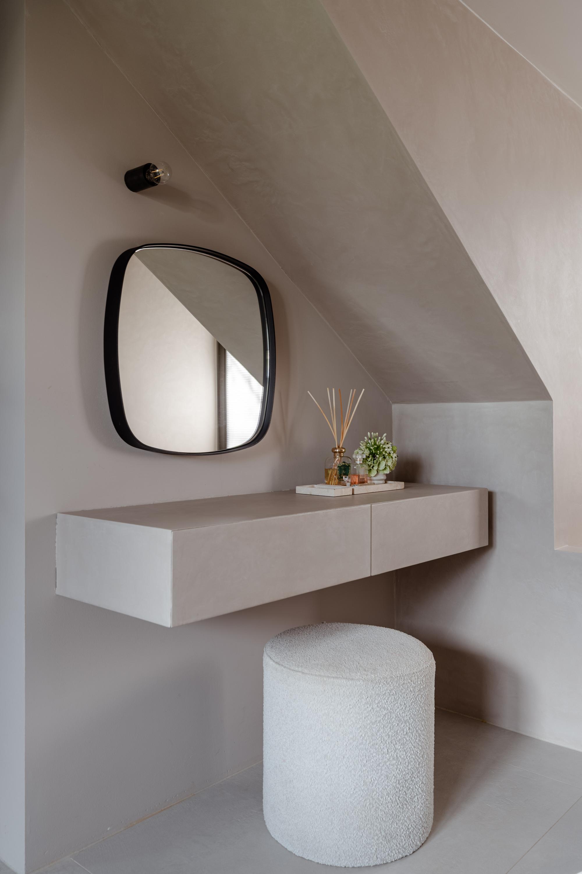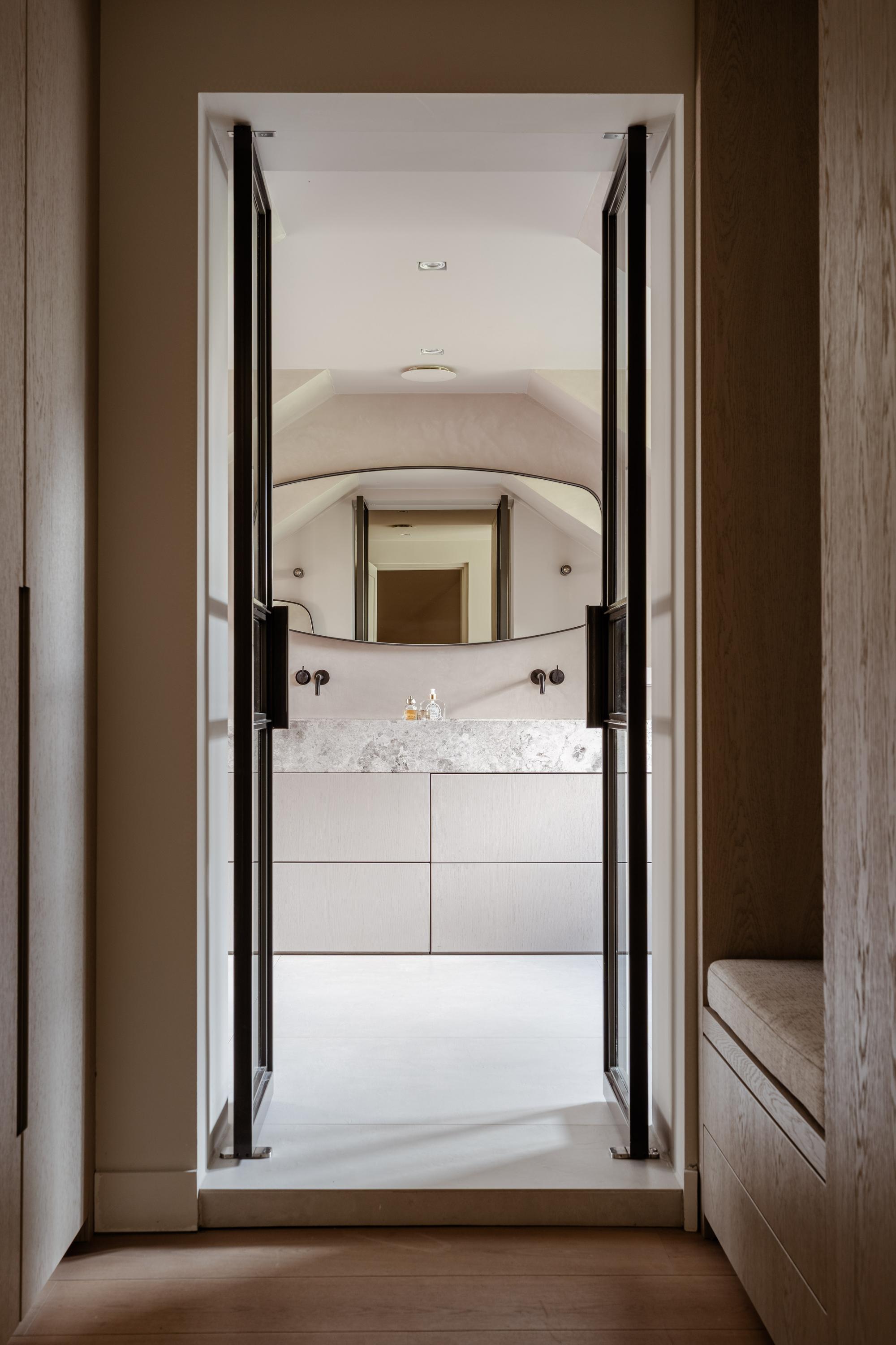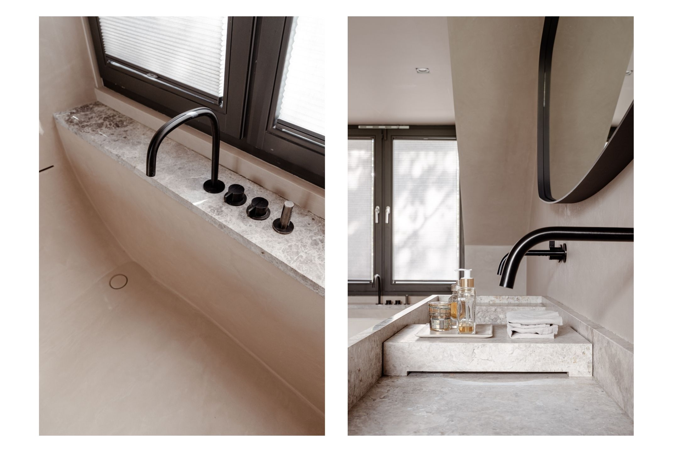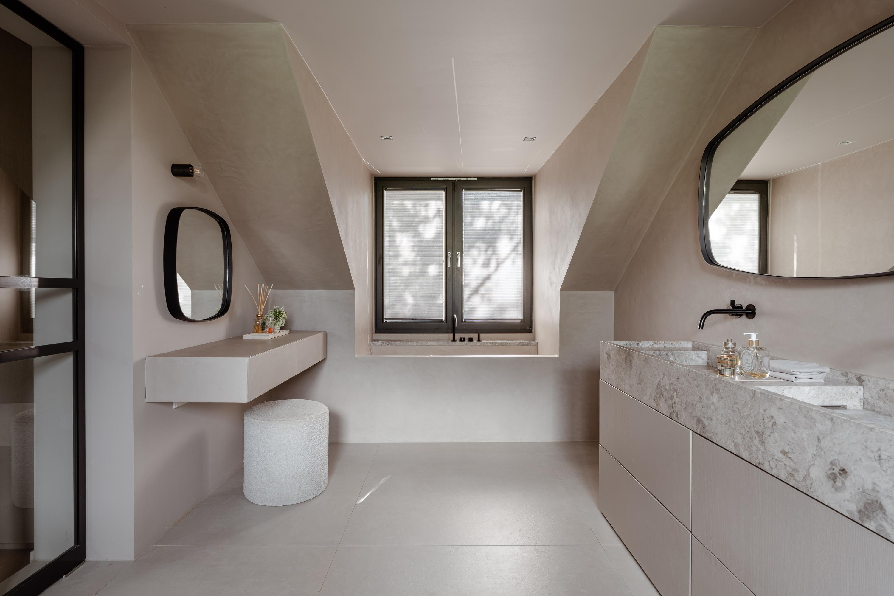 De masterbadkamer, ontworpen door Piet Boon, is uitgevoerd in exclusieve materialen. Een dubbele wastafel van Portugees marmer met COCOON-inbouwkranen, een in betonciré meegestuuct ligbad en een royale regendouche met glazen deur maken dit een spa-ervaring aan huis.