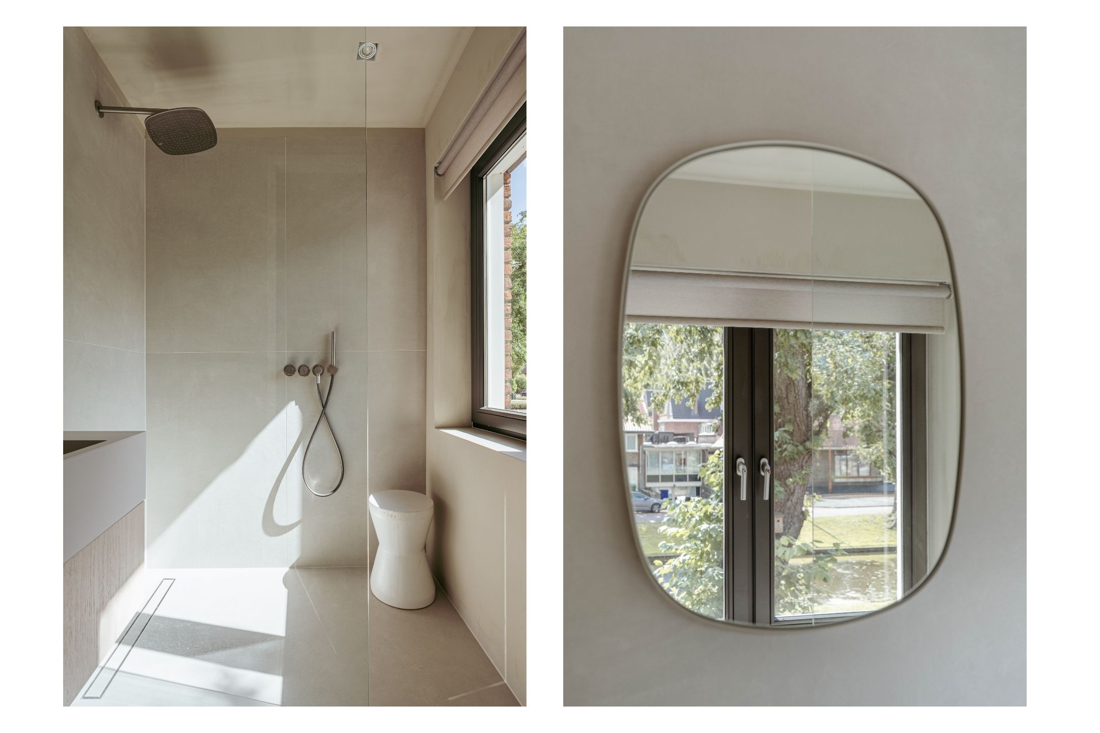Op deze verdieping bevindt zich tevens een tweede slaapkamer met maatwerkkast en een tweede badkamer in dezelfde hoogwaardige stijl, voorzien van grote tegels, inbouwkranen en een modern wastafelmeubel.