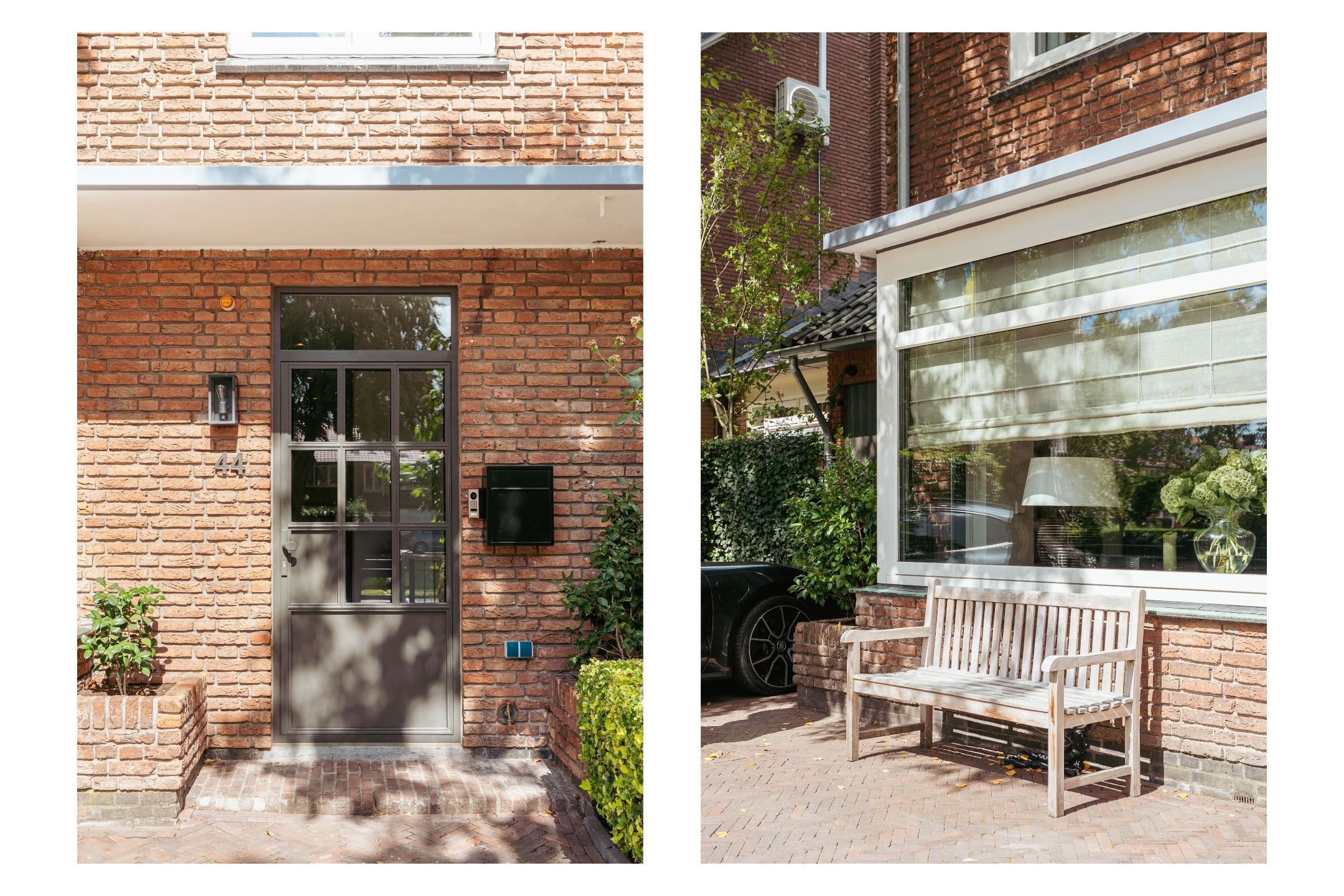 De voortuin straalt allure uit en de oprit is afgesloten middels antracietgrijs elektrisch schuifhek.Bij binnenkomst wordt direct duidelijk dat hier over elk detail is nagedacht. De stalen voordeur – een klassiek ontwerp in antracietgrijs naar moderne isolatienormen– vormt een waardige entree. De hal is voorzien van een maatwerk garderobekast met lichte houtfineer deuren, een stijlvol toilet met Piet Boon COCOON-fonteinkraan en eikenhouten trap met stalen leuningen. Via hoge taatsdeuren betreedt u de woonkamer.
