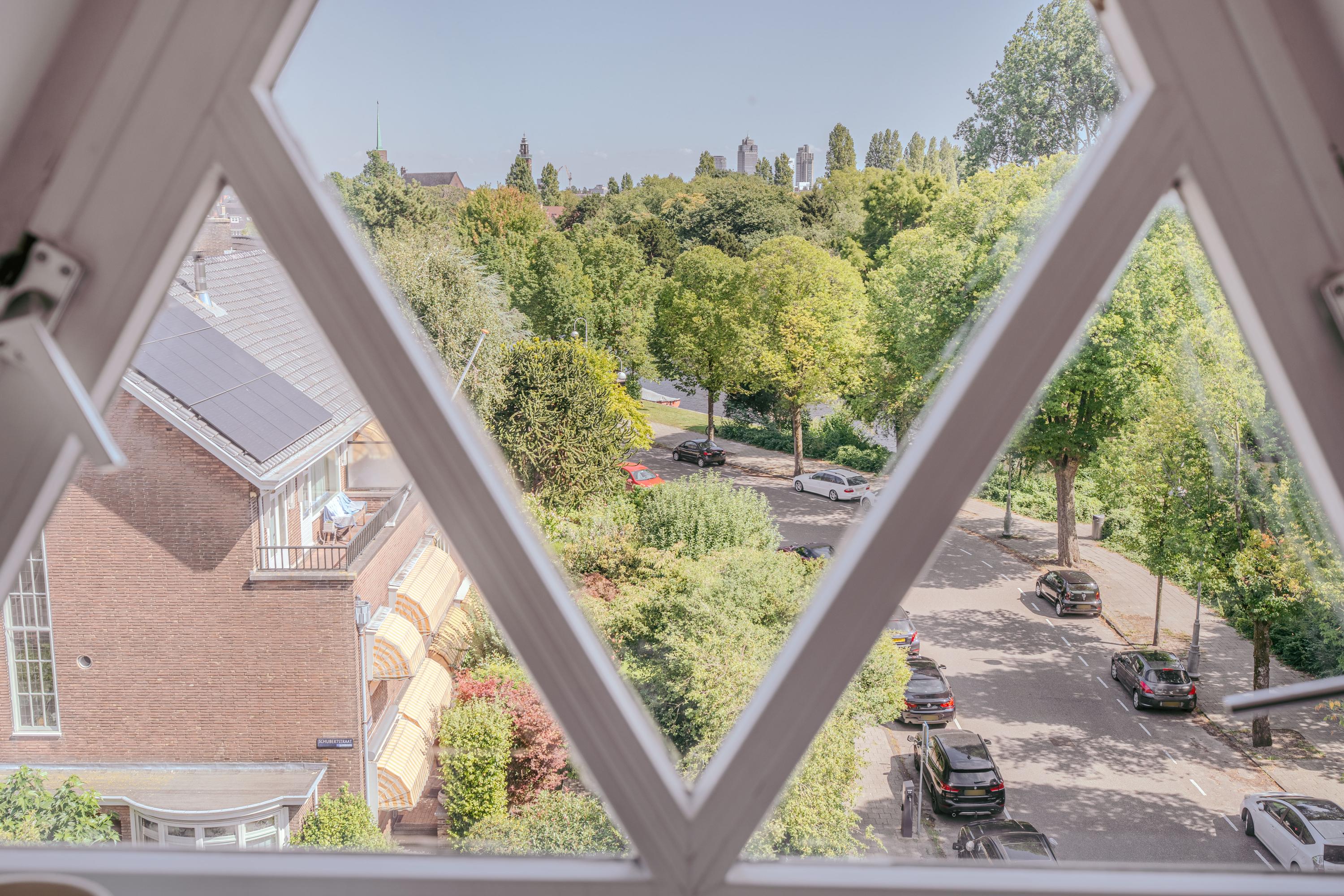 Middels de gemeenschappelijke entree bereikt u de voordeur van het appartement op de derde verdieping. Vanuit de royale hal loopt u direct door naar de centraal gelegen open keuken. Deze is uitgerust met een inductiekookplaat, afzuigkap spoelbak, Quooker, is voorzien van meer dan genoeg bergruimte en beschikt over een gezellige bar welke daarmee het hart vormt van de leefverdieping. Aansluitend de riante woonkamer, een sfeervolle ruimte met grote raampartijen en een karakteristieke erker, waardoor er veel daglicht binnenvalt en u een prachtig uitzicht geniet over het water en het Beatrixpark. Twee schouwen geven de ruimte extra allure, terwijl de handige inbouwkasten zorgen voor praktische bergruimte. De originele glas-in-lood details in de deuren benadrukken de authentieke charme van het appartement. Aan de voor en achterzijde bevinden zich twee ruime slaapkamers, waarvan één uitstekend dienst kan doen als masterbedroom en de andere als logeer- of werkkamer. De badkamer is functioneel ingericht met een ligbad, douche en dubbele wastafel. In de hal is een separaat toilet aanwezig.