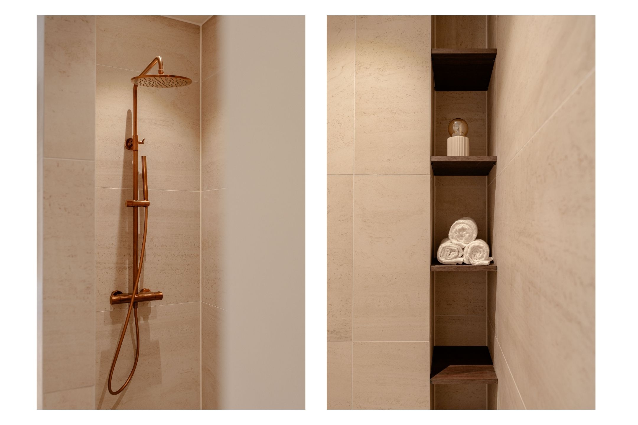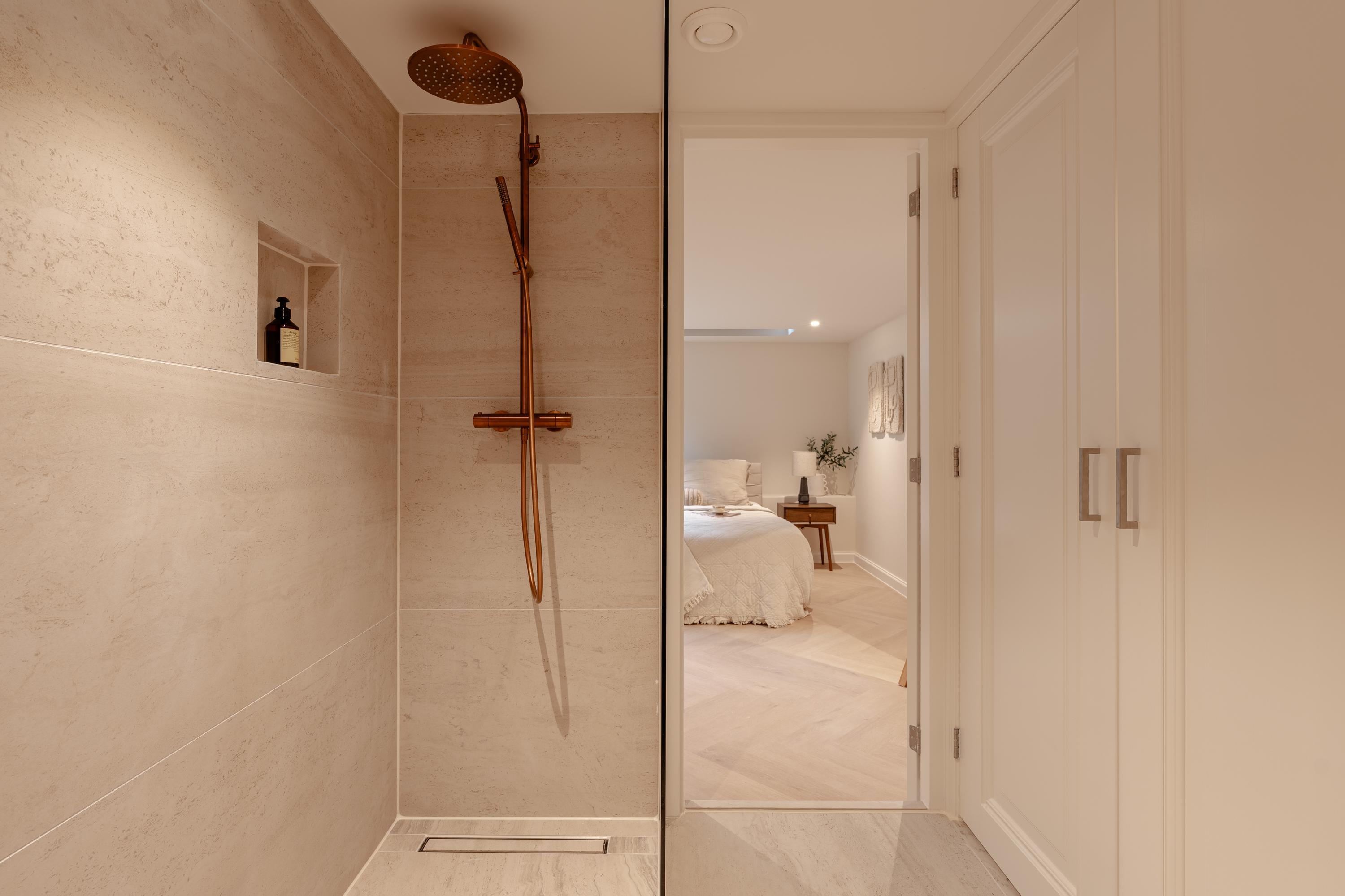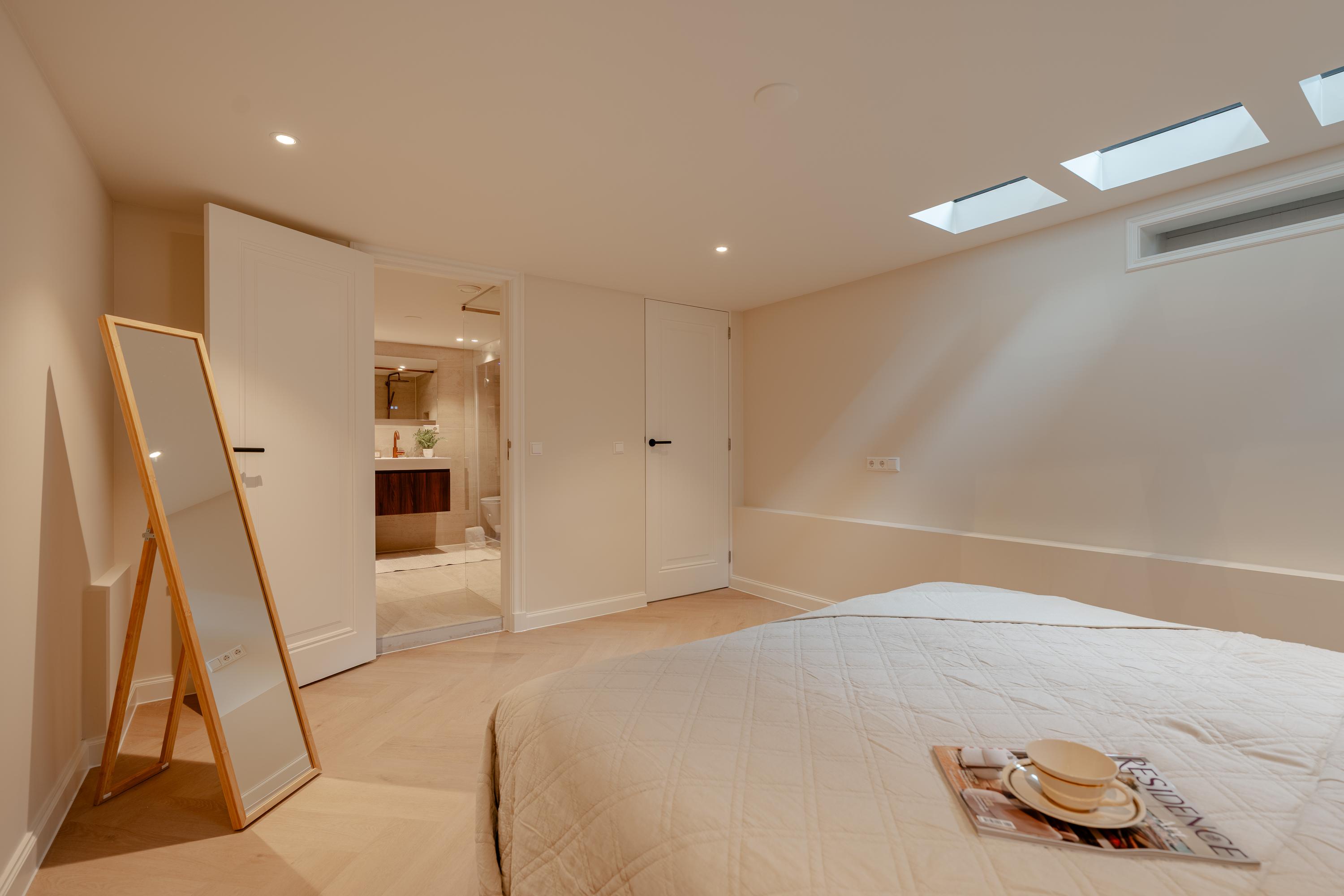 Middels de trap in de woonkamer bereikt u het souterrain. Dankzij de koekoeken is deze verdieping opvallend licht. Hier bevindt zich een ruime slaapkamer met een luxe ensuite badkamer, uitgerust met een inloopdouche, wastafel, toilet en een sauna. De rustige en intieme sfeer maakt dit een ideale ruimte voor gasten of als privé retreat.