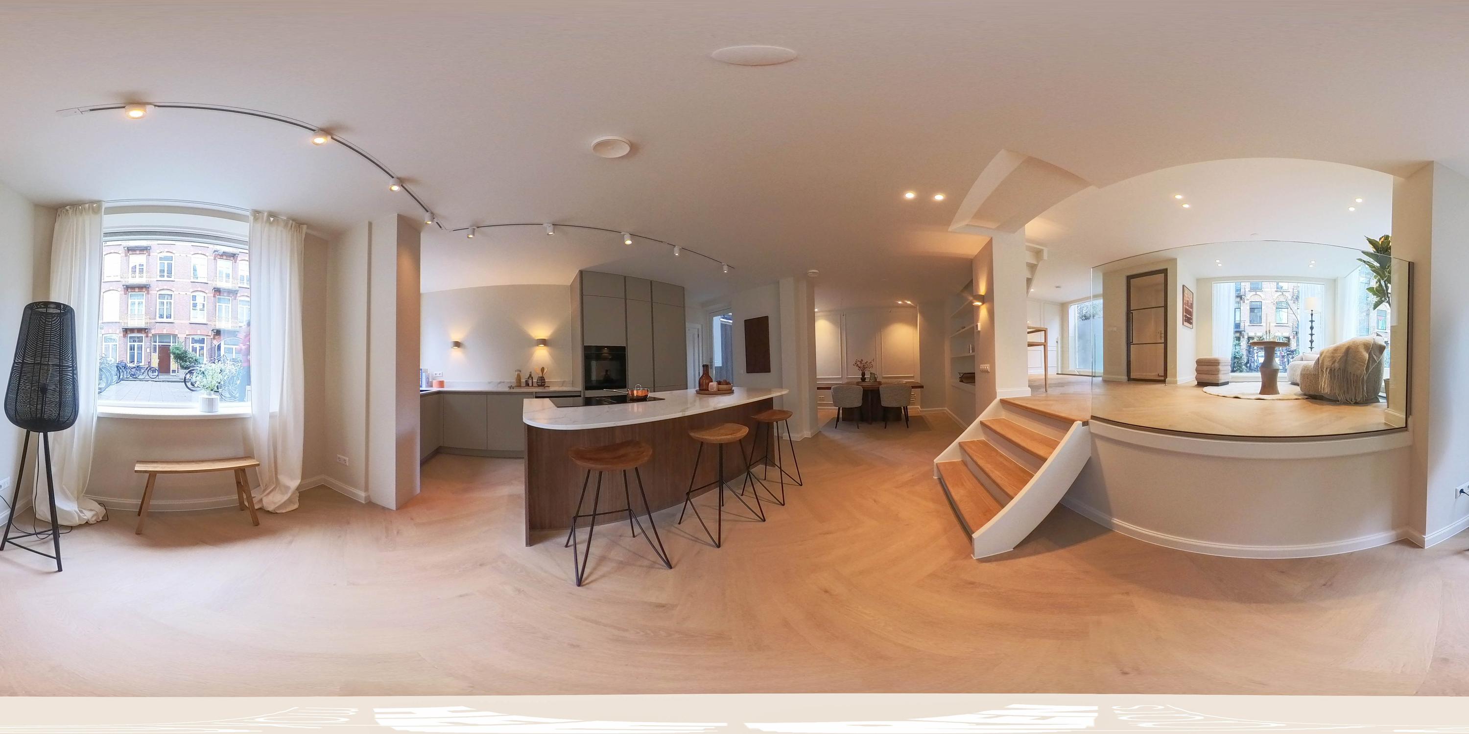 Middels eigen entree aan de straatzijden en een stalen-look tochtportaal bereikt u het leefgedeelte van de woning, de woonkamer, waar grote raampartijen zorgen voor een fijne lichtinval en een prettige connectie met de omgeving. Aan de achterzijde van de woning ligt de royale woonkeuken, welke u middels een paar treden naar beneden bereikt. Een charmant hoogteverschil dat direct voor sfeer zorgt. De moderne keuken is voorzien van een centraal kookeiland met een rond blad dat elegant doorloopt in een bar. De ruimte is uitgerust met een inductiekookplaat met interne afzuiging, vaatwasser, oven, een volwaardige koelkast én vriezer, een klimaatkast en een spoelbak met Quooker. Dankzij de royale opstelling is er volop ruimte voor koken én gezellig tafelen; de gezellige eetkamernis sluit direct aan op het kookgedeelte. Vanuit de keuken is er toegang tot de achtertuin, gelegen aan de rustige achterzijde, waar voldoende plek is voor ontspannen en buiten eten. Op deze verdieping bevindt zich tevens een separaat toilet.