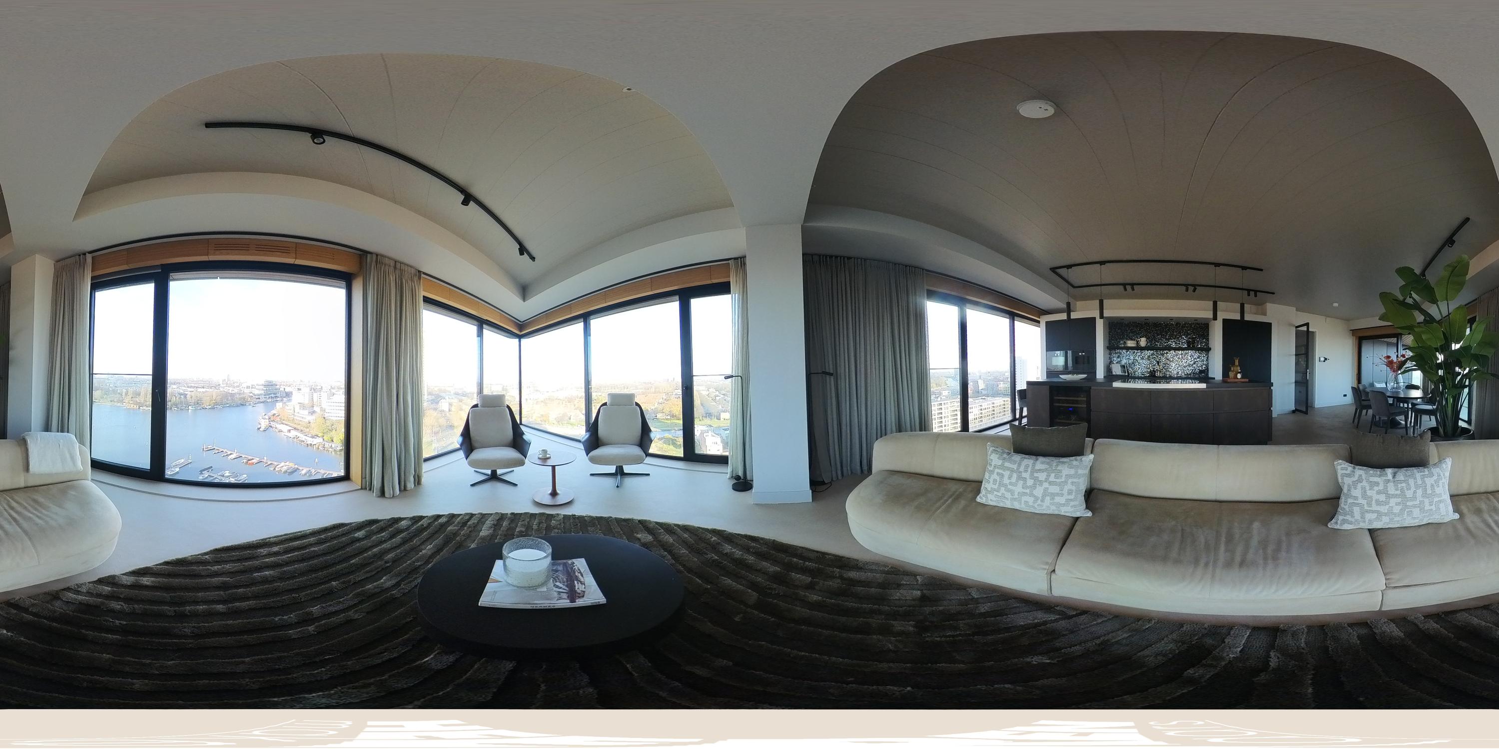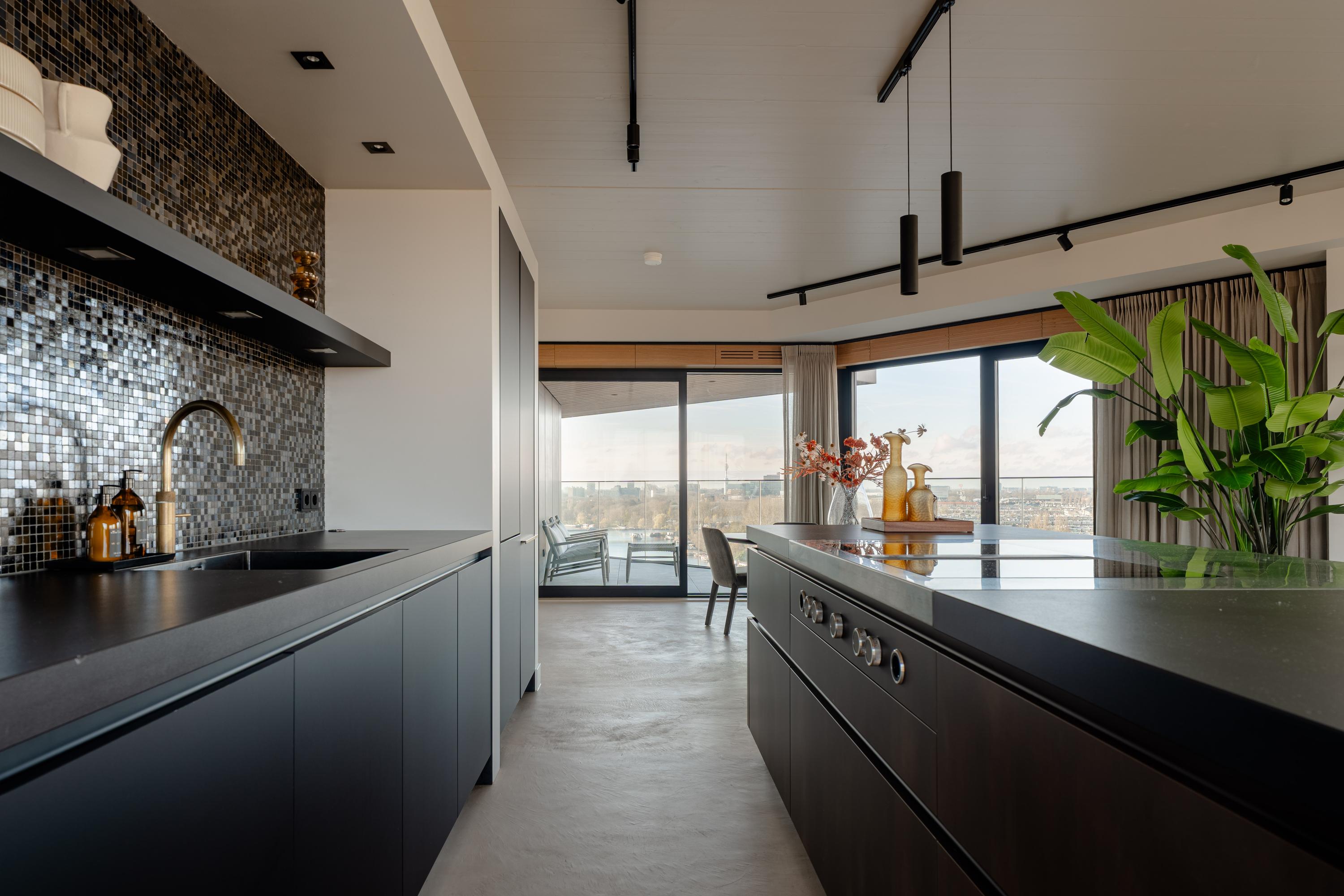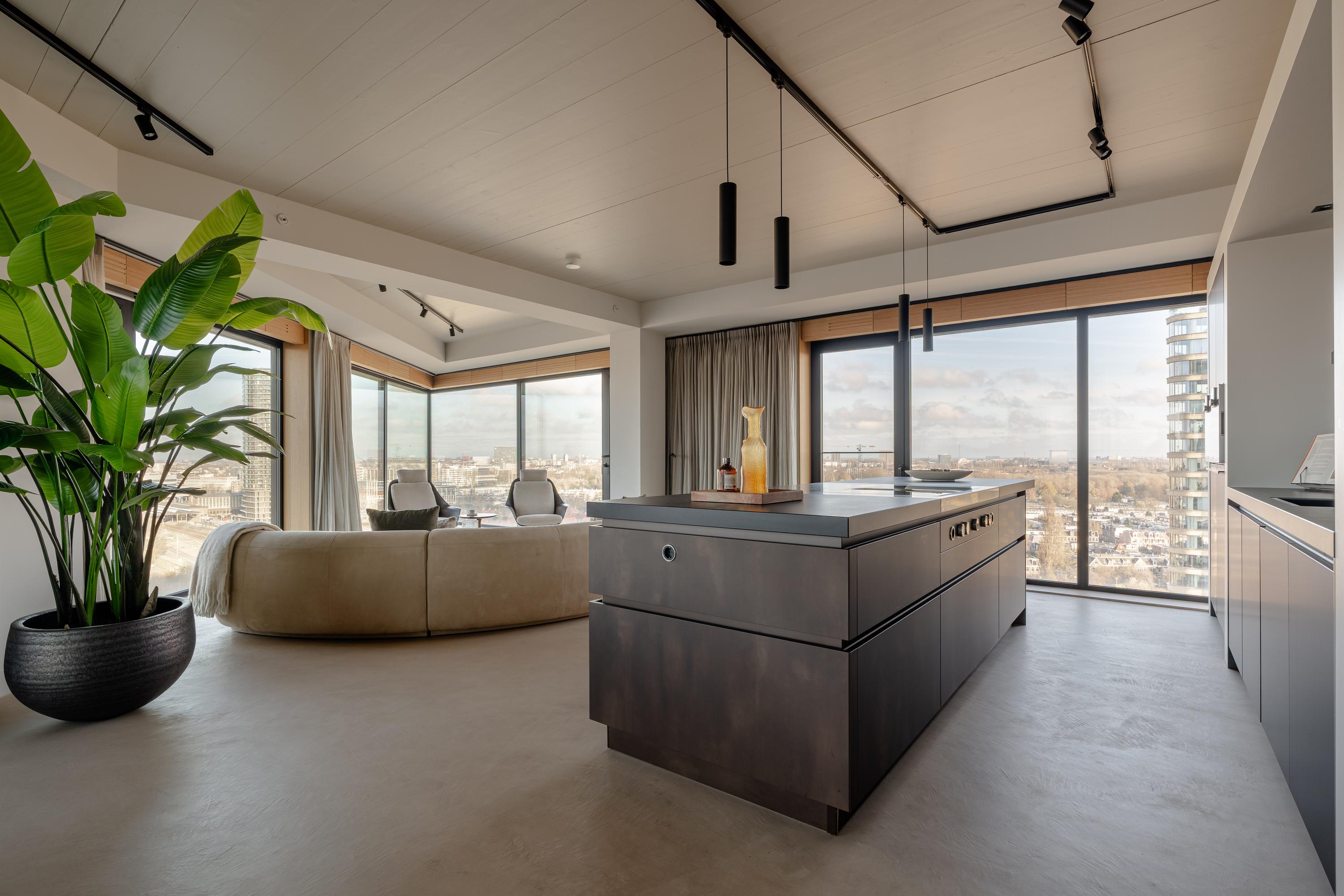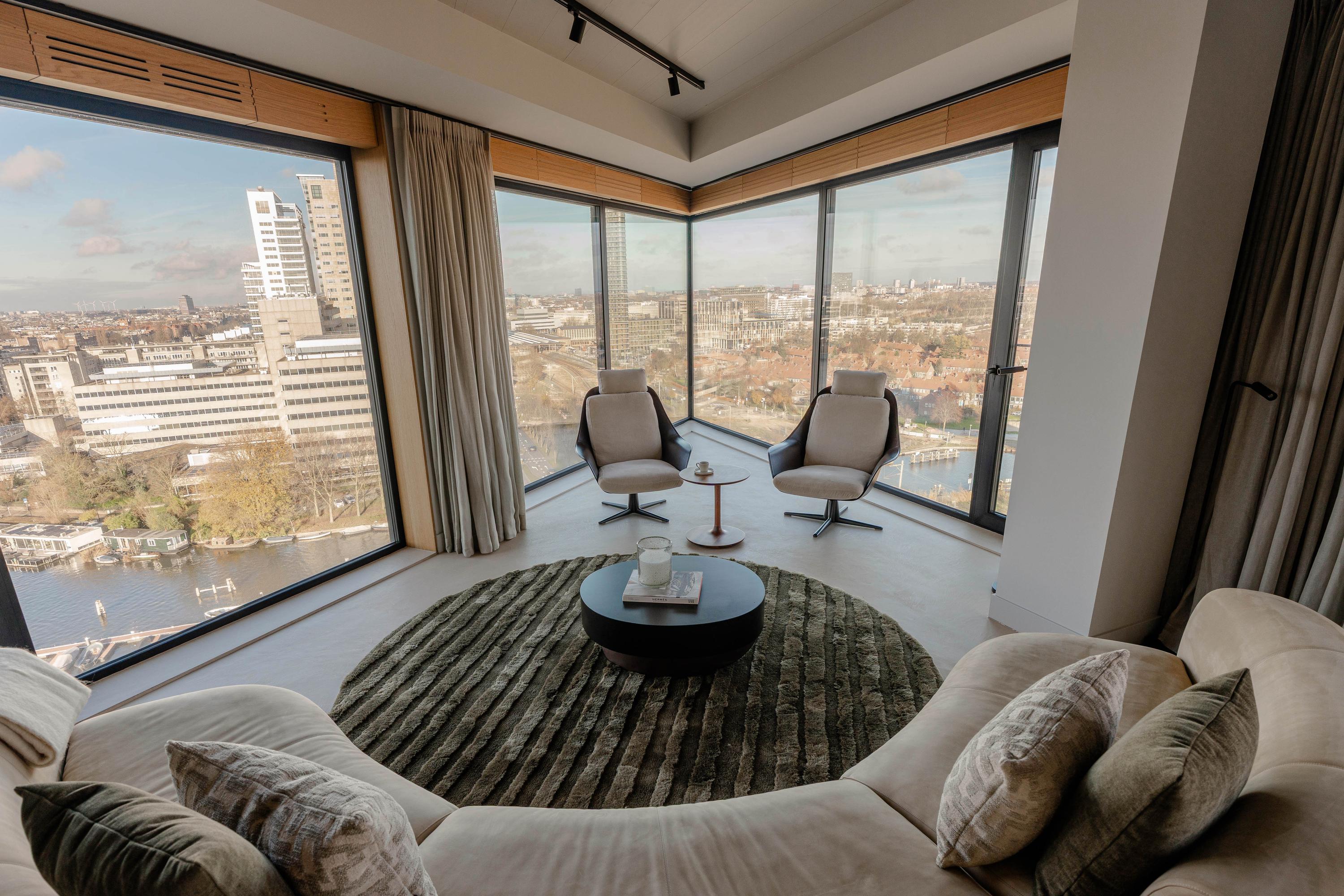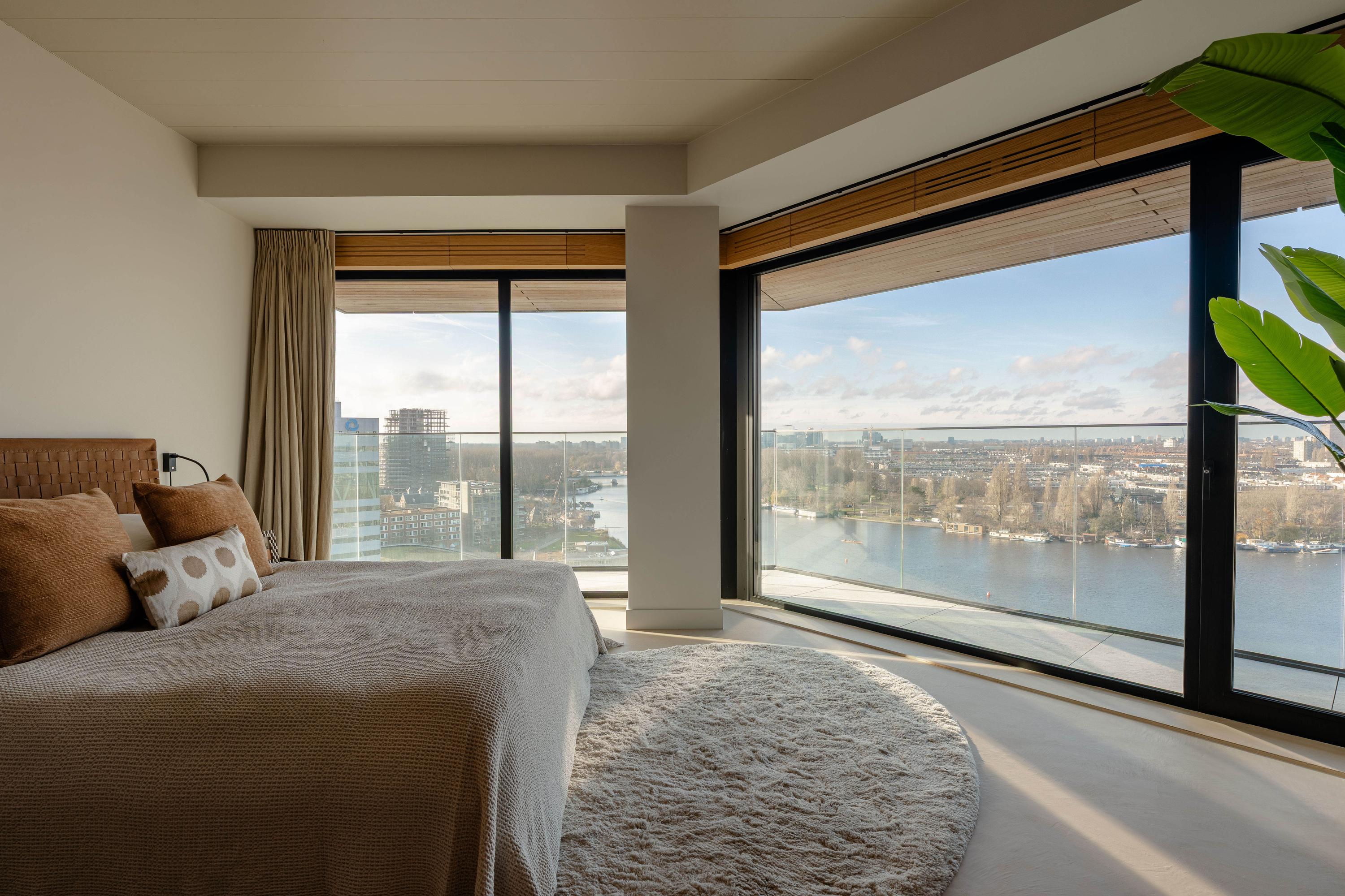 Via de gezamenlijke entree bereikt u het appartement per lift of trap. U komt binnen in een ruime hal die toegang biedt tot vrijwel alle vertrekken van de woning. Vanuit hier bereikt u de royale woonkamer met open keuken, drie slaapkamers, een badkamer en het separate toilet. De woonkamer is bijzonder door haar unieke, driehoekige vorm en de lange raampartijen langs de gevel, die zorgen voor een uitstekende lichtinval en een vrij uitzicht richting de Amstel. De ruimte is royaal opgezet en biedt meer dan voldoende plaats voor een comfortabele zithoek en een grote eettafel. Vanuit de woonkamer is het ruime, overdekte balkon bereikbaar, een heerlijke buitenruimte met een fraai uitzicht over de stad en het water. De open keuken is centraal in de leefruimte gepositioneerd en uitgevoerd in een moderne en strakke stijl. De keuken is voorzien van hoogwaardige inbouwapparatuur, waaronder een inductiekookplaat met geïntegreerde afzuiging, Quooker, klimaatkast, koel-/vriescombinatie, vaatwasser en twee ovens van Gaggenau. Het appartement beschikt over drie goed bemeten slaapkamers. De grootste slaapkamer is voorzien van een en-suite badkamer. Deze luxe badkamer is uitgevoerd met een wastafel met meubel, inloopdouche en toilet. De tweede badkamer is bereikbaar vanuit de hal en beschikt over een inloopdouche, dubbele wastafel en lichte afwerking. Daarnaast is er een separaat toilet aanwezig.