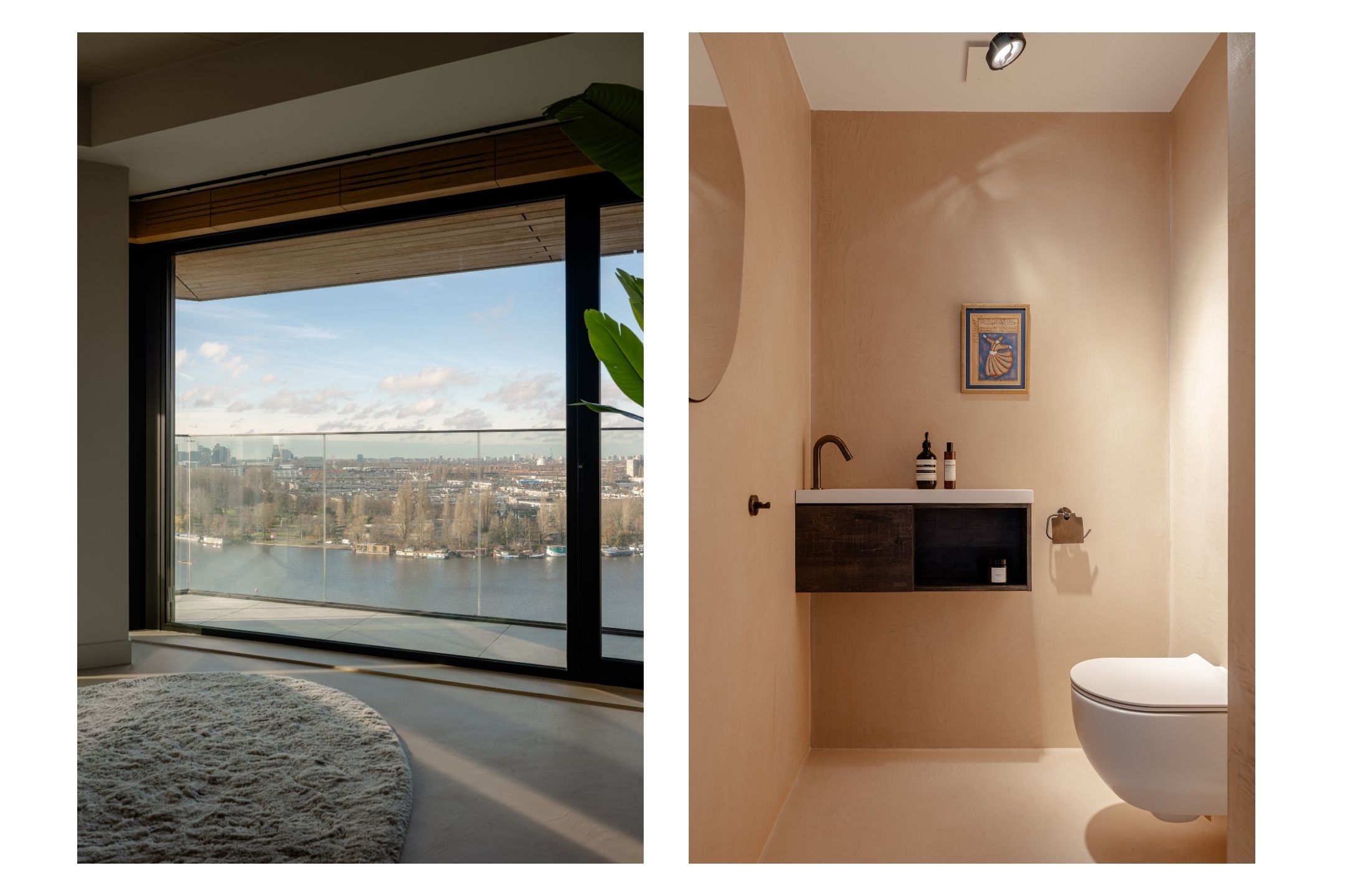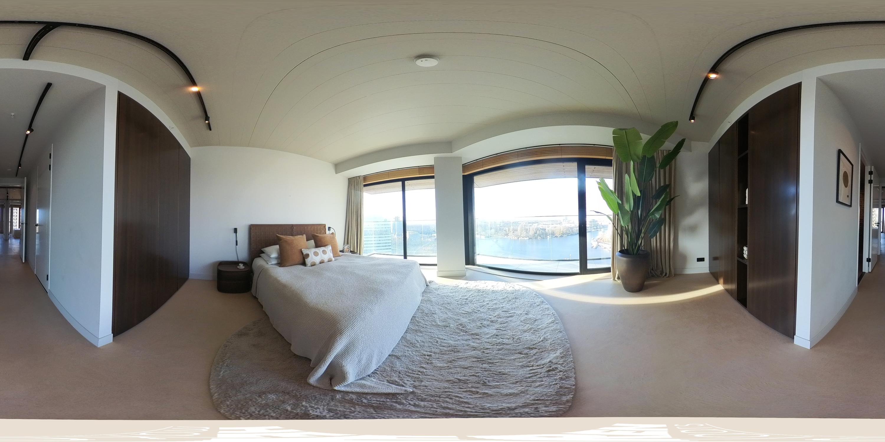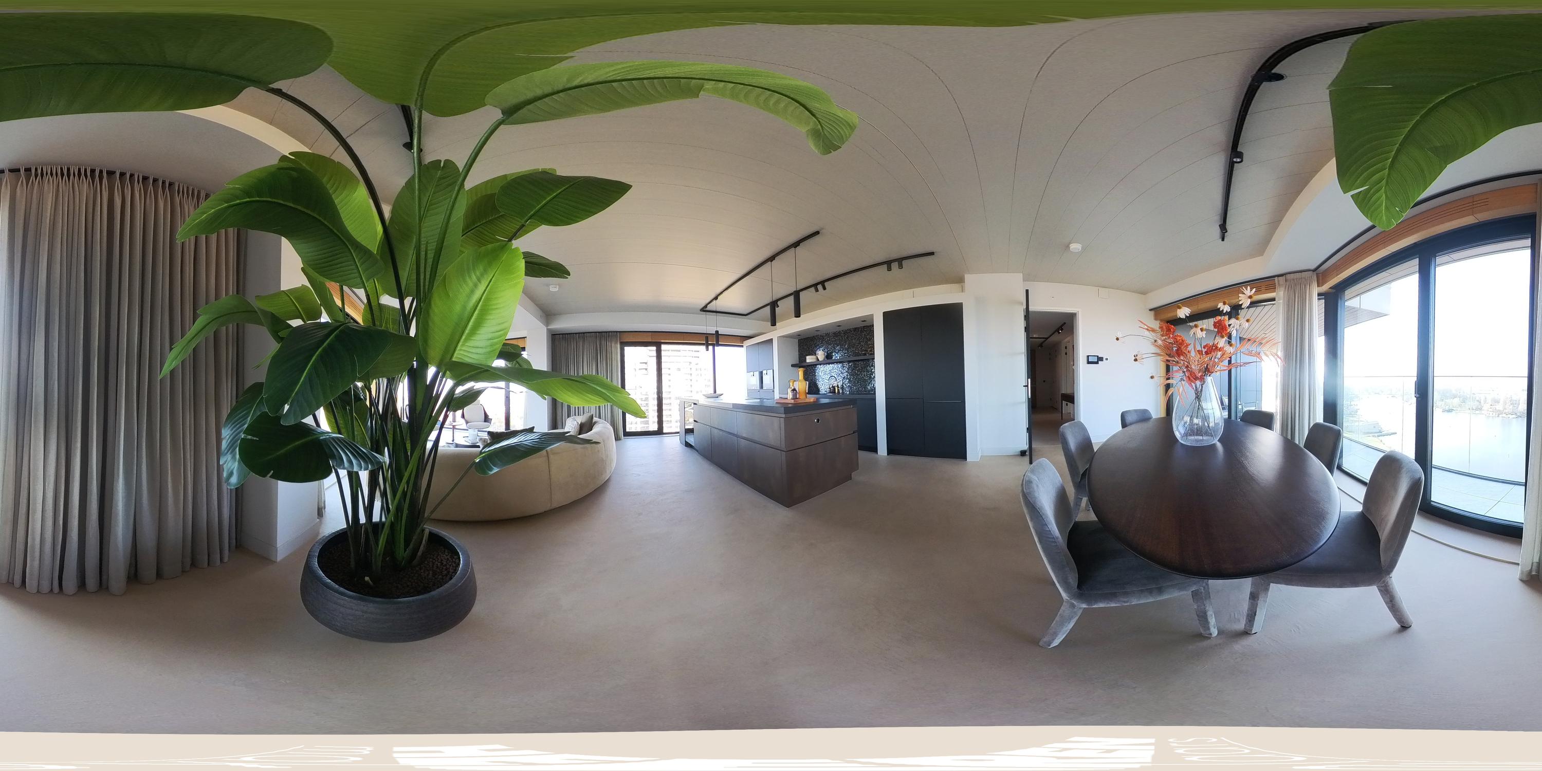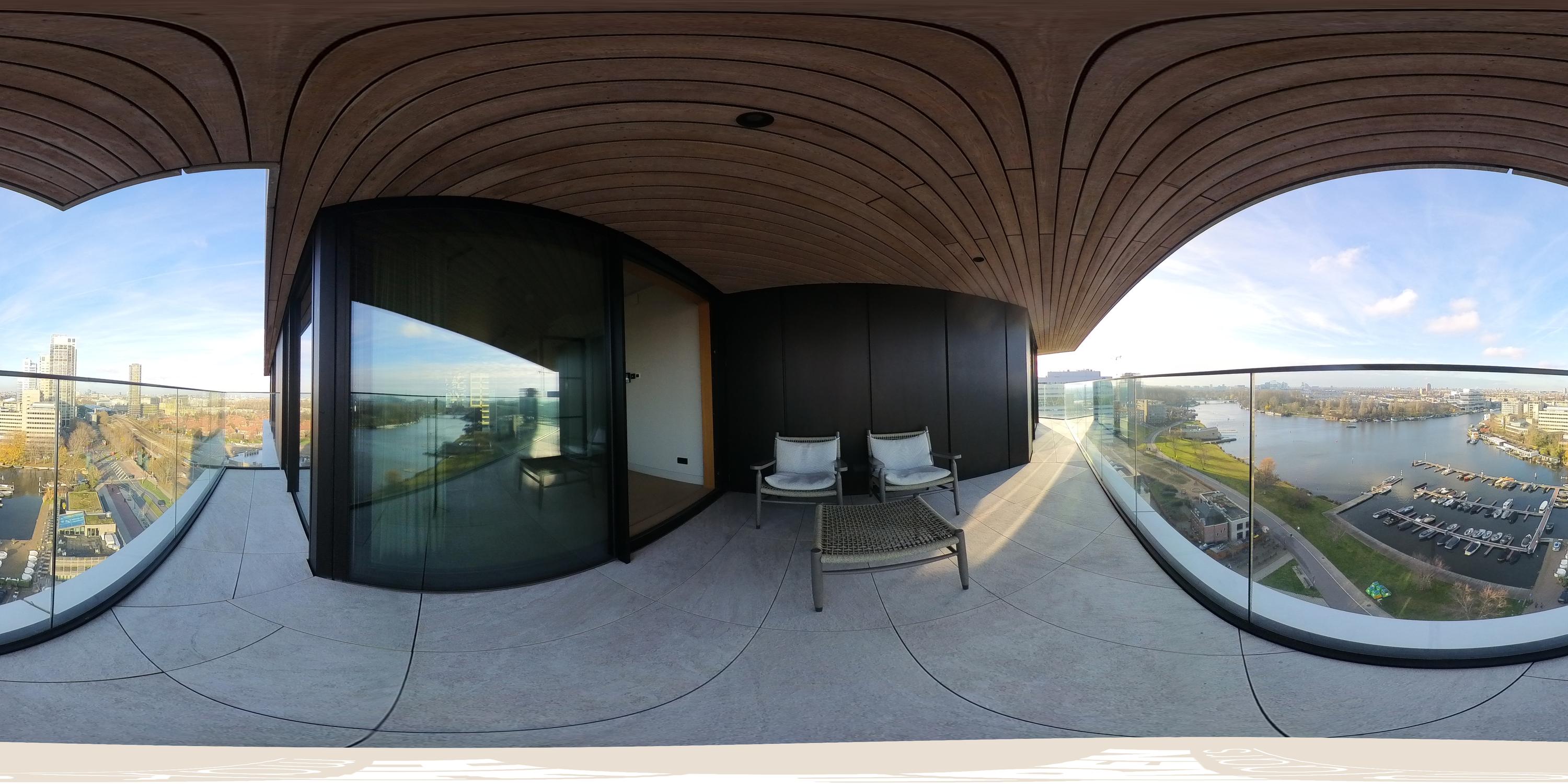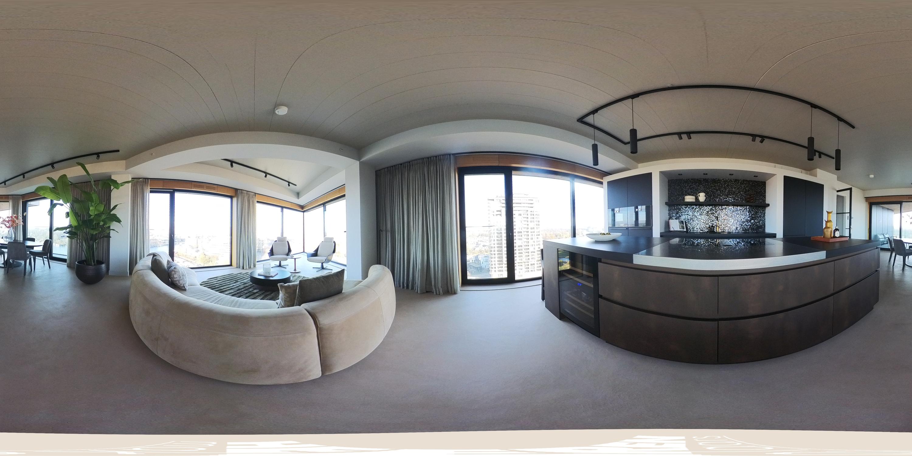 Via de gezamenlijke entree bereikt u het appartement per lift of trap. U komt binnen in een ruime hal die toegang biedt tot vrijwel alle vertrekken van de woning. Vanuit hier bereikt u de royale woonkamer met open keuken, drie slaapkamers, een badkamer en het separate toilet. De woonkamer is bijzonder door haar unieke, driehoekige vorm en de lange raampartijen langs de gevel, die zorgen voor een uitstekende lichtinval en een vrij uitzicht richting de Amstel. De ruimte is royaal opgezet en biedt meer dan voldoende plaats voor een comfortabele zithoek en een grote eettafel. Vanuit de woonkamer is het ruime, overdekte balkon bereikbaar, een heerlijke buitenruimte met een fraai uitzicht over de stad en het water. De open keuken is centraal in de leefruimte gepositioneerd en uitgevoerd in een moderne en strakke stijl. De keuken is voorzien van hoogwaardige inbouwapparatuur, waaronder een inductiekookplaat met geïntegreerde afzuiging, Quooker, klimaatkast, koel-/vriescombinatie, vaatwasser en twee ovens van Gaggenau. Het appartement beschikt over drie goed bemeten slaapkamers. De grootste slaapkamer is voorzien van een en-suite badkamer. Deze luxe badkamer is uitgevoerd met een wastafel met meubel, inloopdouche en toilet. De tweede badkamer is bereikbaar vanuit de hal en beschikt over een inloopdouche, dubbele wastafel en lichte afwerking. Daarnaast is er een separaat toilet aanwezig.