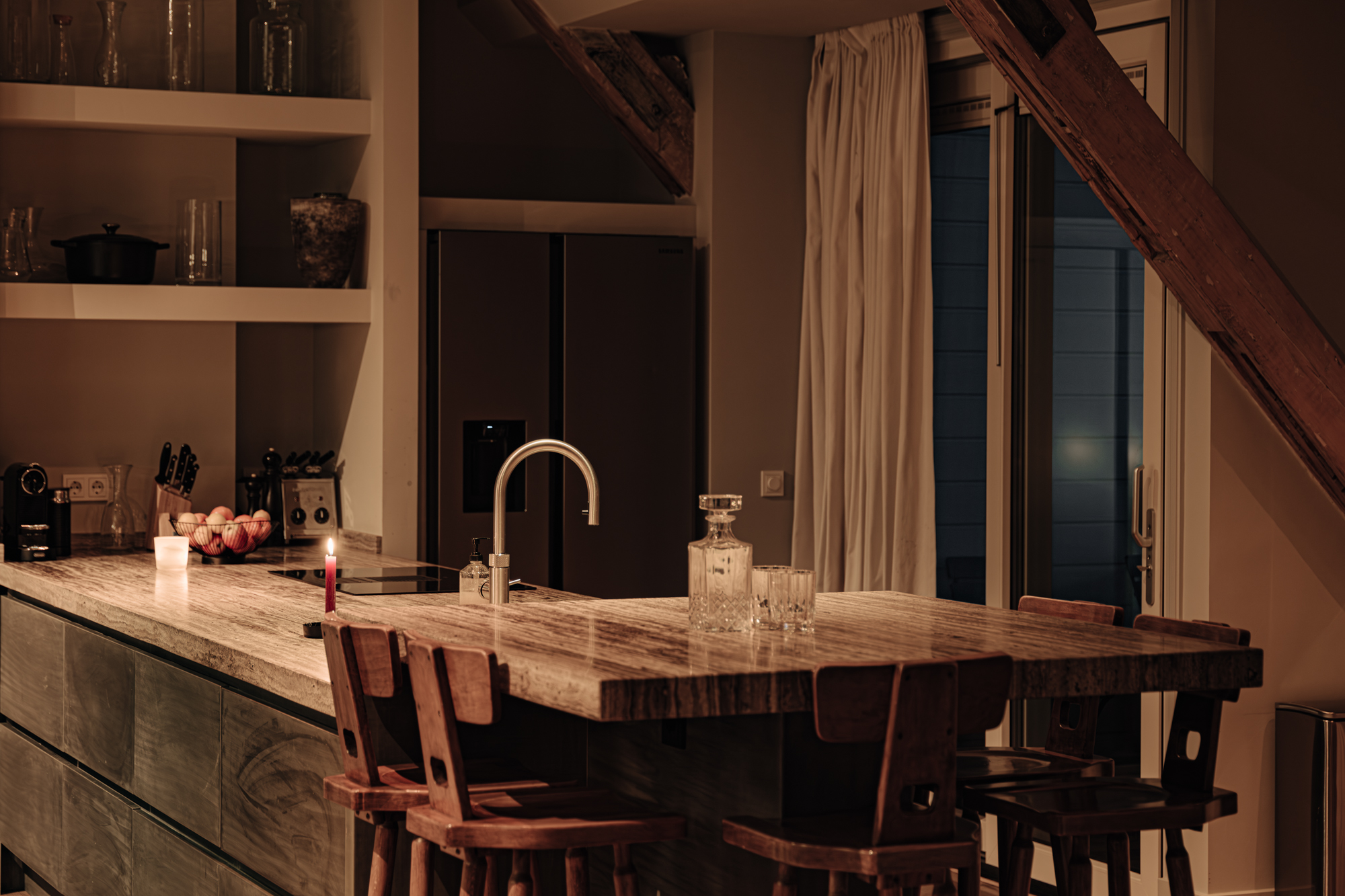 Bij binnenkomst valt direct de ruimtelijke en lichte opzet van de woning op. De woonkamer beschikt over een gezellig balkon gelegen op het zuiden en grote raampartijen aan weerszijden, die zorgen voor veel daglicht en een weids uitzicht over de stad. De zichtbare houten balken geven de ruimte karakter, terwijl het verhoogde zitgedeelte een prettige plek biedt om te ontspannen. Een airco installatie bevindt zich boven de keuken, die is voorzien van een ruim kookeiland met een natuurstenen werkblad en hoogwaardige inbouwapparatuur zoals een 4-pits inductie met afzuiger, een vaatwasser, koel- en vriescombinatie en tot slot een Quooker en een ingebouwde wijnklimaatkast. Een fraai verhoogd bargedeelte bevindt zich haaks aan het kookeiland. De eetruimte biedt plaats aan een grote eettafel die middels de grote raampartijen wederom mooi in het daglicht staat.