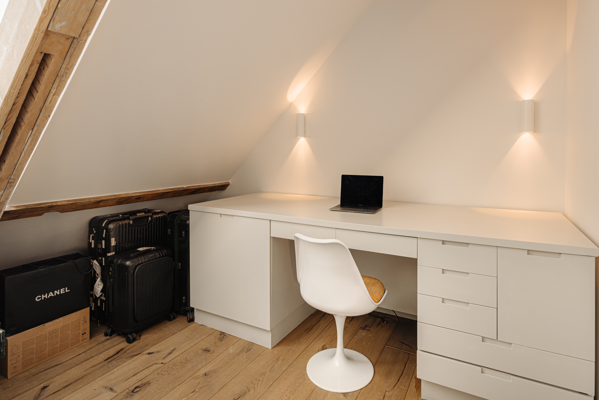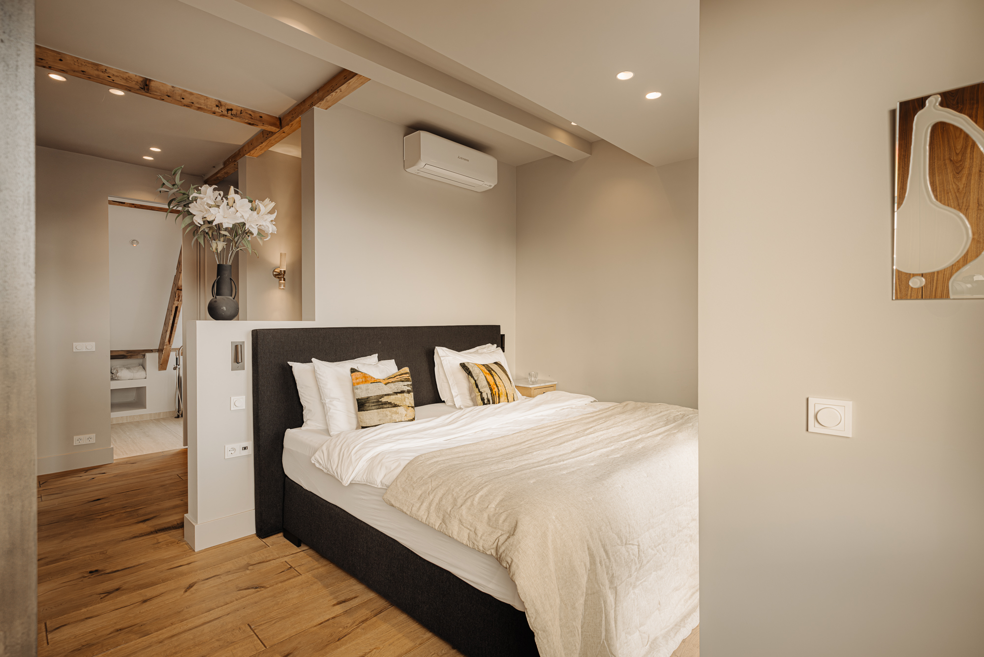 Het penthouse beschikt over drie ruime slaapkamers, twee daarvan voorzien van op maat gemaakte inbouwkasten en een airco installatie. De master bedroom beschikt over een balkon gelegen op het zuiden en een en-suite badkamer, uitgerust met een vrijstaand bad, een inloopdouche en een dubbele wastafel met meubel. Om de hoek vindt u nog een fraaie make-up tafel en een separaat toilet met fontein.