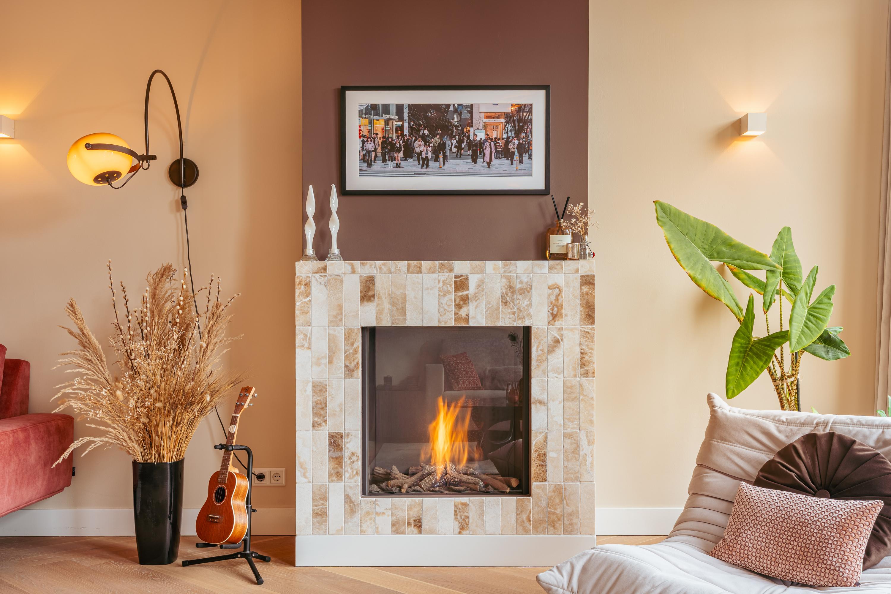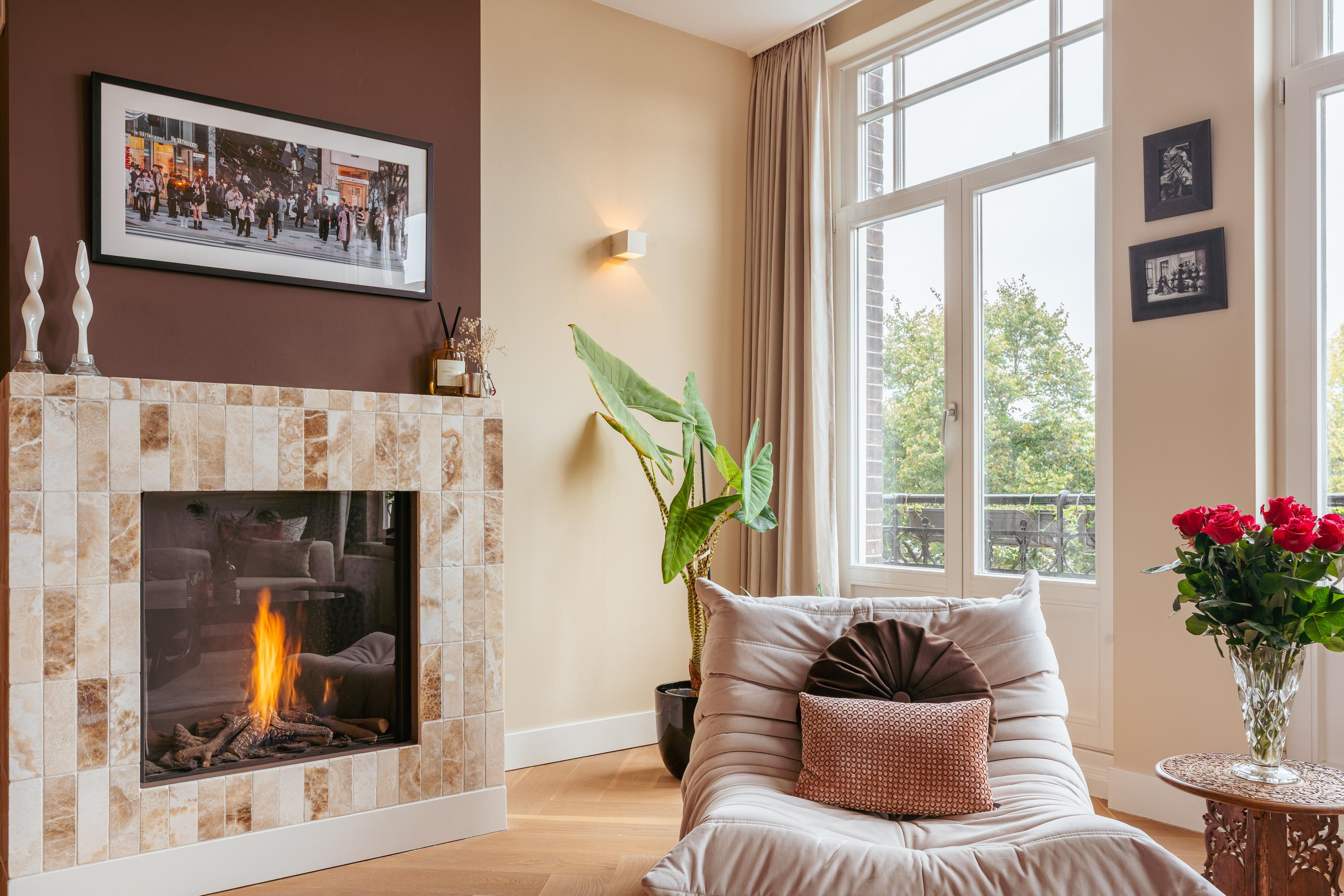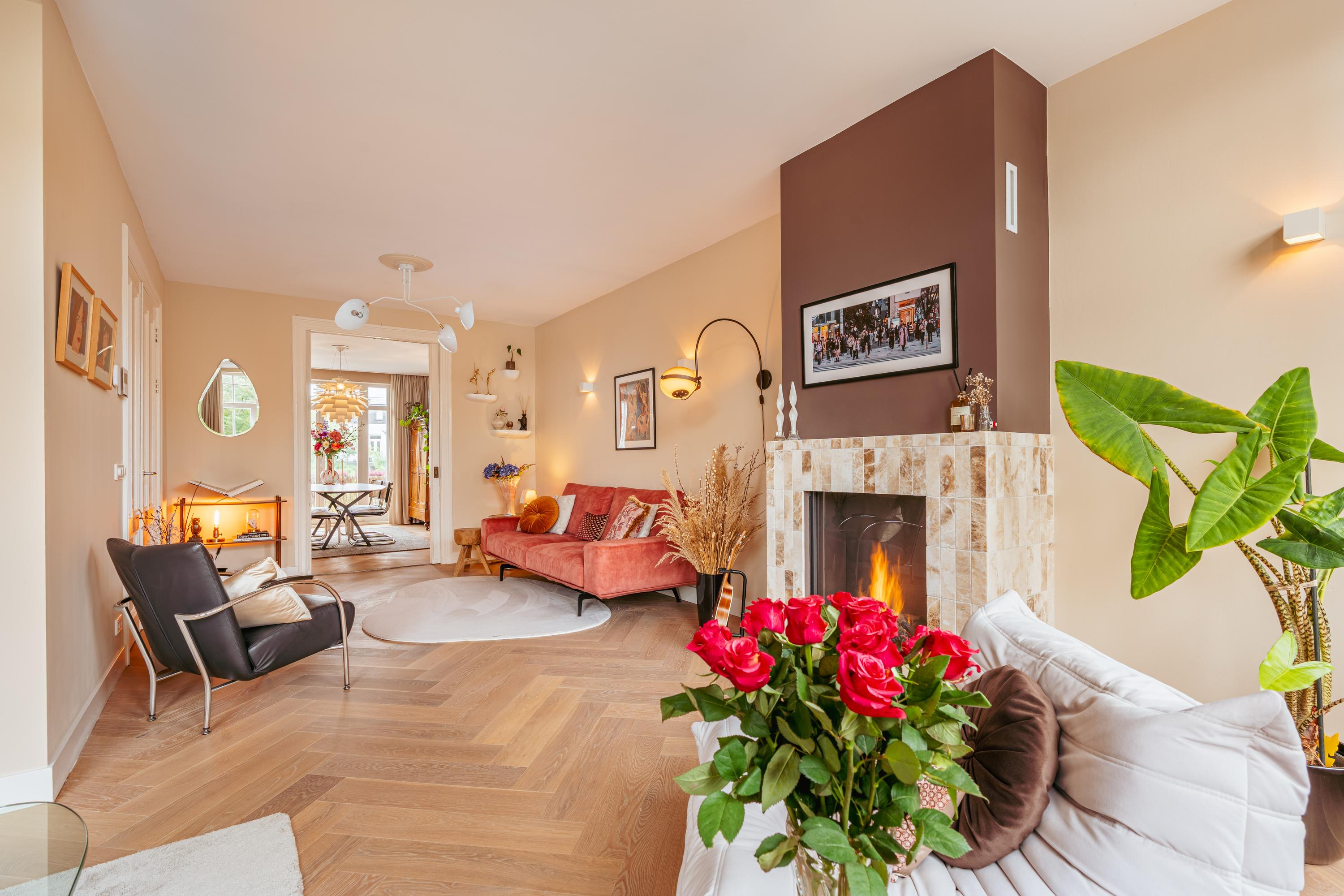 De woonkamer strekt zich uit over de gehele breedte en beschikt over grote raampartijen en dubbele openslaande deuren naar het balkon aan de voorzijde, waar u de avondzon treft. Dankzij de twee ruime zitgedeeltes is er volop plek om te ontspannen en gasten te ontvangen. Een sfeervolle gashaard, originele inbouwkasten, hoge plafonds en de fraaie visgraat houten vloer geven de ruimte karakter en warmte.