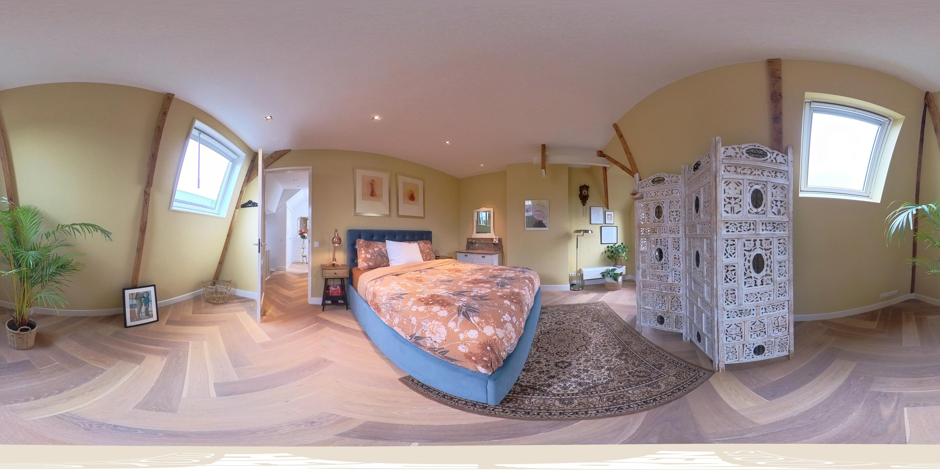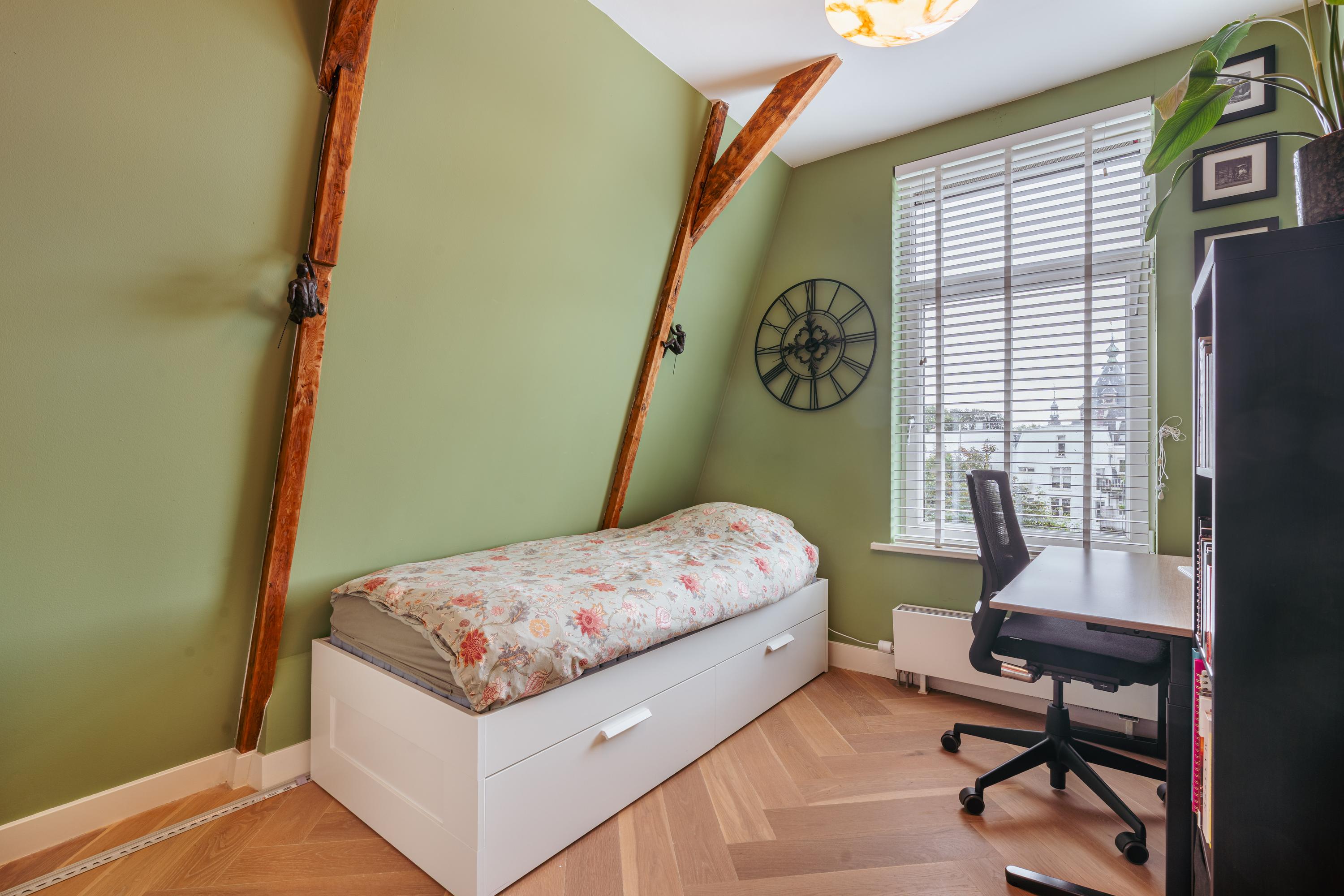 Aan de voorzijde bevindt zich de royale master bedroom, uitgevoerd in warme tinten en voorzien van karakteristieke houten balken. Dankzij het charmante boograam en de dakkapellen valt er veel licht naar binnen en is er een prachtig uitzicht op Artis. De kamer biedt ruimte voor een groot tweepersoonsbed, een garderobekast en een zit- of werkhoek.