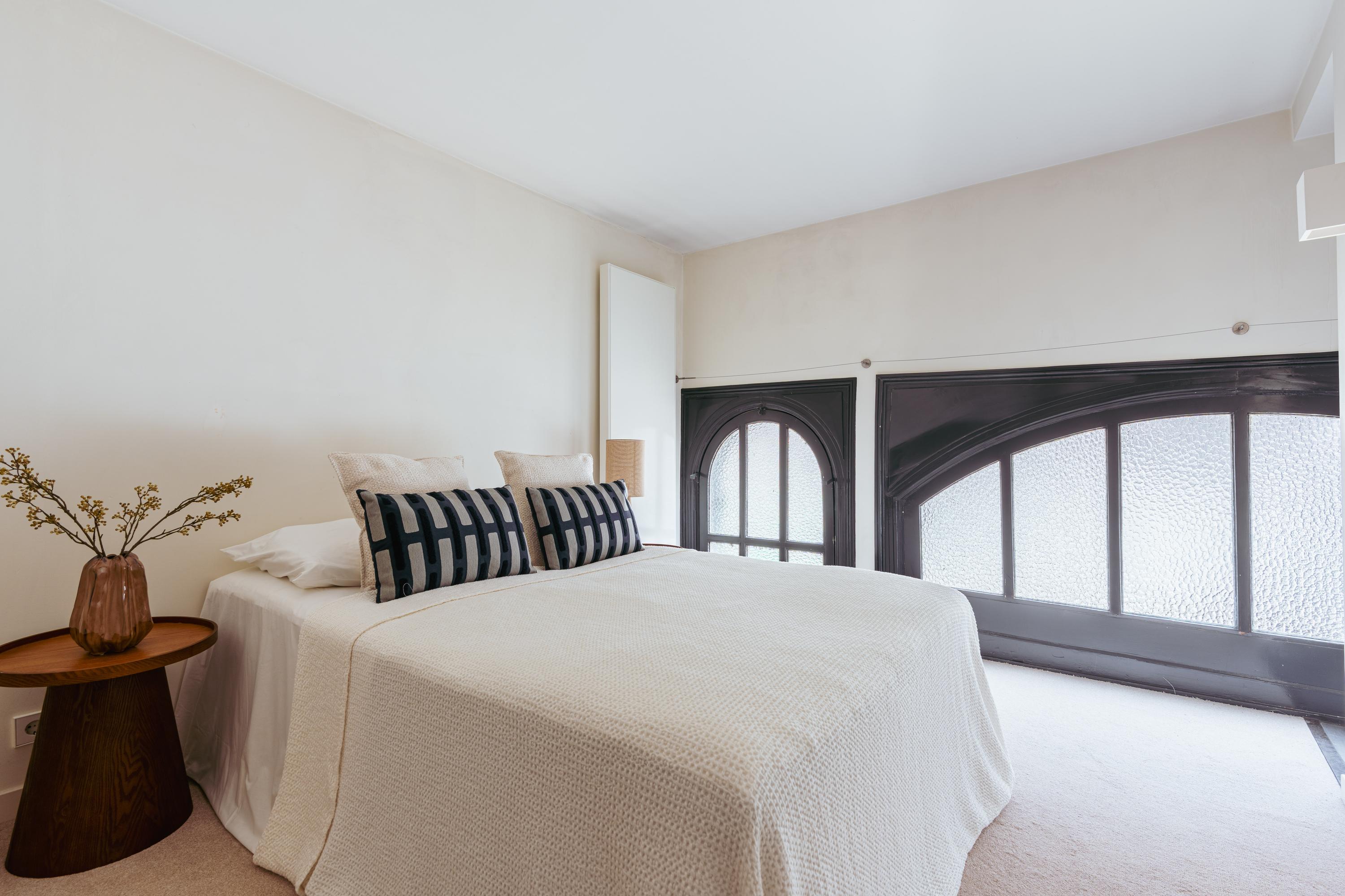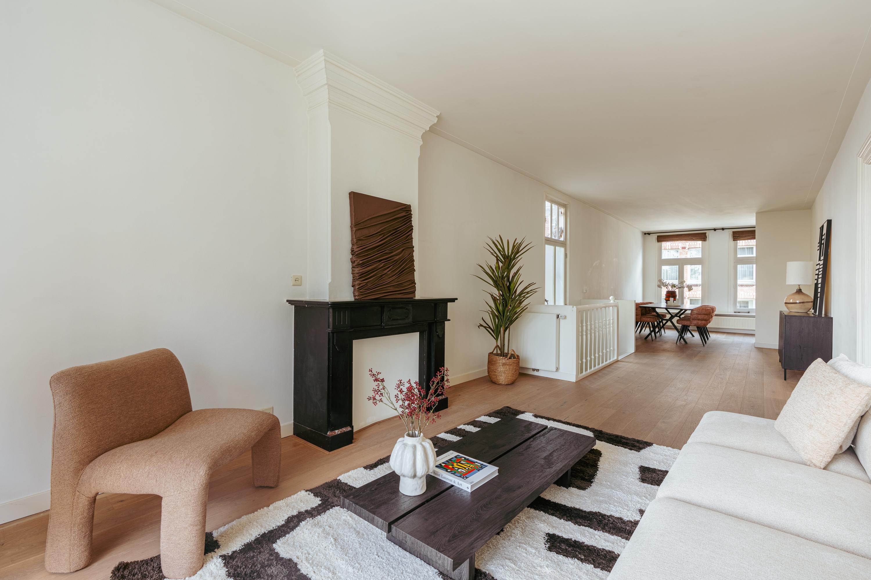 De woning is toegankelijk via zowel de eerste als de tweede verdieping. Op de tweede verdieping bevindt zich de royale doorzonwoonkamer, die dankzij de grote raampartijen aan beide zijden baadt in natuurlijk licht. De ruimte biedt volop plaats voor een comfortabele zithoek én een royaal eetgedeelte met een grote eettafel. De sfeervolle schouw vormt hierbij een charmant middelpunt. Aan de voorzijde ligt de moderne open keuken, voorzien van luxe inbouwapparatuur, waaronder een 4-pits gasfornuis met afzuigkap, een oven, vaatwasser en een koel- en vriescombinatie. Aan de achterzijde vindt u de eerste slaapkamer, ideaal te gebruiken als werkkamer of logeerkamer. Via openslaande deuren bereikt u het zonnige balkon van circa 7 m², dat zich over de volle breedte van de woning uitstrekt en op het zuidwesten is gelegen – perfect voor een middagzon. Vanuit de hal is tevens een separaat toilet bereikbaar.