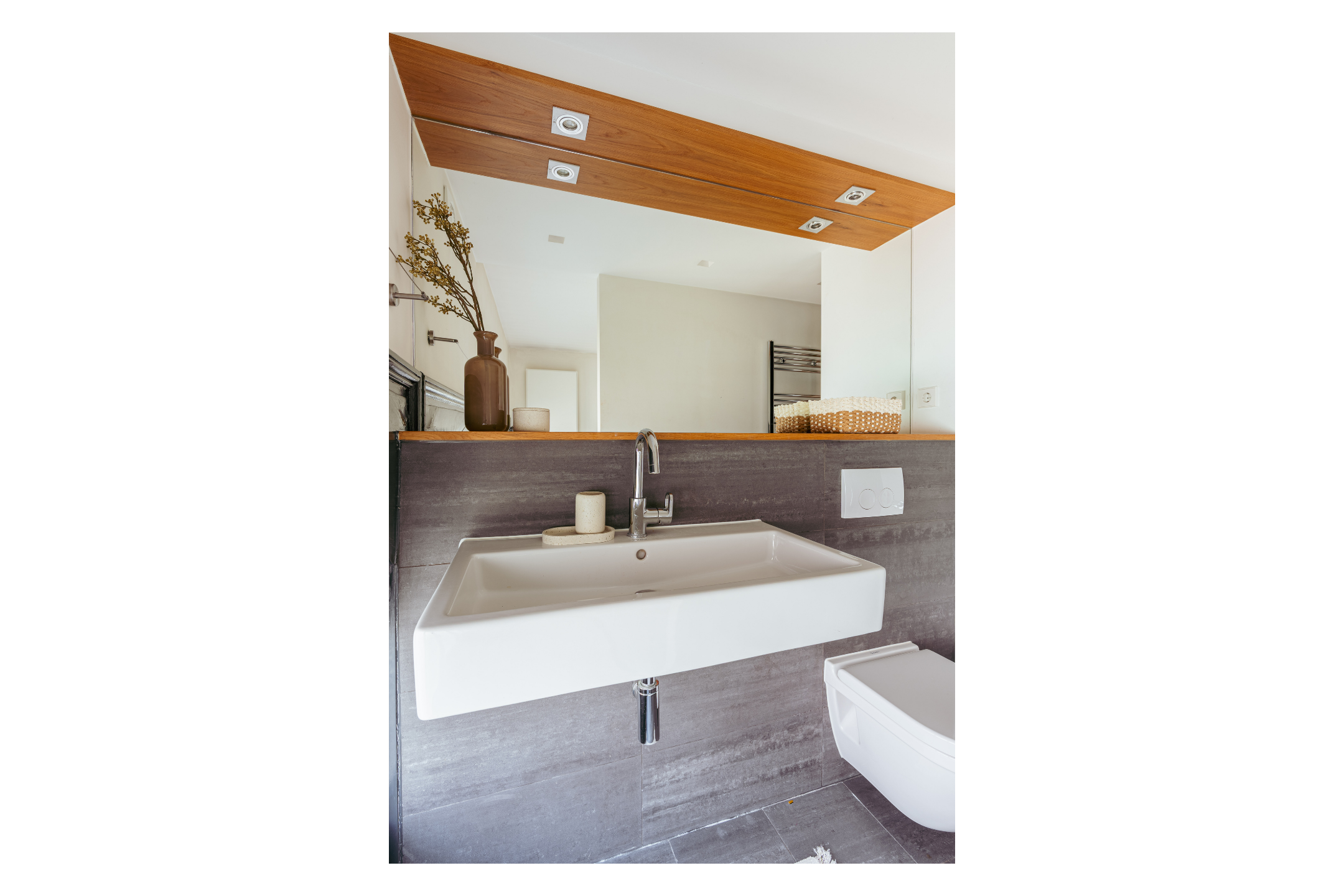 Via de open trap in de woonkamer loopt u naar de eerste verdieping, die eveneens een eigen entree heeft via het gemeenschappelijke trappenhuis. De ruime hal biedt voldoende plek voor een garderobe en extra kastruimte. Hier bevindt zich ook de eerste badkamer, uitgerust met een inloopdouche, wastafelmeubel en een separaat toilet met fontein. Aan de voorzijde ligt de royale master bedroom, voorzien van inbouwkasten, grote ramen en een en-suite badkamer met inloopdouche, wastafel en toilet. Aan de achterzijde bevindt zich de derde, goed bemeten slaapkamer met op maat gemaakte kasten en openslaande deuren naar het tweede balkon. Aangrenzend vindt u de wasruimte met gootsteen, die eveneens toegang biedt tot het balkon.