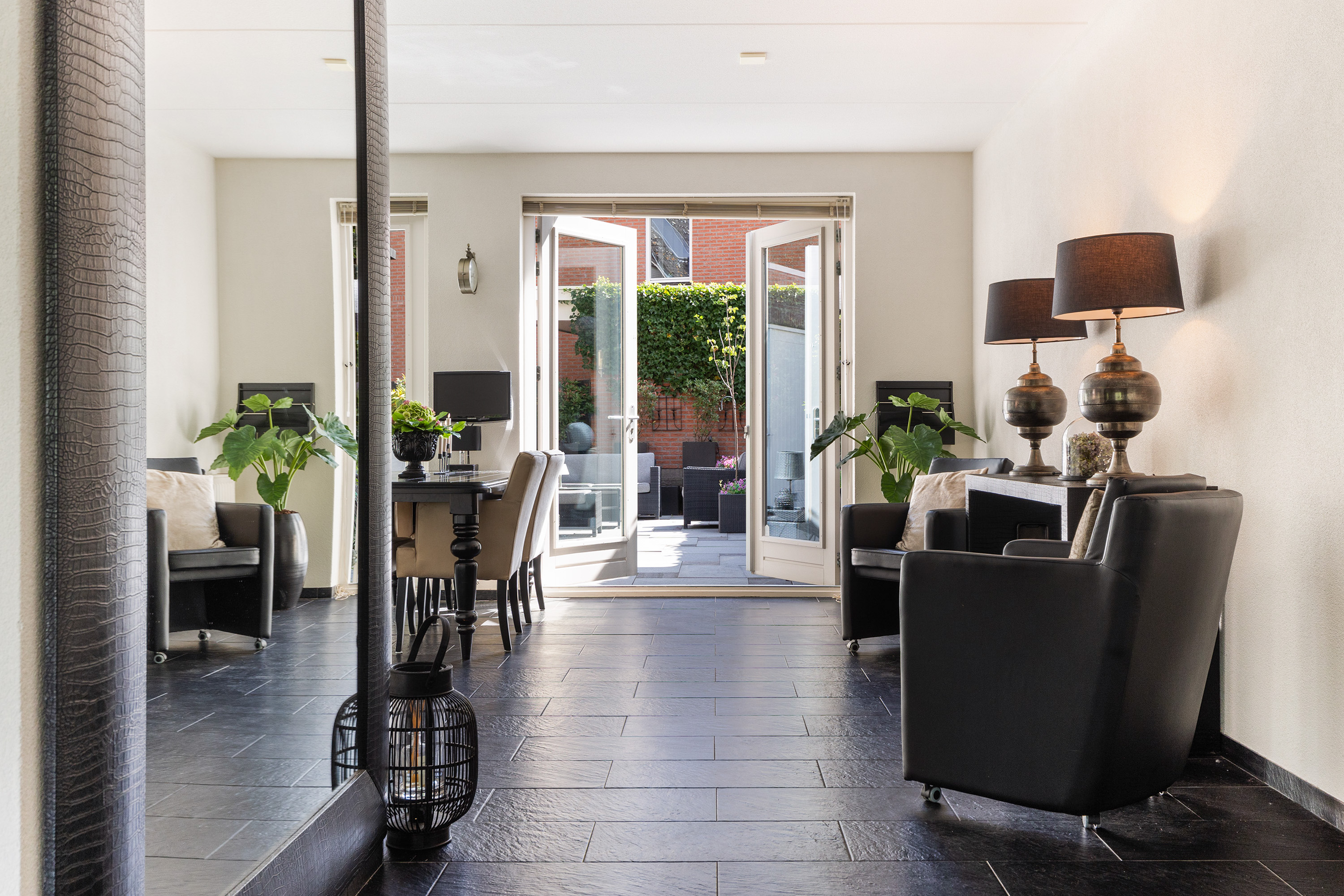 De onderhoudsvriendelijke achtertuin is fraai aangelegd met terrastegels, groen en sfeervolle verlichting. Door de ligging op het zuidwesten geniet u hier van de zon van ’s ochtends vroeg tot in de avond. De royale garage zorgt voor veel praktische ruimte – en de oprit biedt plek voor meerdere auto’s.