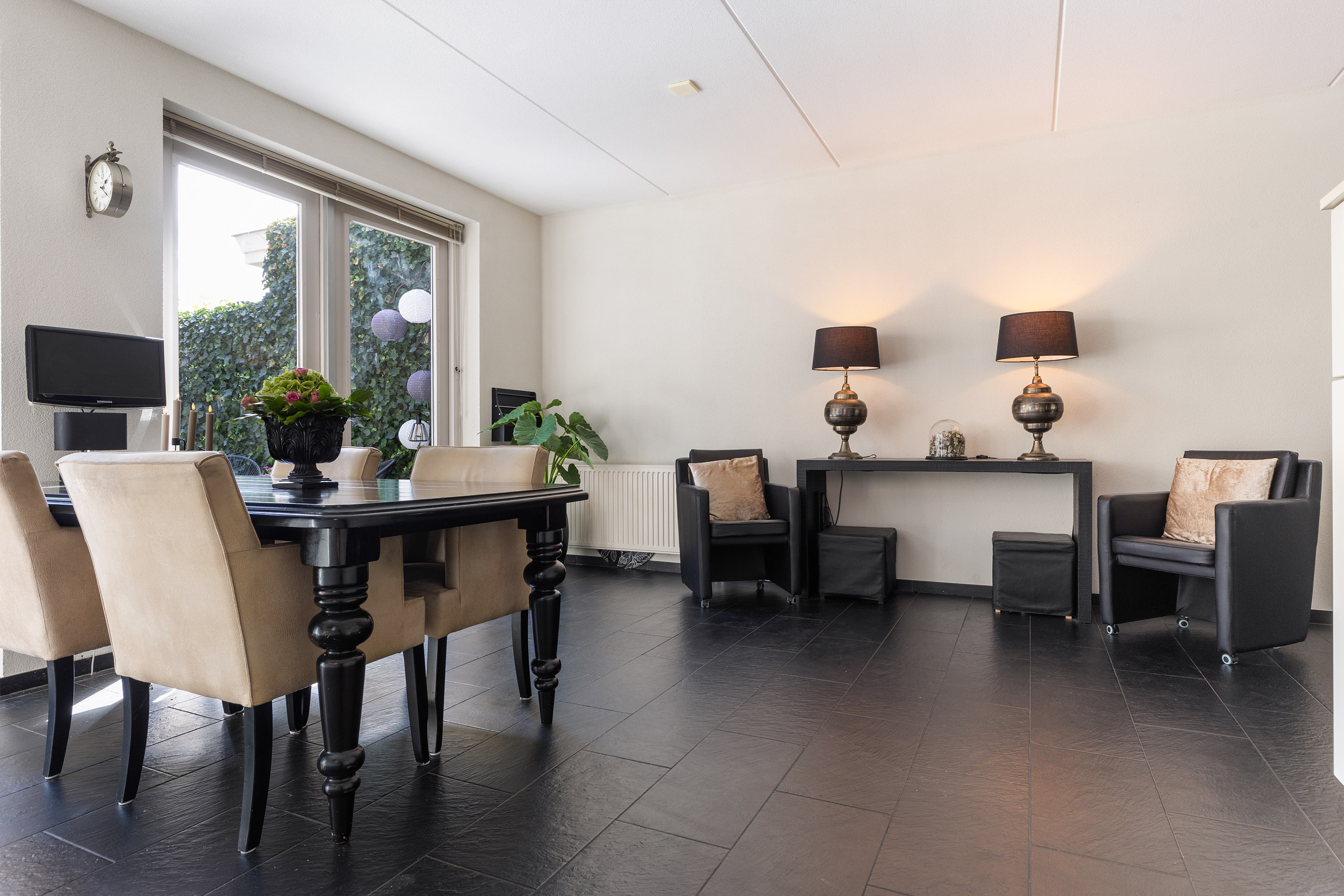 De lichte woonkamer met karakteristieke erker en stijlvolle gashaard vormt het hart van het huis. Dankzij de royale opzet en de vele raampartijen is dit een aangename plek om samen te zijn. Vanuit de woonkamer loopt u door naar de ruime woonkeuken (ca. 26 m²), waar plaats is voor een grote eettafel. De keuken is voorzien van diverse inbouwapparatuur en heeft openslaande deuren naar de tuin – ideaal om binnen en buiten naadloos met elkaar te verbinden.