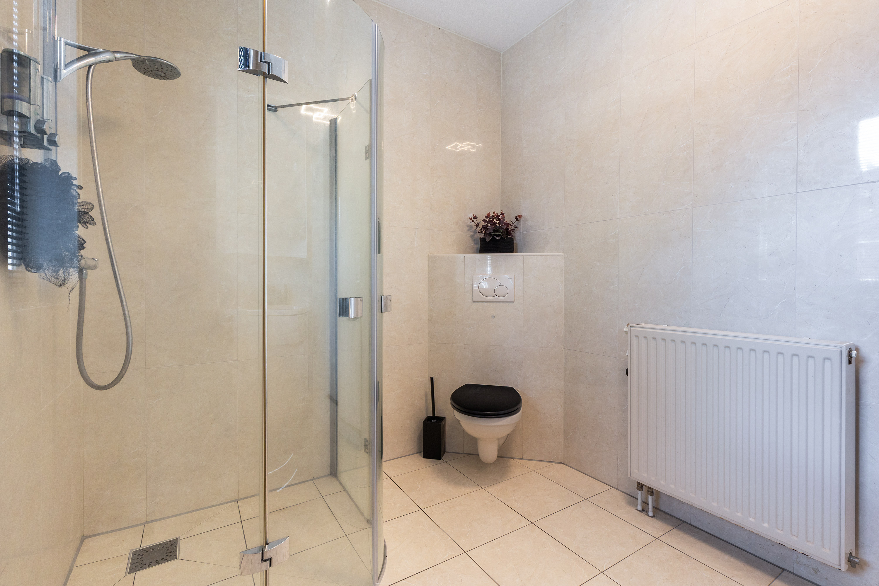 De moderne badkamer is volledig betegeld en uitgerust met een douchecabine, wastafelmeubel en een tweede toilet. Dankzij het openslaande venster en de mechanische ventilatie is er altijd voldoende daglicht en frisse lucht.