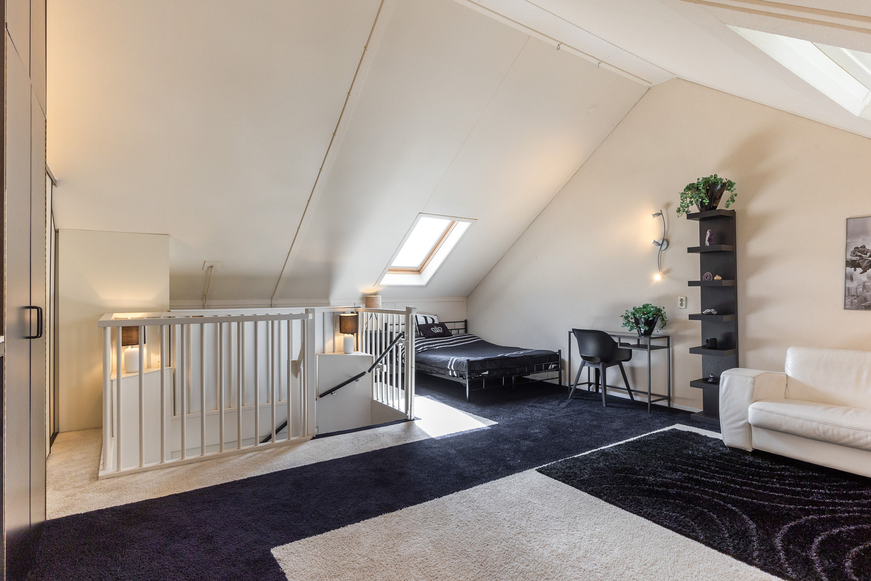 Een vaste trap leidt naar de ruime tweede verdieping. Dit is nu één grote open ruimte met een royale nokhoogte, wat een zee aan mogelijkheden biedt. Hier kunnen met gemak een vierde en zelfs vijfde slaapkamer worden gerealiseerd, of bijvoorbeeld een royale werk- of hobbyruimte. Achter de knieschotten is veel bergruimte aanwezig en in de inbouwkasten bevinden zich de aansluitingen voor de wasmachine en droger, evenals de cv-installatie.