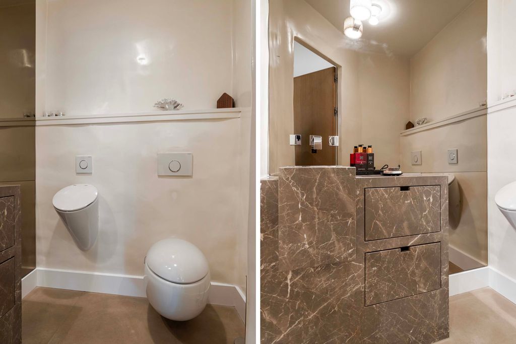 De entree is royaal, met open eiken trappen en sfeervolle verlichting. Het toilet is luxe uitgevoerd met een wandcloset, urinoir en marmeren wastafelmeubel.