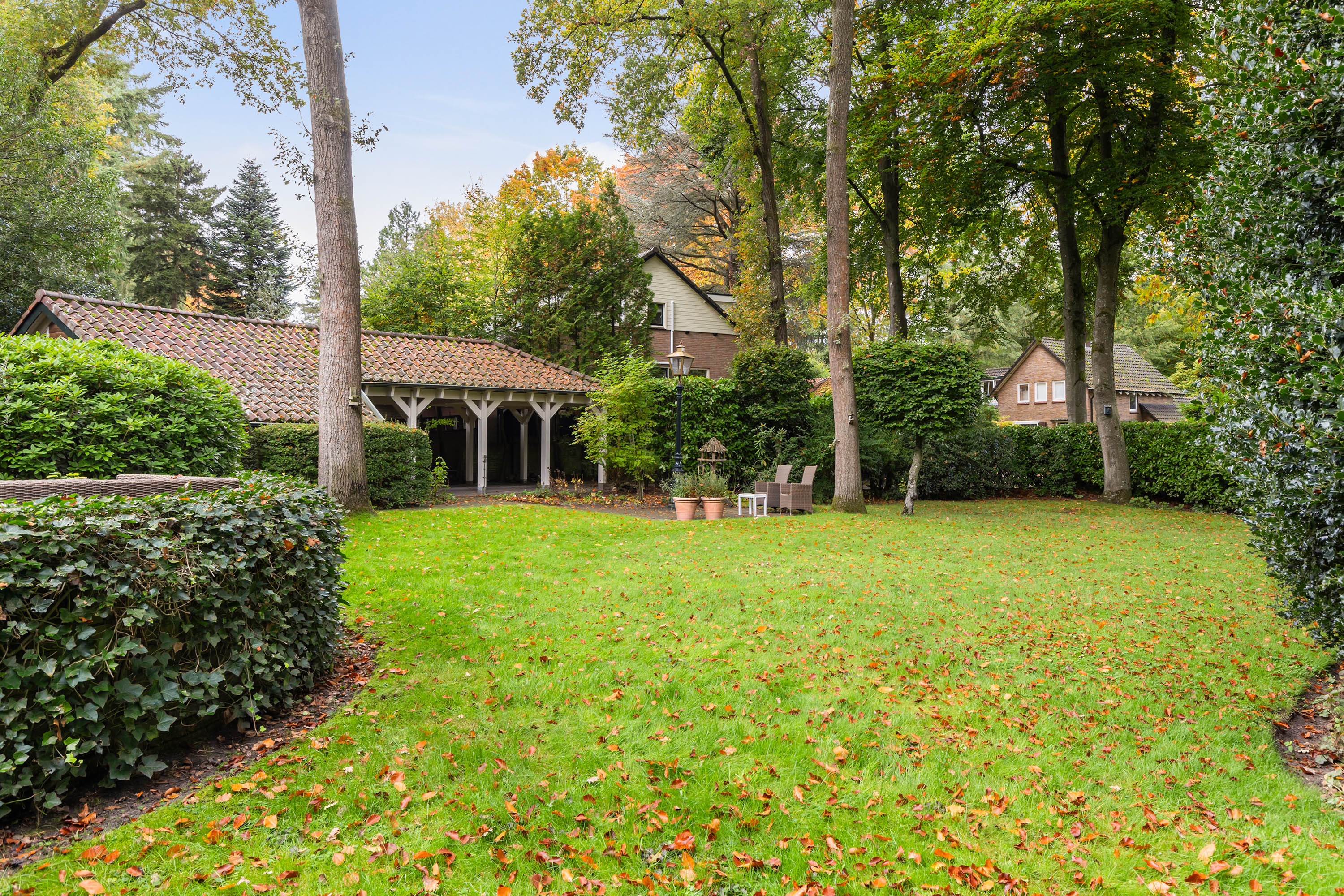 De tuin rondom de woning biedt veel vrijheid en privacy. Aan de voorzijde is er vrij uitzicht over een brede bosschage, wat de ligging extra bijzonder maakt. De straat loopt om de driehoekig bebossing heen, waardoor de woning in een rustige en ruimtelijke setting ligt, met veel groen rondom.