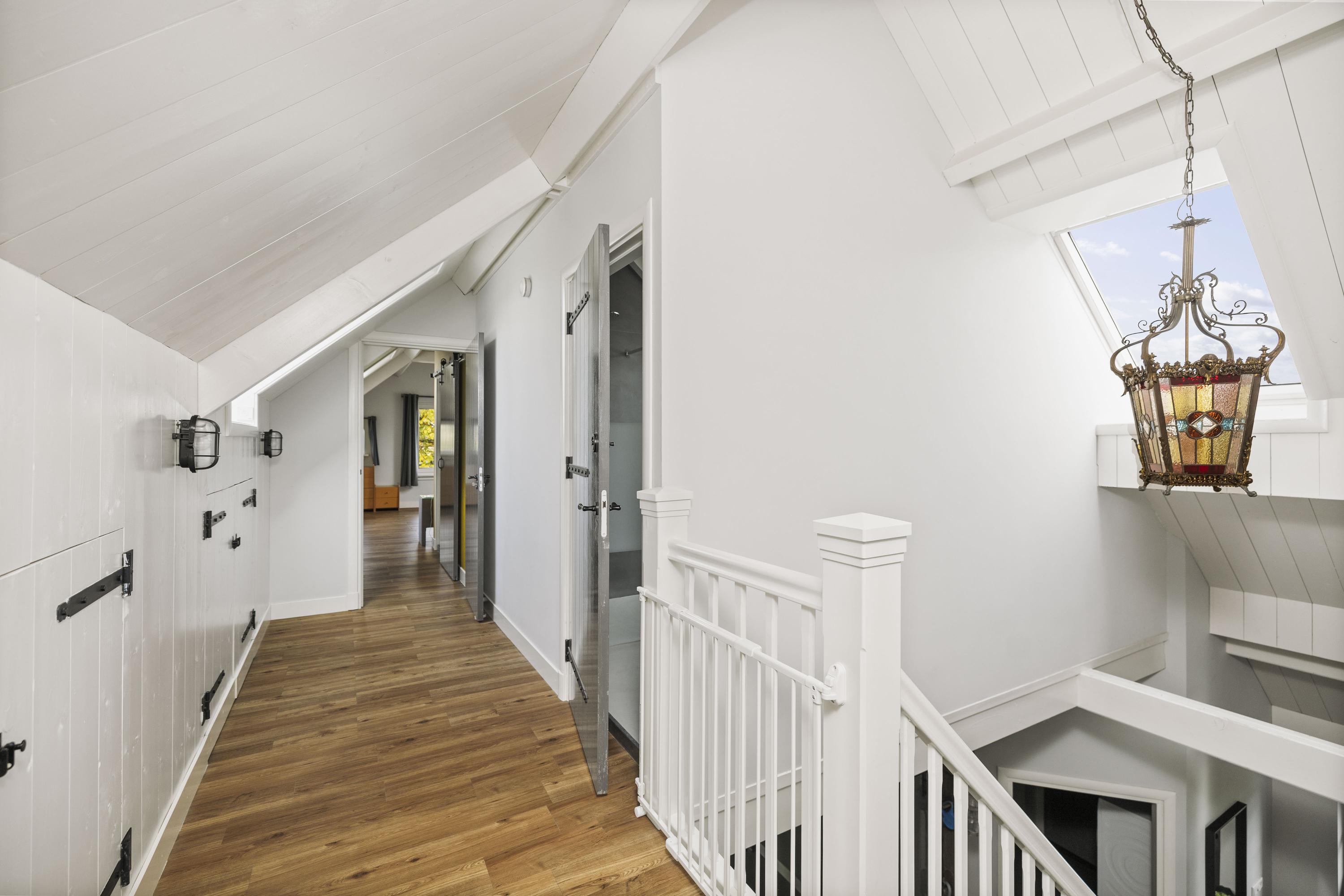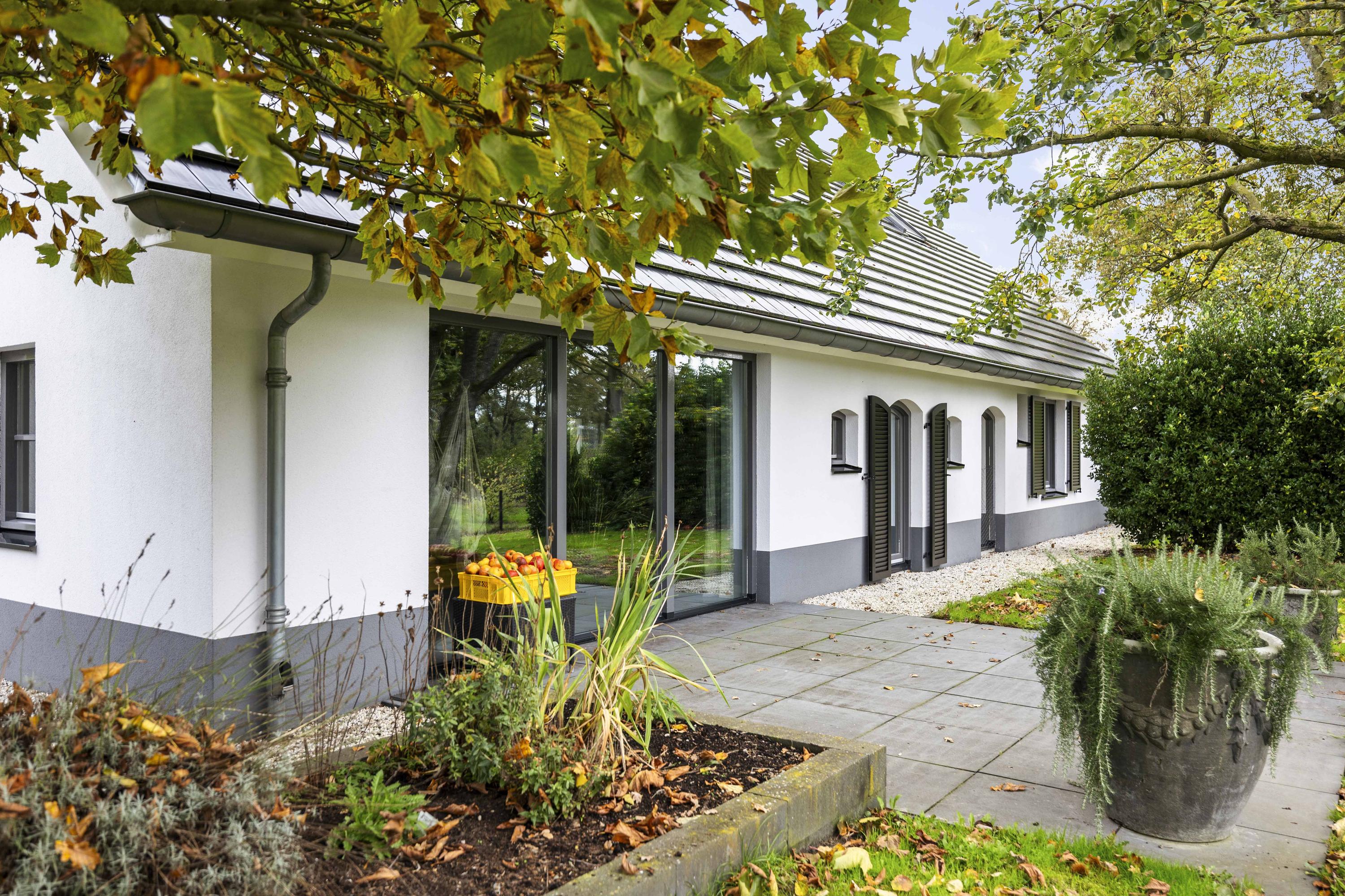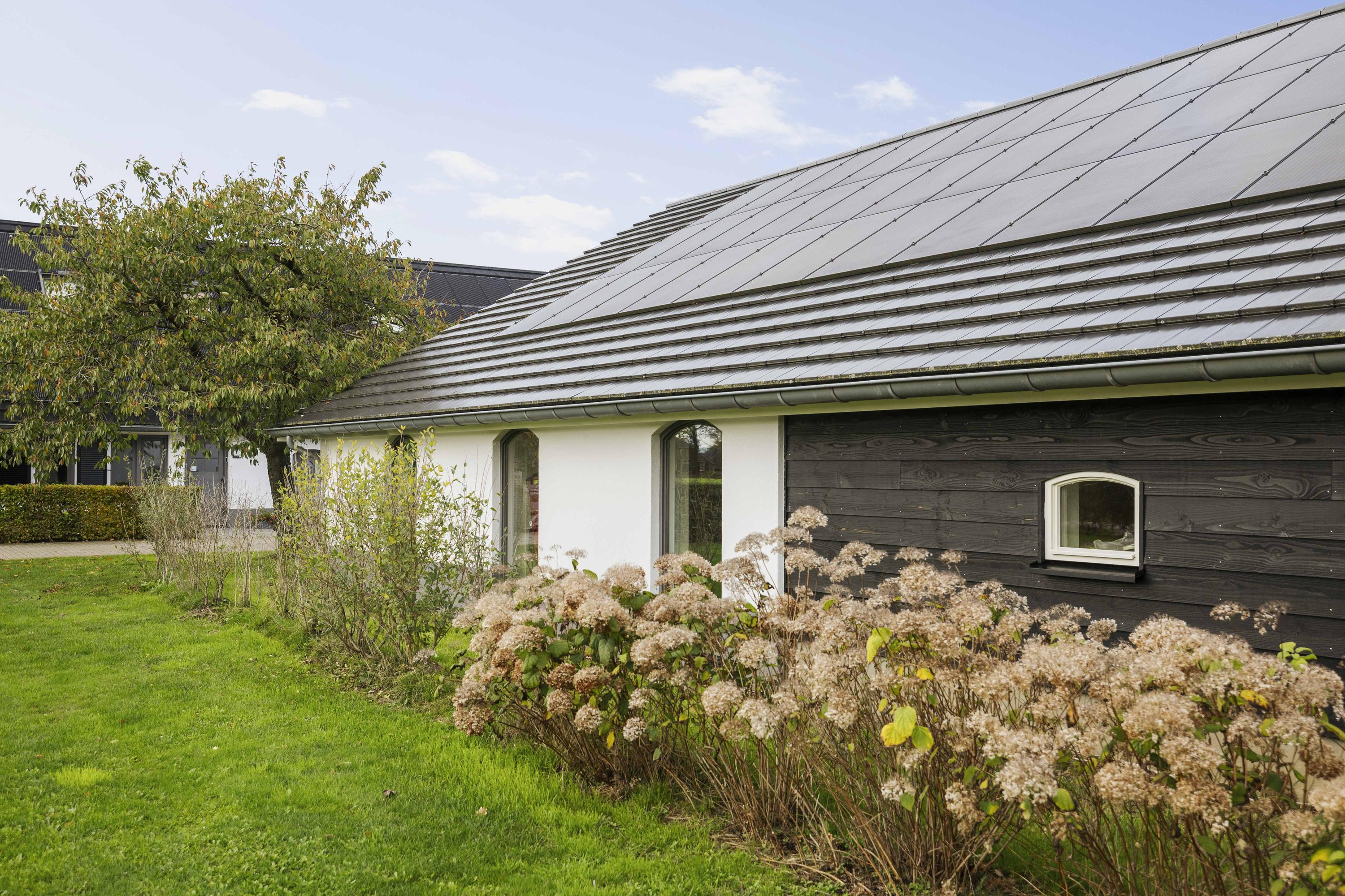 Deze magnifieke woonboerderij kreeg in 2016 haar huidige gestalte; toen werd de boerderij, die in 1924 gebouwd werd, van onder tot boven gerenoveerd. Hierbij lag de nadruk op verduurzaming; de buitenzijde werd volledig geïsoleerd met blokken styrofoam, rondom kreeg het huis nieuw HR+++-glas, er werd een water-water-warmtepomp aangelegd (die op 75 m diepte de warmte uitwisselt en ophaalt), de vloer binnen werd voorzien van een robuuste gietvloer – ideaal in combinatie met de vloerverwarming - en op de daken werden in totaal 110 (nee, dit is géén typfout) zonnepanelen gelegd. Onder de motorkap is dit huis één en al state-of-the-art technisch vernuft. Zelfs het kleurenpalet – de buitenzijde is wit gekeimd met grijs houtwerk en kraalrand – draagt bij aan het energiezuinige karakter van het huis, want waar de witte gevels het zonlicht reflecteren, absorbeert het grijs de warmte. Dit huis heeft niet alleen nul op de meter, het levert ook nog eens fiks terug! Een thuisbatterij is hier dus een prima aanvulling.