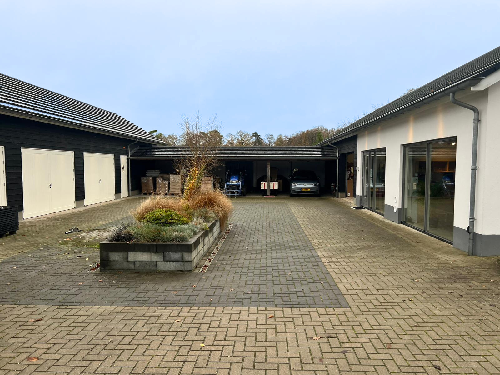 Aansluitend bevindt zich een wagenloods/carport (60 m2). Daarnaast wordt de U-vorm gevuld met een dubbele afsluitbare garage (46 m²) en aansluitende tweede grote opslag-/stallingsruimte (ca. 62 m²). Op het bestrate buitenterrein is er parkeerruimte voorzien ten behoeve van minstens zes auto’s met een oplaadpaal 22kW (nu openbaar beschikbaar).