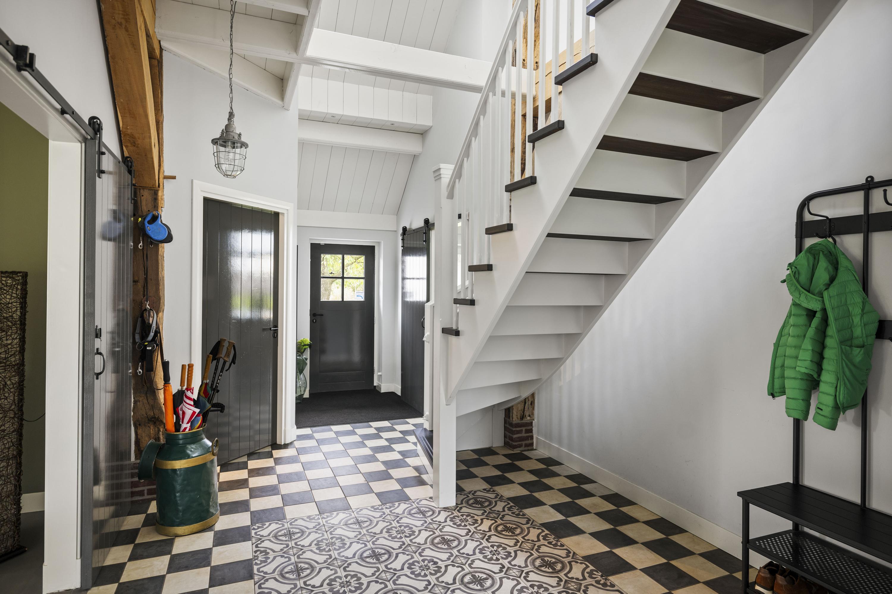 De ruime hal met Portugese tegels biedt een royaal welkom. In de hal de toegang tot de technische ruimte, de trap naar de verdiepingen en de leefruimtes op de begane grond. De voormalige deel is nu een heerlijke woonkamer en de oude deeldeuren zijn vervangen door grote raampartijen. De Bullerjan (FreeFlow, A++) houtkachel zorgt voor een gezellige warmte.