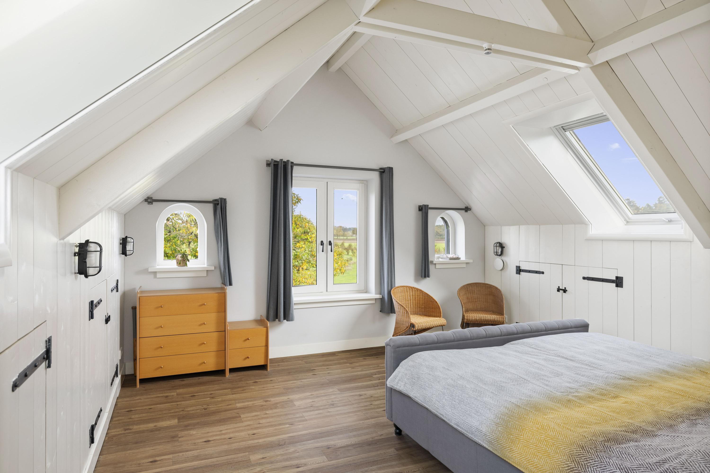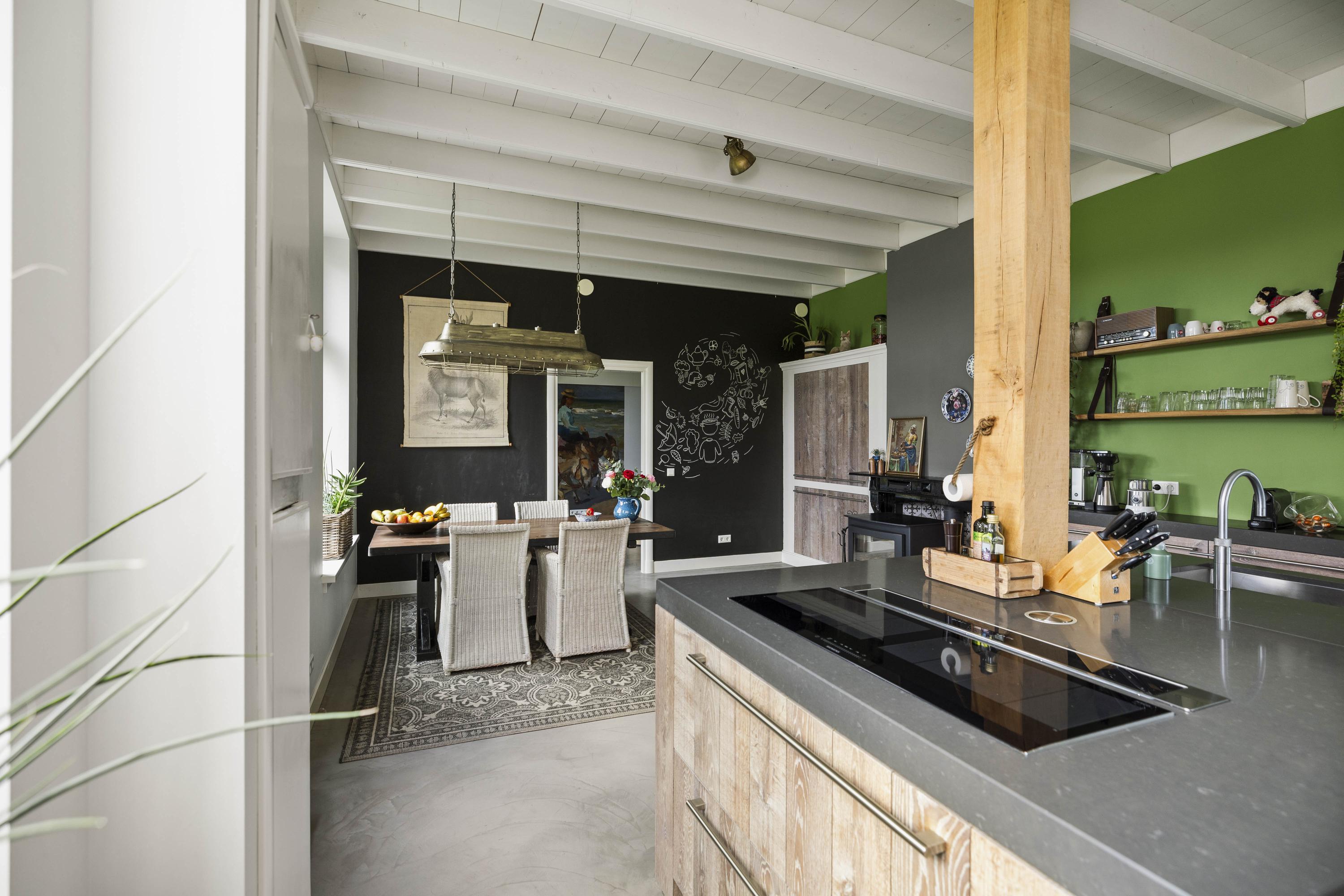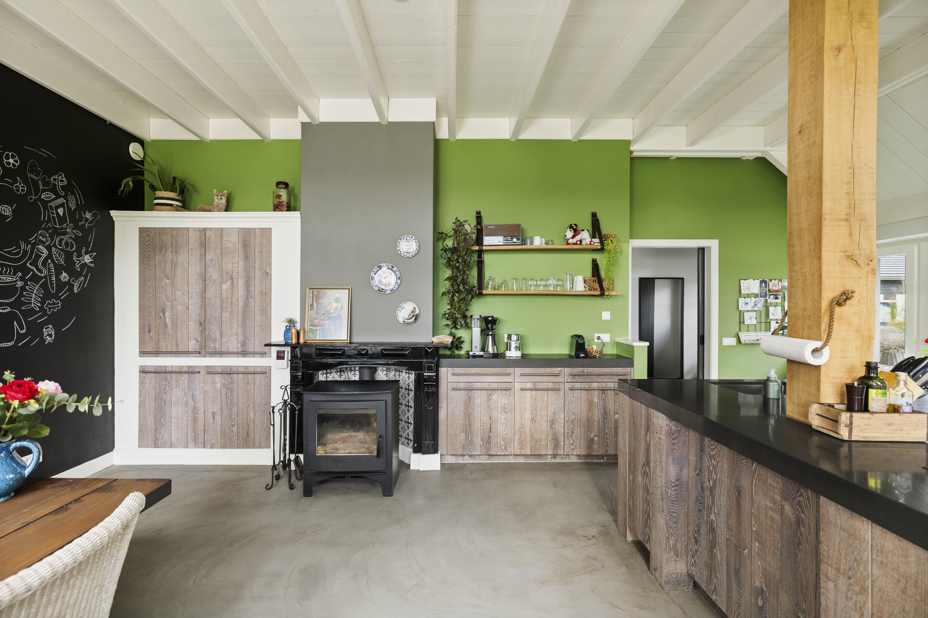 De keuken is maatwerk van Scheffer Keukens Zelhem en is ronduit indrukwekkend; met een dik, composiet werkblad, robuuste massief eiken fronten en alle moderne inbouwapparatuur – van inductieplaat tot Quooker - is het een heerlijke plek om je als chef-kok uit te leven. In de oude schouw staat nog een stoere Nordic Fire-houtkachel, die de keuken voorziet van extra sfeer en warmte.