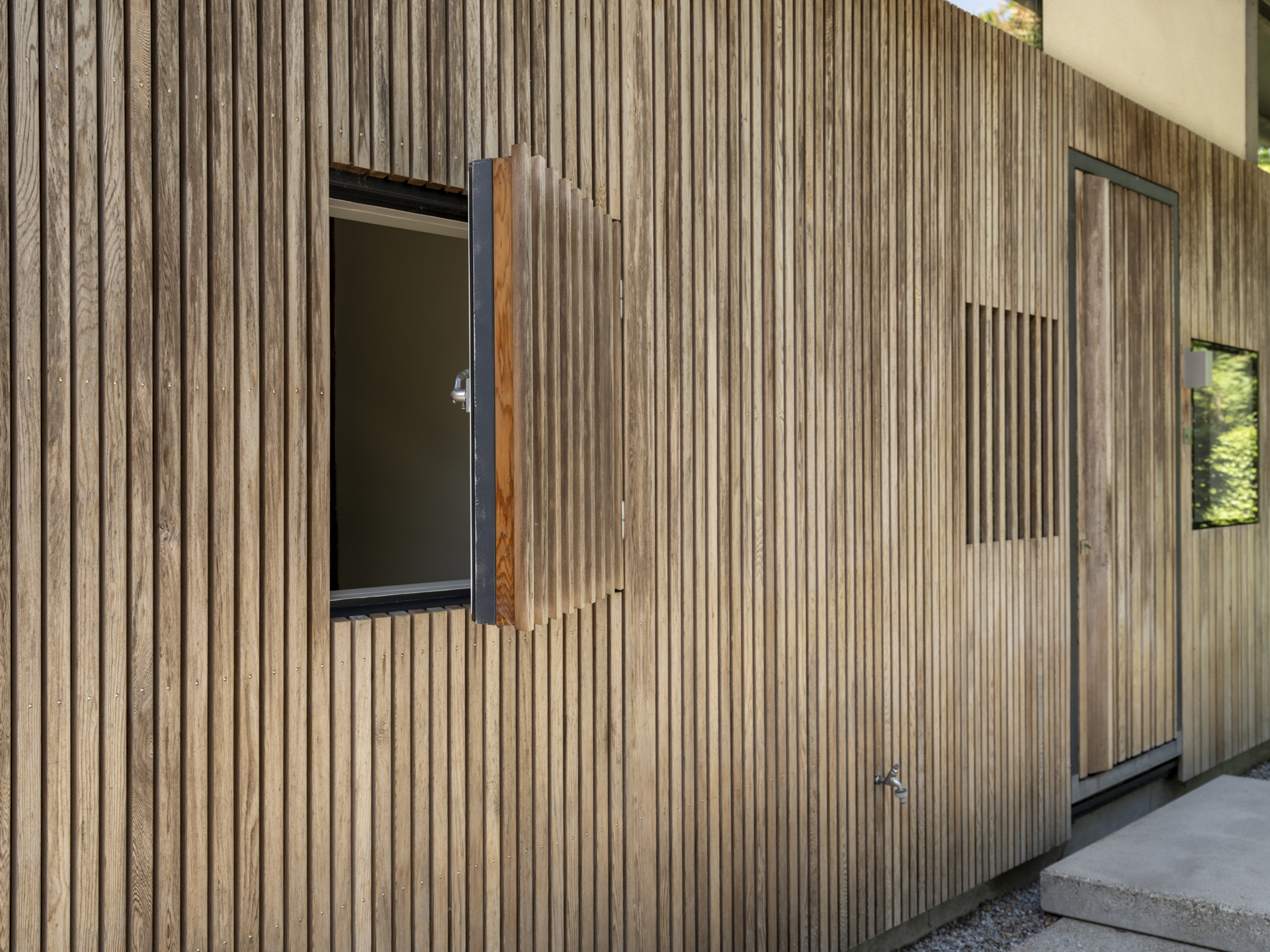 Het houten multifunctionele bijgebouw, naar Scandinavisch ontwerp en uitvoering, is zeer goed geïsoleerd (o.a. driedubbel glas). Het gebouw doet momenteel dienst als werk-, klus- en logeerruimte, maar zou ook als mantelzorgwoning kunnen worden ingericht.