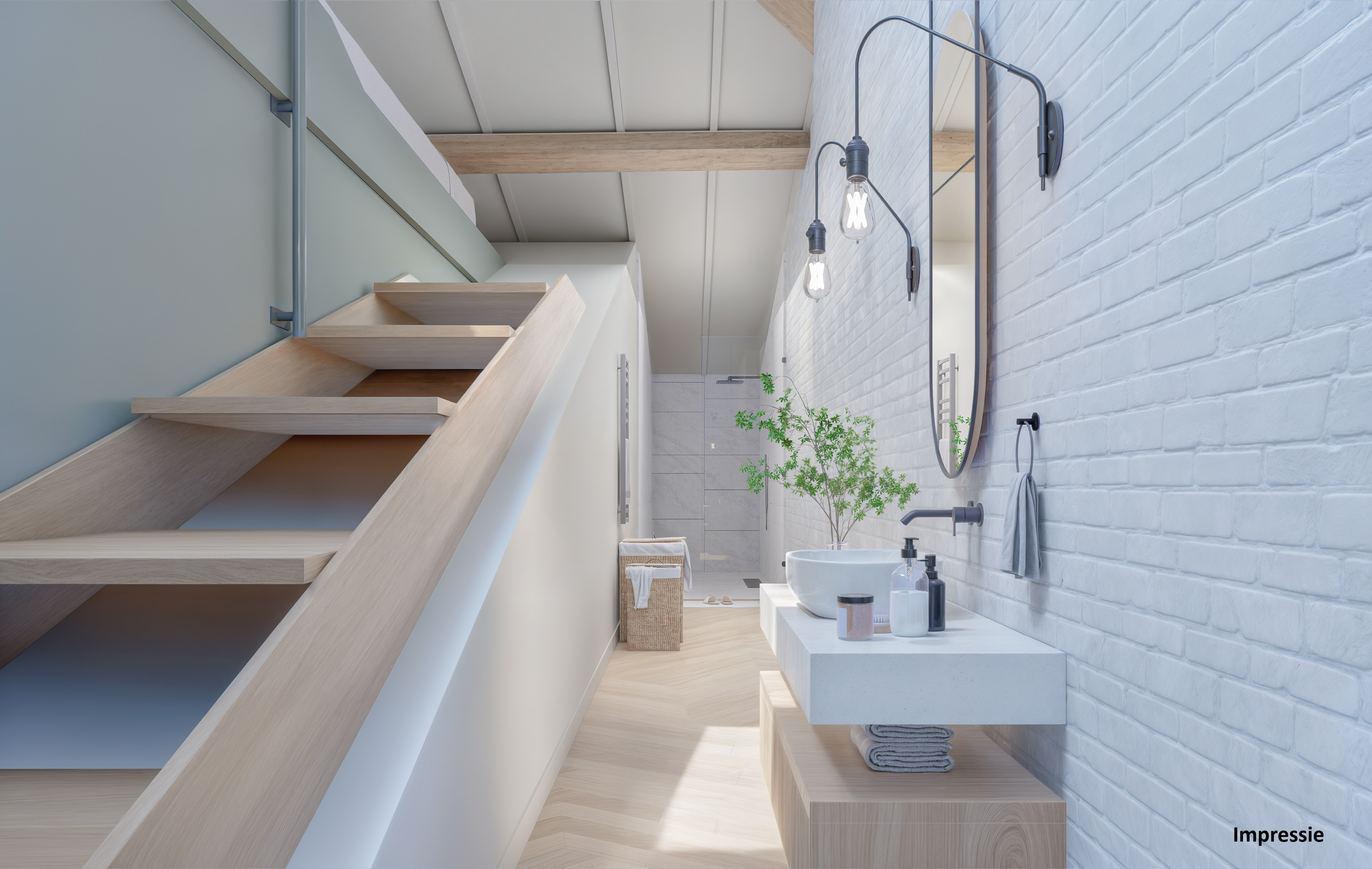 Slaapkamer, in de nok van de kapconstructie is een hoogslaper met daaronder kastruimte geplaatst. In beide slaapkamers bestaat de mogelijkheid een (tweede/derde) badkamer te realiseren.