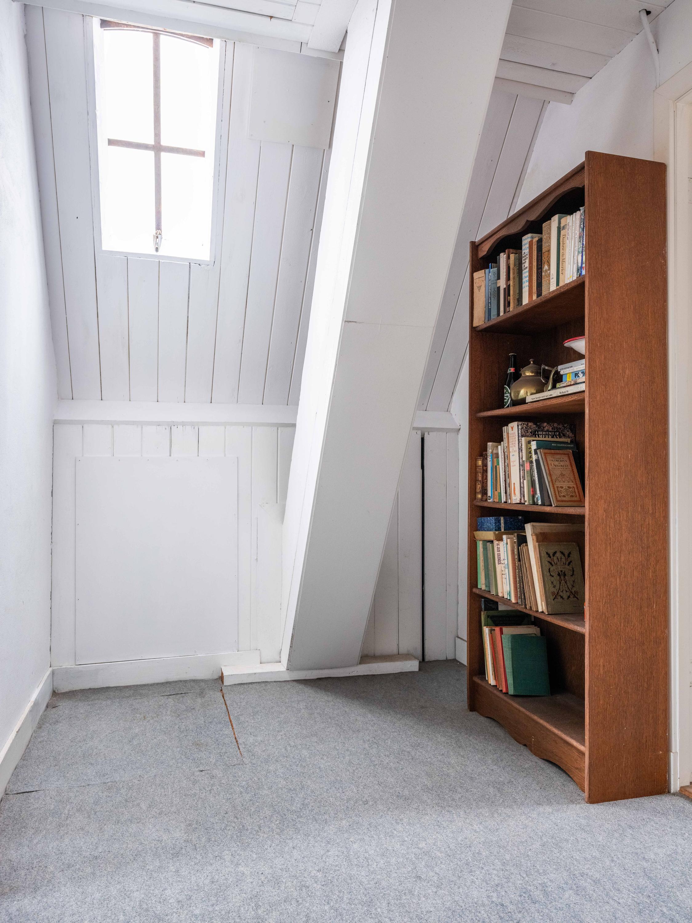 Via een tweede vaste trap bereikt u de zolderverdieping. In tegenstelling tot de rest van de woning, die wordt verwarmd met radiatoren, is deze verdieping niet verwarmd. De ruime overloop leidt naar twee kamers, die ideaal kunnen dienen als extra slaapkamers of als werkruimte. Ook zijn hier knieschotten aanwezig voor extra bergruimte.