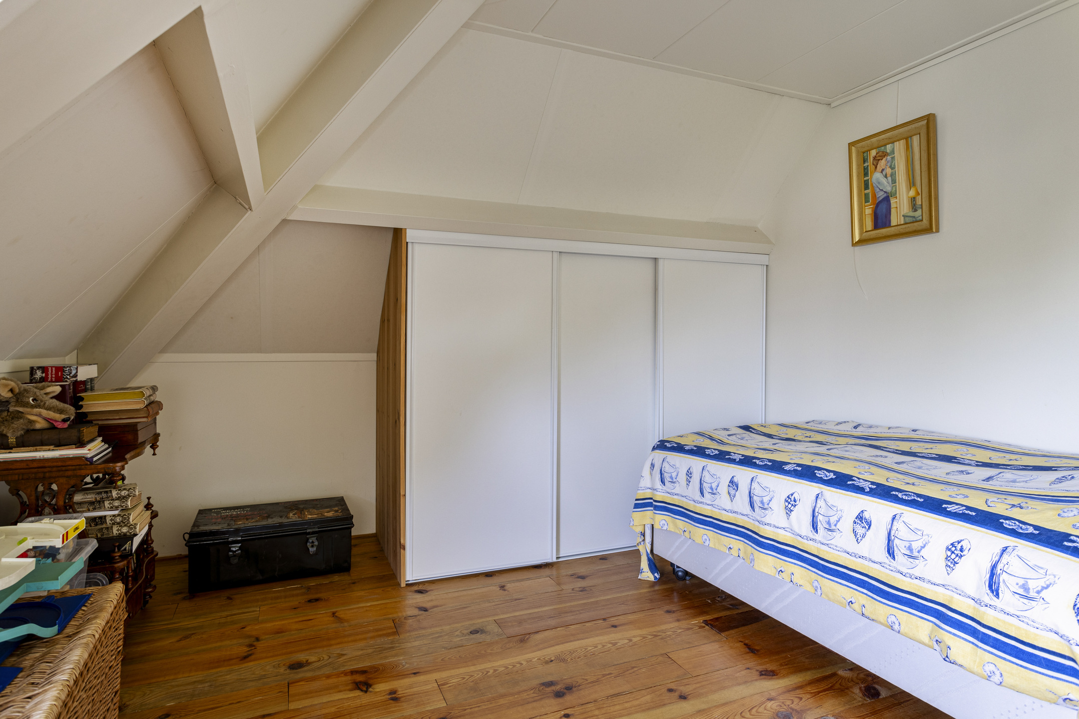 hoofdslaapkamer voorzijde (ca. 29 m²) met inbouwschuifkasten en een dakkapel, wandafwerking stucwerk, grenen planken vloer, dakbeschot in het zicht;