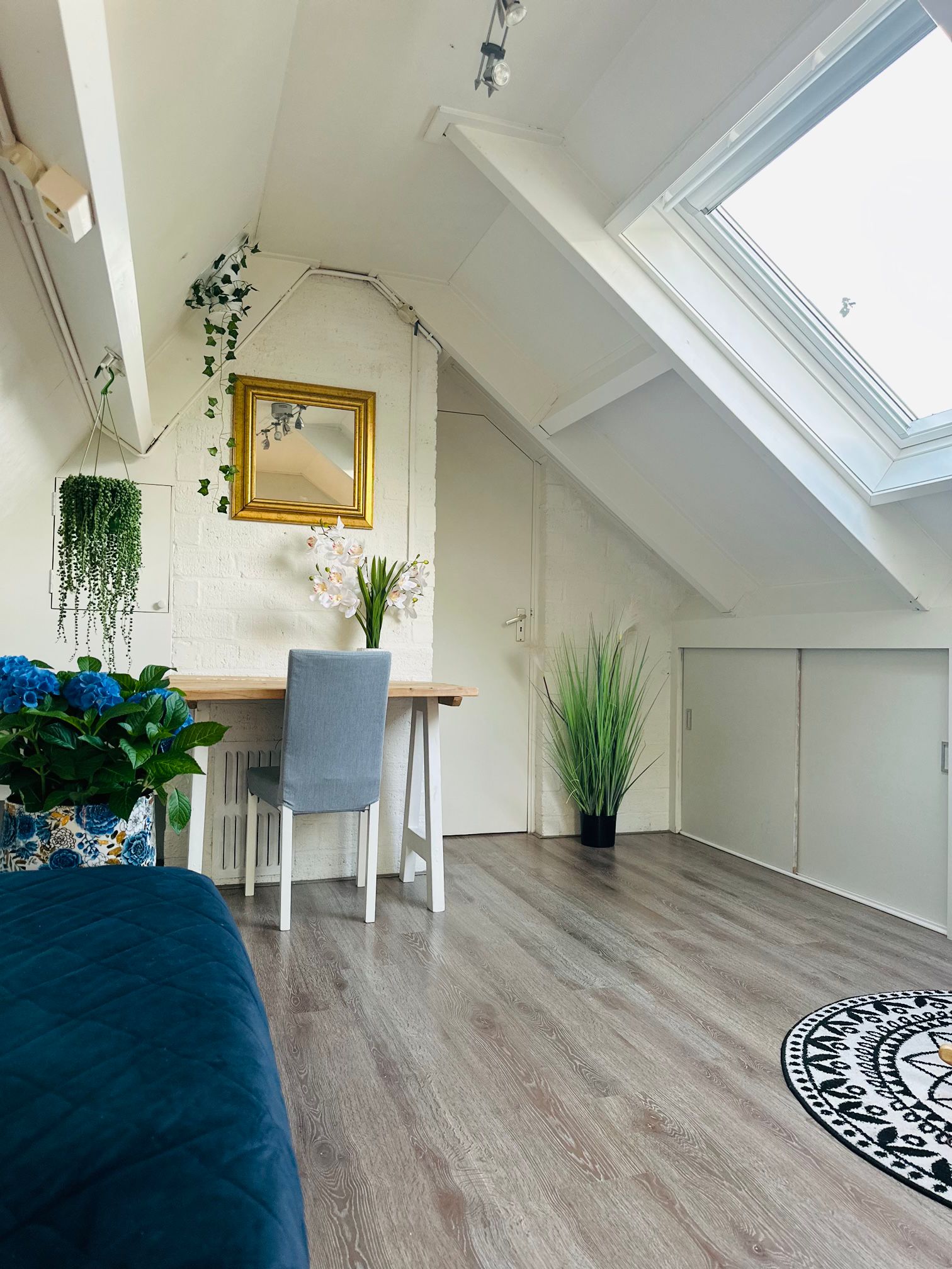 Ruime voorzolder met dakraam, wastafel, aansluiting voor de wasmachine, wasdroger en opstelplaats cv-ketel.