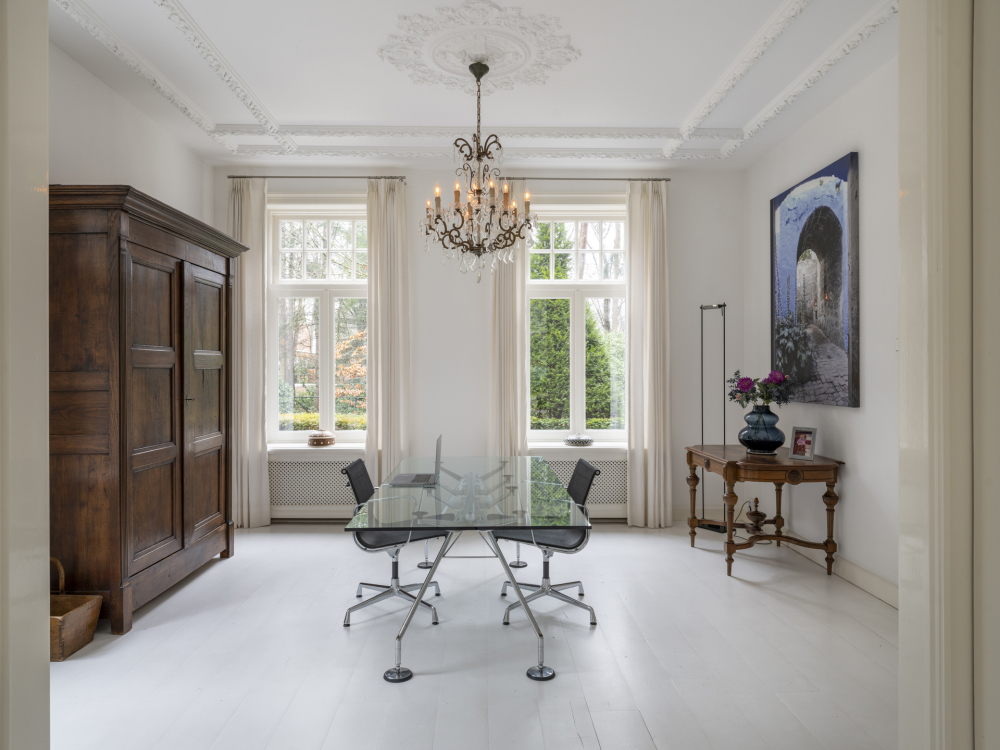 Aan de linkerzijde van de gang bevindt zich een aparte tv-/ werkkamer, ook deze kamer heeft een ornamenten-plafond en wit gelakte eikenhouten vloerdelen.