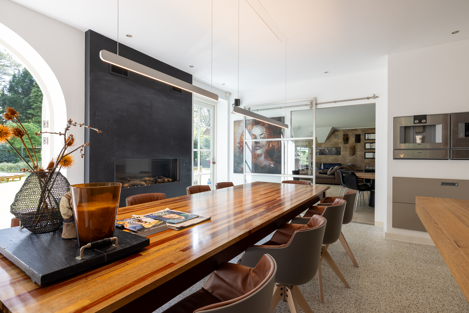 De woonkeuken heeft een gashaard, royaal eetgedeelte en dubbele openslaande deuren naar de tuin. Dit geeft een mooie connectie met de tuin en de buitenkeuken. Hier haalt u buiten naar binnen.