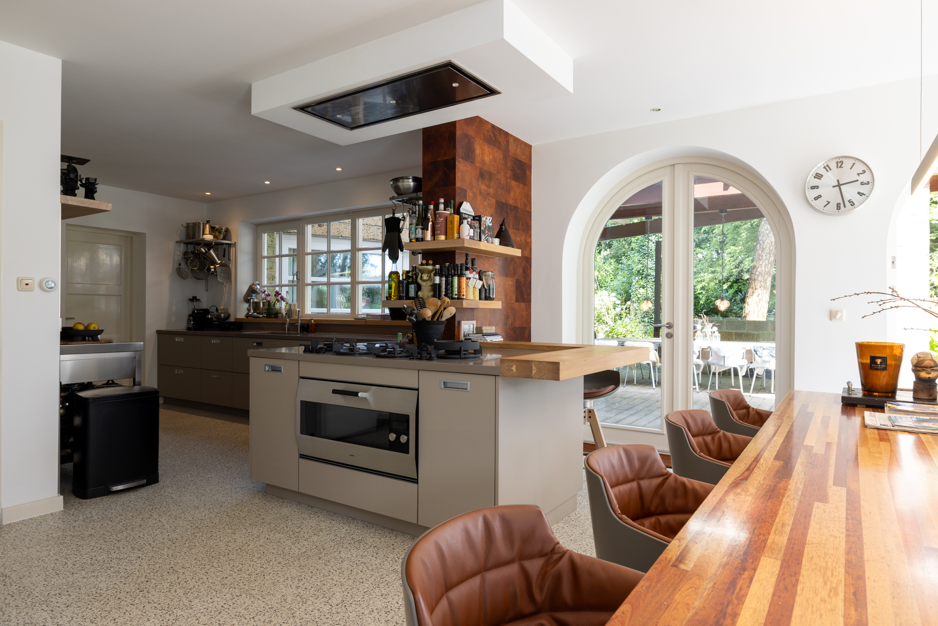 Geweldige woonkeuken (2022), op maat gemaakt door Antonissen interieurbouw en voorzien van alle wenselijke apparatuur zoals o.a. een ingebouwde koffiemachine, combi-oven, heteluchtoven, 6-pits gastoestel (Pitt Cooking), composiet aanrechtblad en een fraai stalen werkblad met stoere achterwand, afzuigkap, dubbele spoelbak, geïntegreerde afvalbak, Quooker en een grote roestvrijstalen koelkast met aparte wijnklimaatkast van Liebherr. De meeste inbouwapparatuur is van hoogstaande kwaliteit van het exclusieve merk Gaggenau.