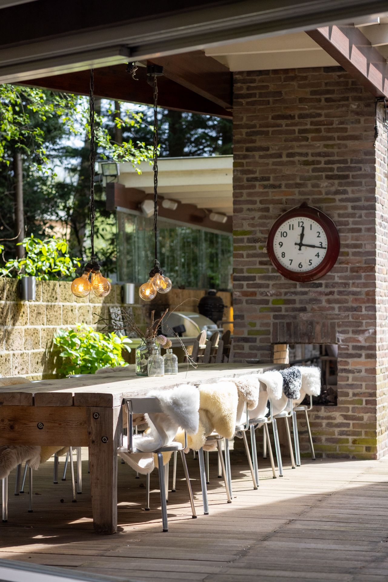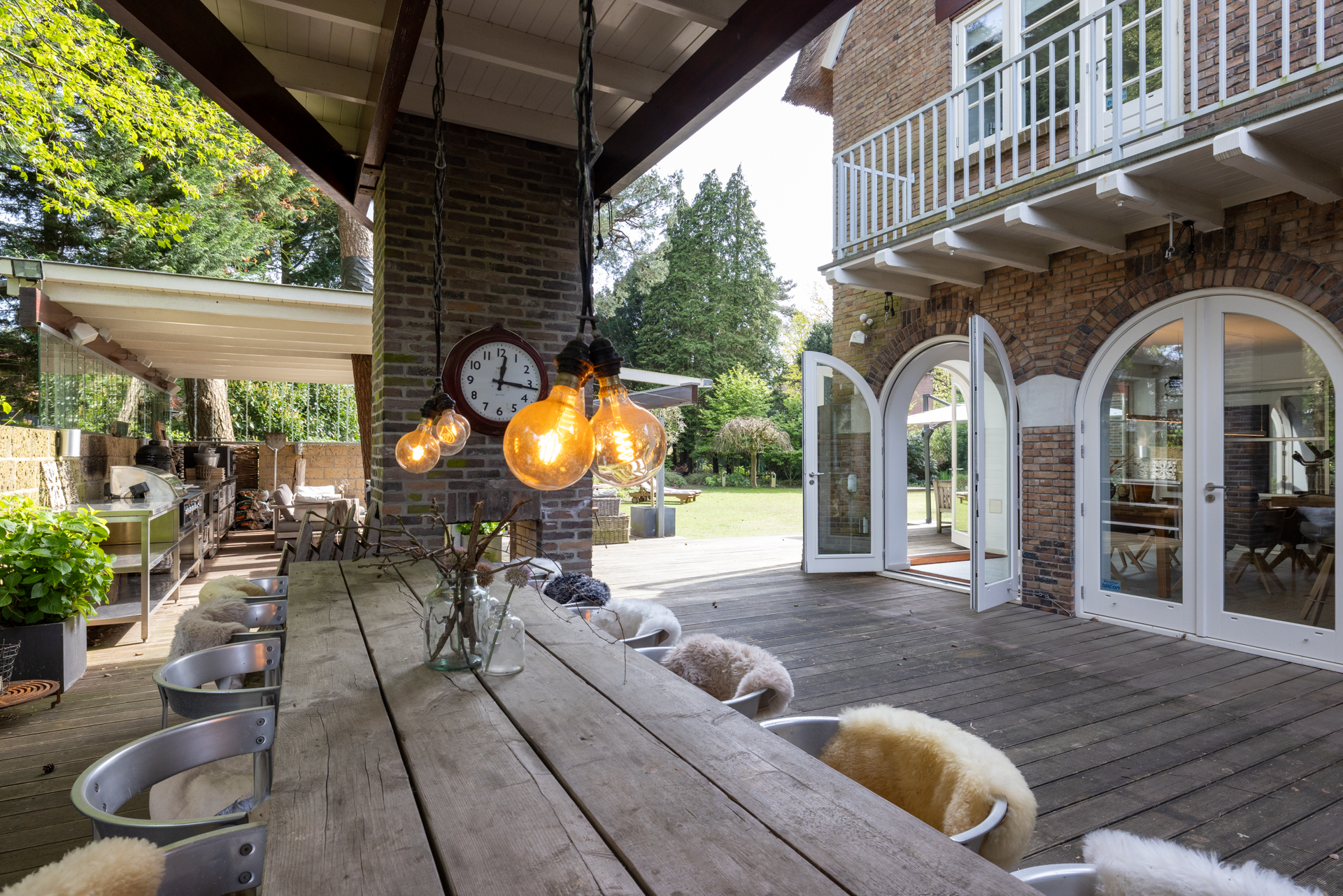 Niet alleen in de woning, maar ook buiten is het heerlijk vertoeven. Aan de achterzijde van de woning bevindt zich een grote overkapte buitenruimte met houten veranda's en een buitenkeuken direct aan het huis, waardoor het binnen- en buitenleven naadloos in elkaar overlopen.
