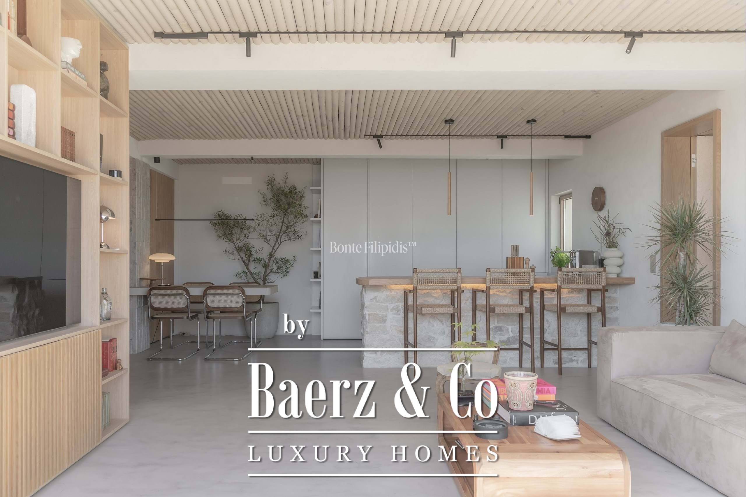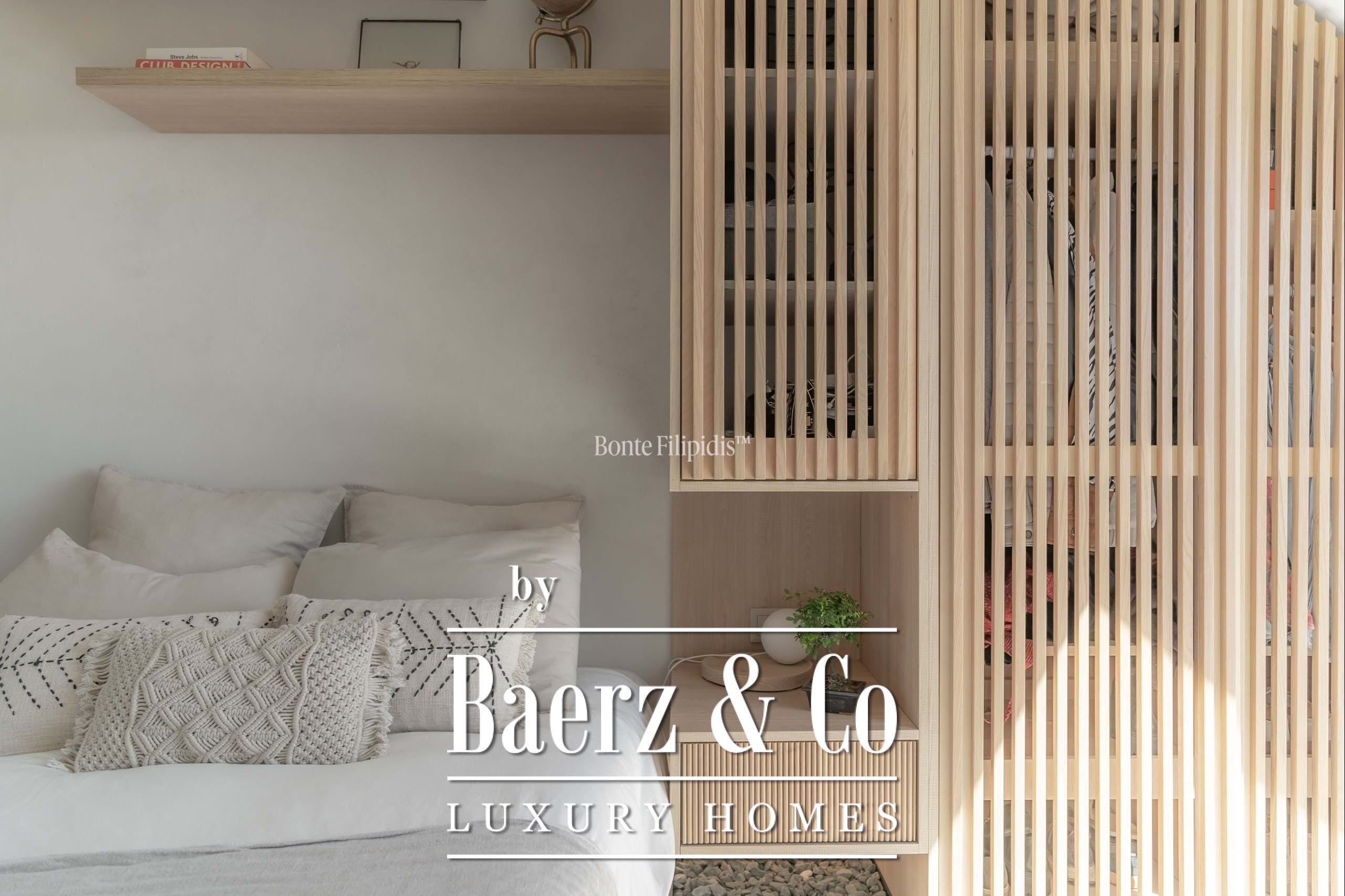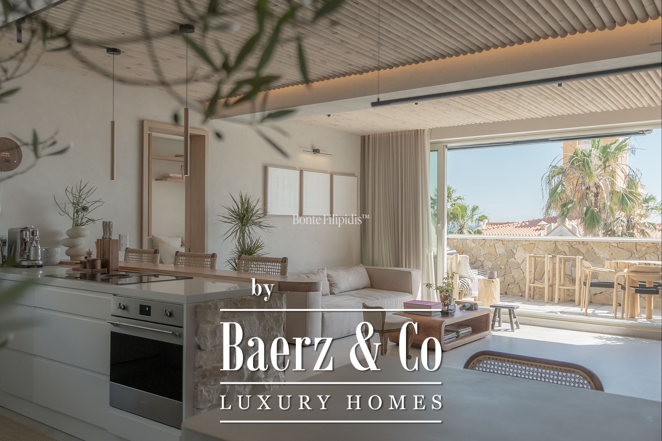 Met een woonoppervlakte van 88 m² sluiten de open woonkamer, eetruimte en keuken naadloos op elkaar aan, voorzien van hoogwaardige afwerking en volledig geïntegreerde apparatuur. De woonkamer leidt naar een terras van 19 m² met bar en een buitendouche om verkoeling te zoeken onder de lucht, met een sereen uitzicht op de baai. In het privégedeelte waarborgt de en-suite slaapkamer privacy, terwijl de tweede slaapkamer met zeezicht een eigen balkon en een aparte, complete badkamer biedt.