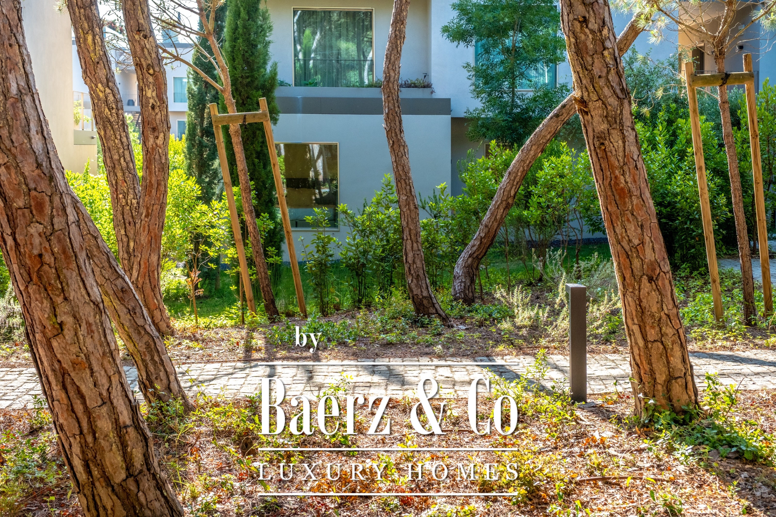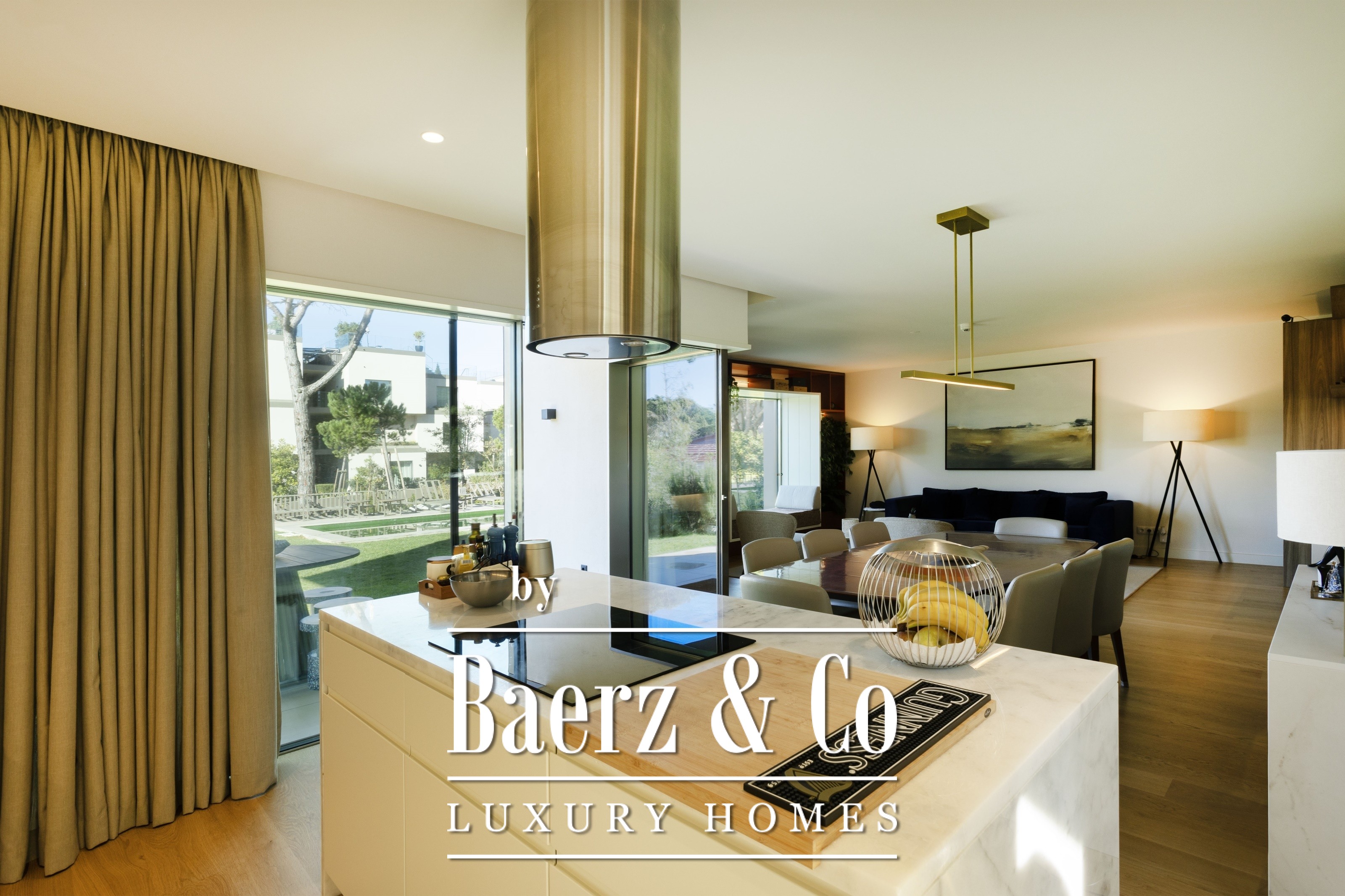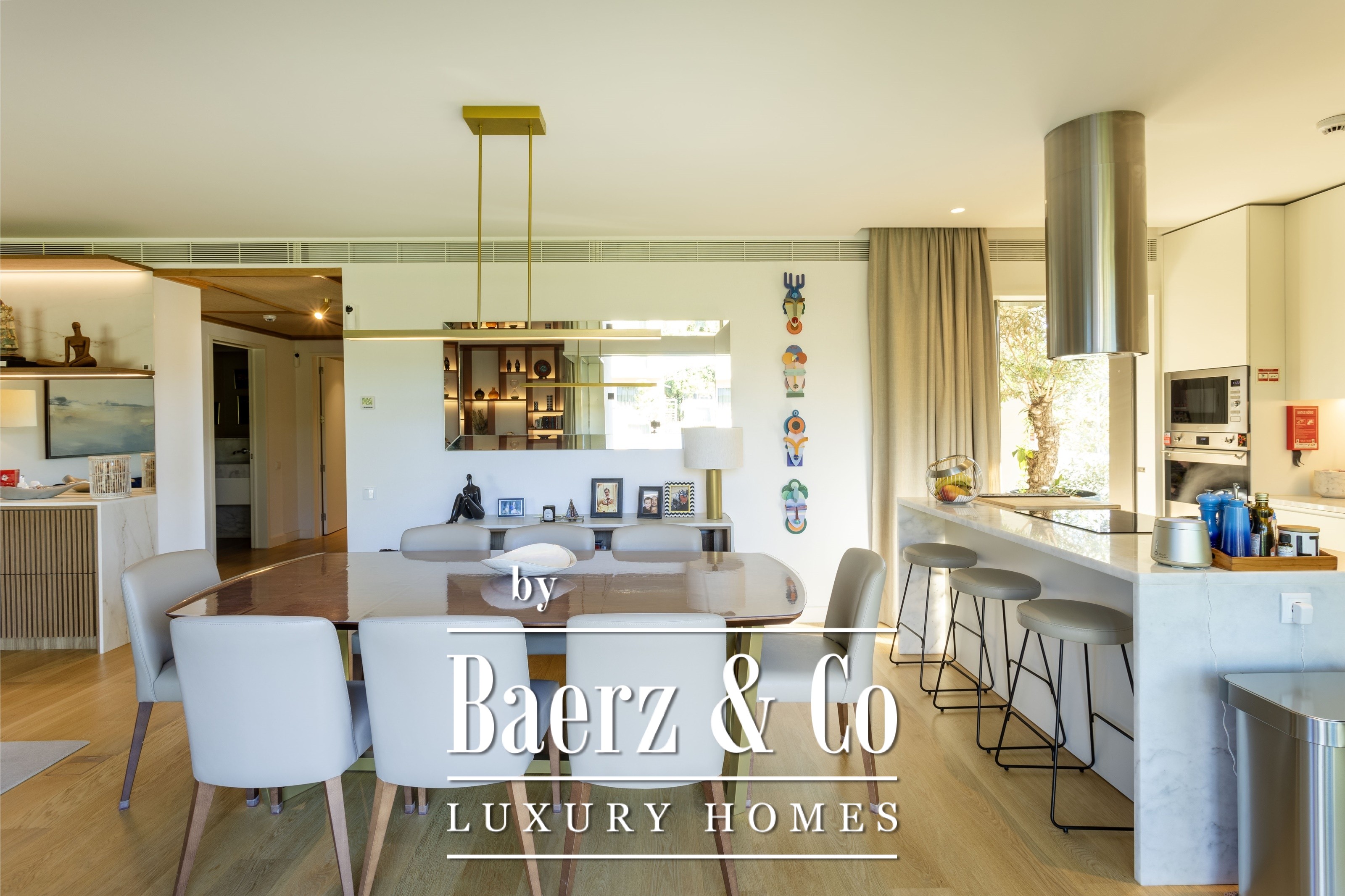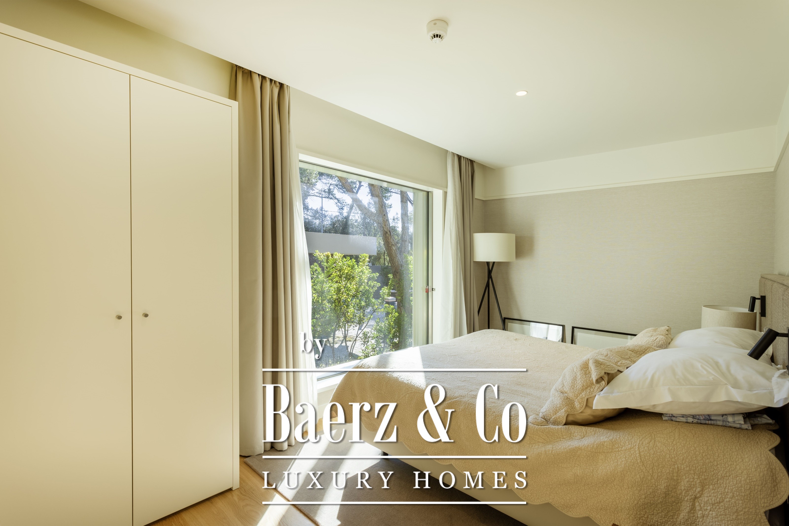 Appartement Cascais verenigt architectuur en rust in het Marinha Prime Condominium, waar design en privacy samenkomen. Deze driekamerwoning met een bruto privéoppervlak van 182 m² biedt een harmonieuze overgang tussen het binnenleven en een fraai aangelegde tuin van 400 m². Iedere slaapkamer is een suite, allen voorzien van inbouwkasten, badkamers met vloerverwarming en rustgevend uitzicht op de tuin. De woon- en eetkamer komen uit op het terras van 33 m² dat direct toegang geeft tot een privé verwarmd zwembad. De volledig uitgeruste keuken grenst aan een afgesloten balkon; een aparte werkkamer, tv-ruimte en wasruimte maken het dagelijks wonen compleet. Volledige airconditioning zorgt voor comfort in elk seizoen.