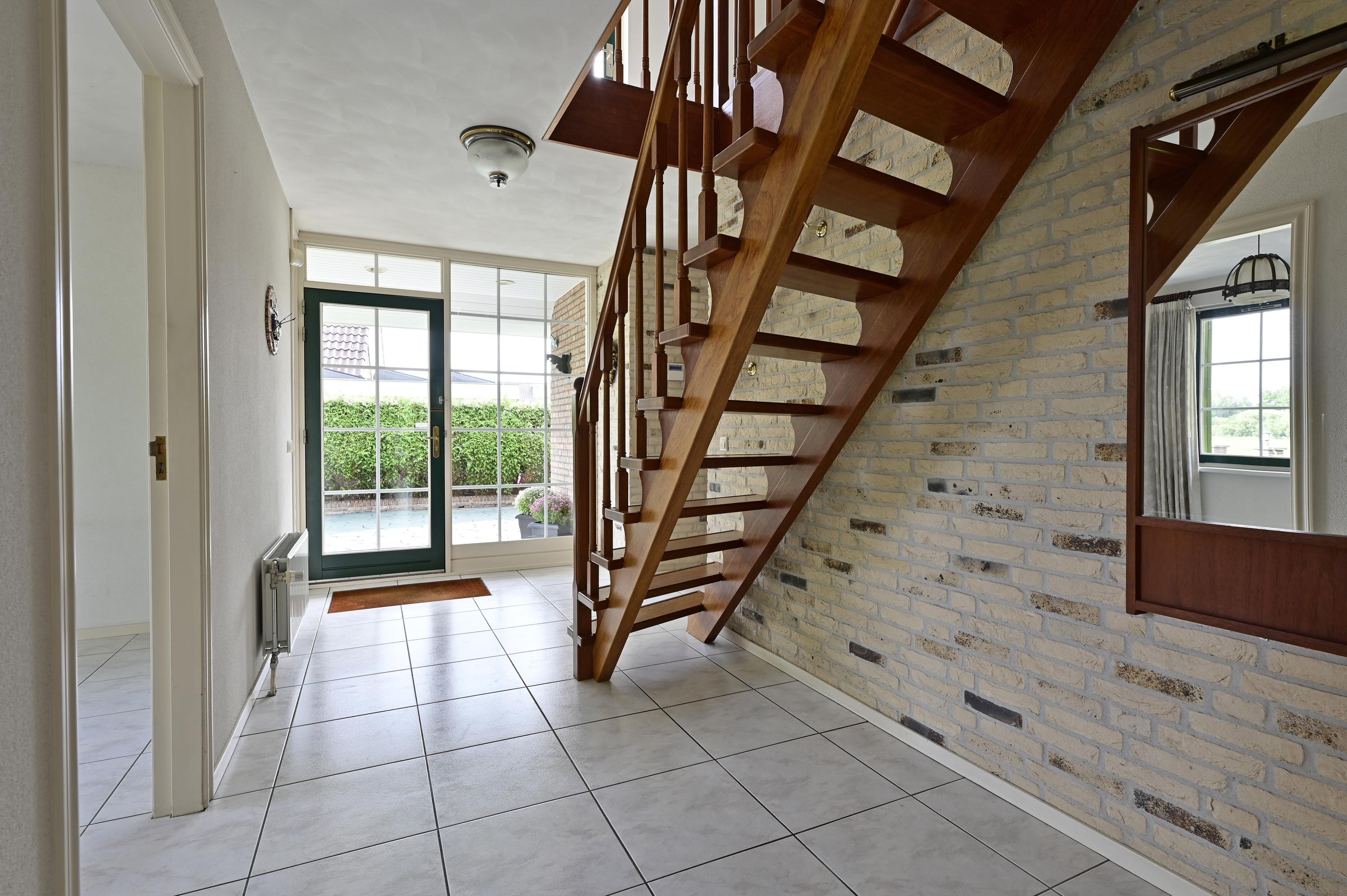 Via een fraaie houten glaswand met bijpassende deur betreedt u de sfeervolle woonkamer in L-vorm waar grote raampartijen zorgen voor een overvloed aan daglicht en een prachtig zicht op de voortuin en zijkant van het perceel. Een marmeren plateau met afsluitbare houtgestookte open haard vormt het centrale punt voor een gezellige zithoek. Aan de achterzijde is volop ruimte voor een grote eettafel, pal naast de openslaande deuren naar het verhoogde en onderheide terras – met een adembenemend uitzicht over de tuin, het water en het uitgestrekte polderlandschap. De eetkamer staat via een elegante toog in verbinding met de ruime, lichte keuken, die voorzien is van dubbele openslaande ramen met zicht op de achtertuin. De keuken is uitgerust met volop kastruimte en diverse inbouwapparatuur: een vaatwasser, oven, elektrische kookplaat met afzuigkap en een koel-/vriescombinatie. Aansluitend treft u de praktische bijkeuken met vaste kast (waar zich de verdeling van de vloerverwarming bevindt), extra opbergruimte, en aansluitingen voor de wasmachine en de wasdroger, een extra wastafel én een deur naar het verhoogde terras. De gehele begane grond is voorzien van een doorlopende tegelvloer met comfortabele vloerverwarming. Alle raamkozijnen zijn uitgevoerd in hardhout, en alle ramen zijn voorzien van houten luiken of rolluiken – een stijlvolle combinatie van comfort en klassieke charme.