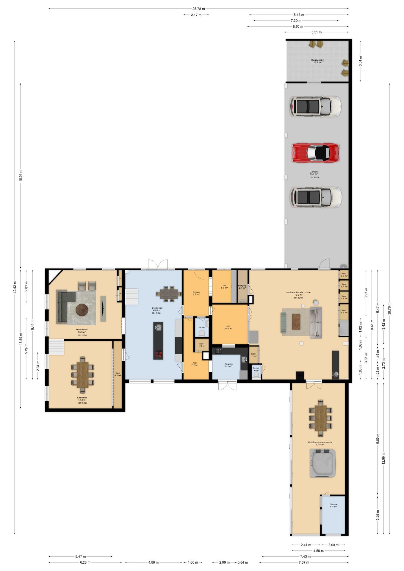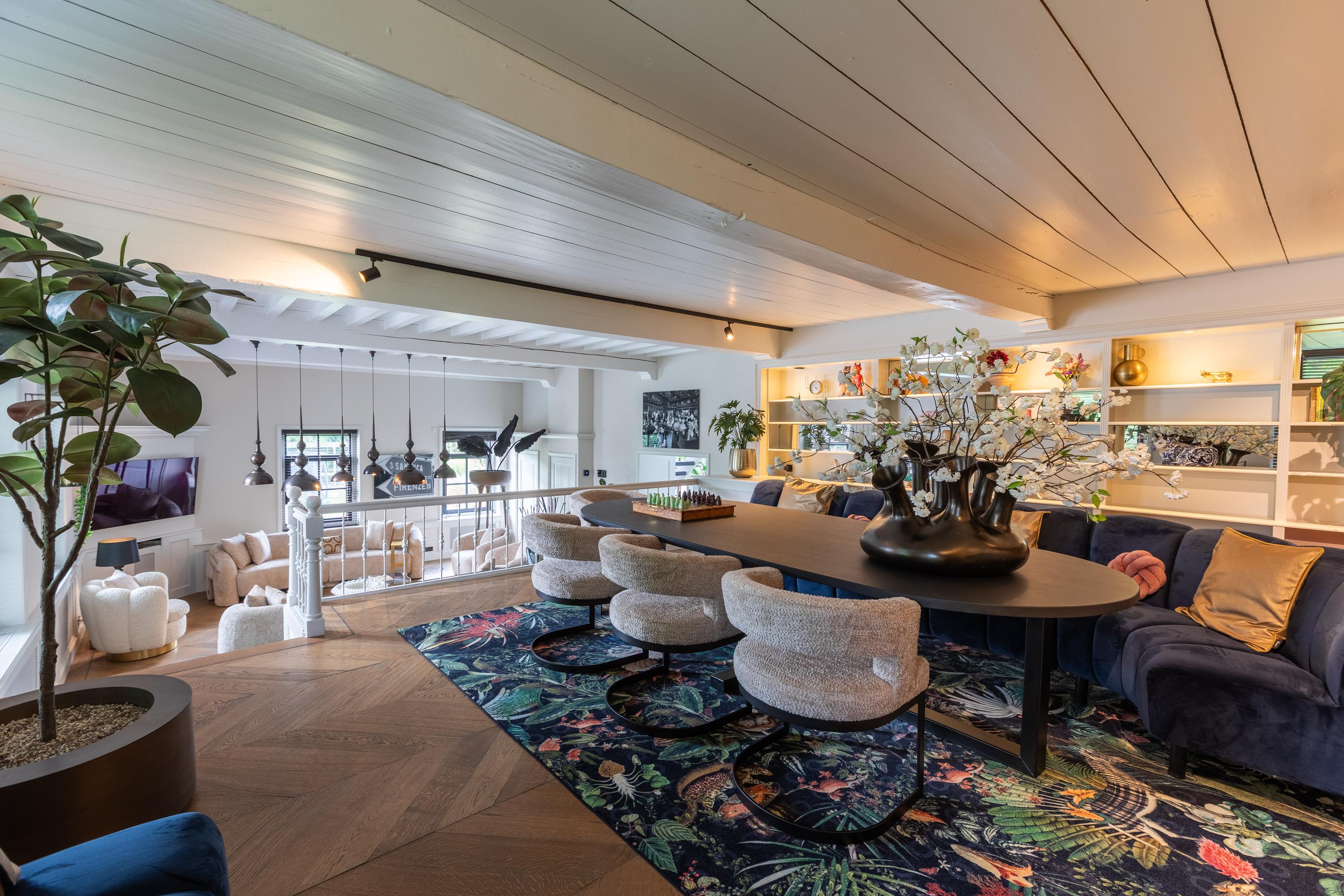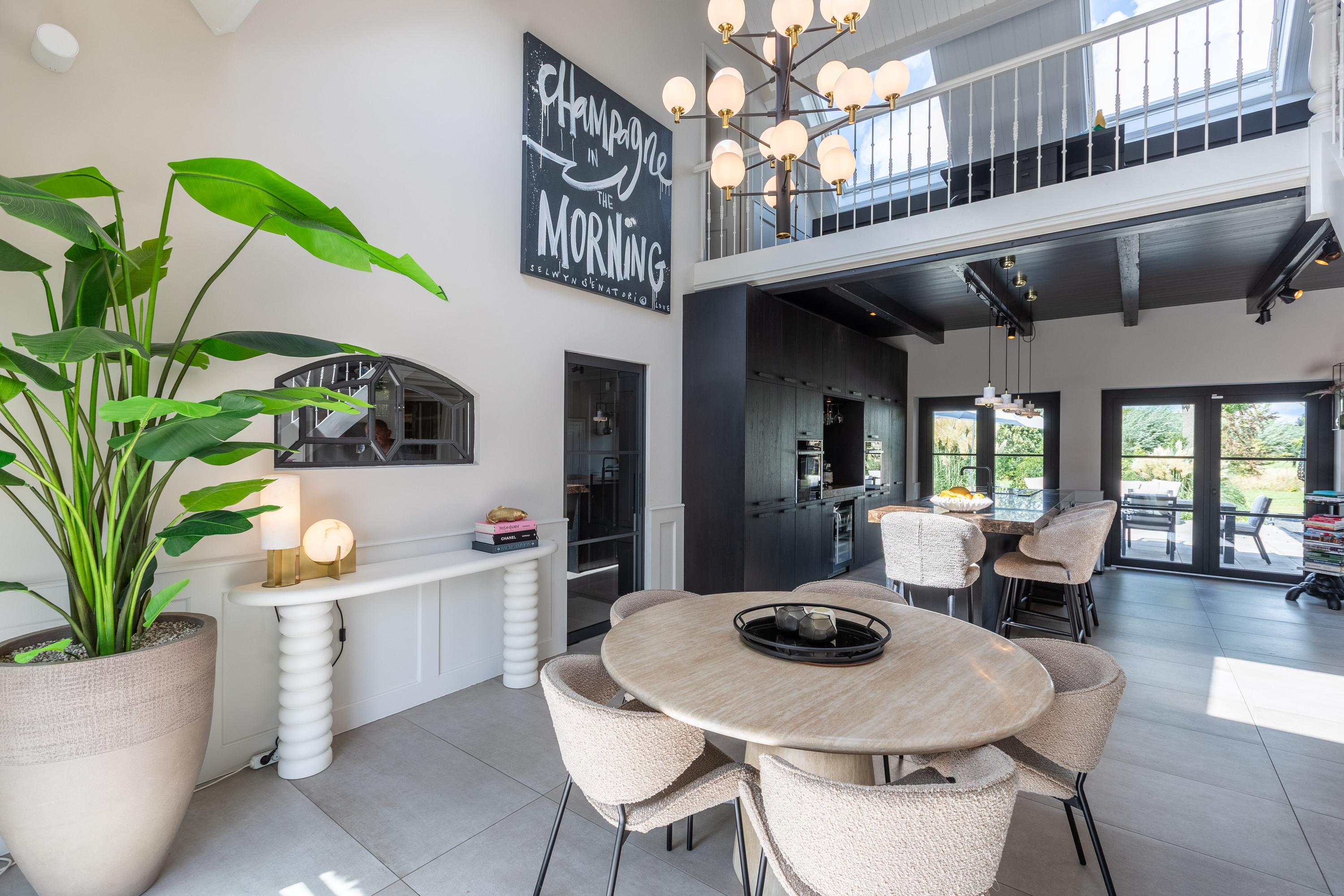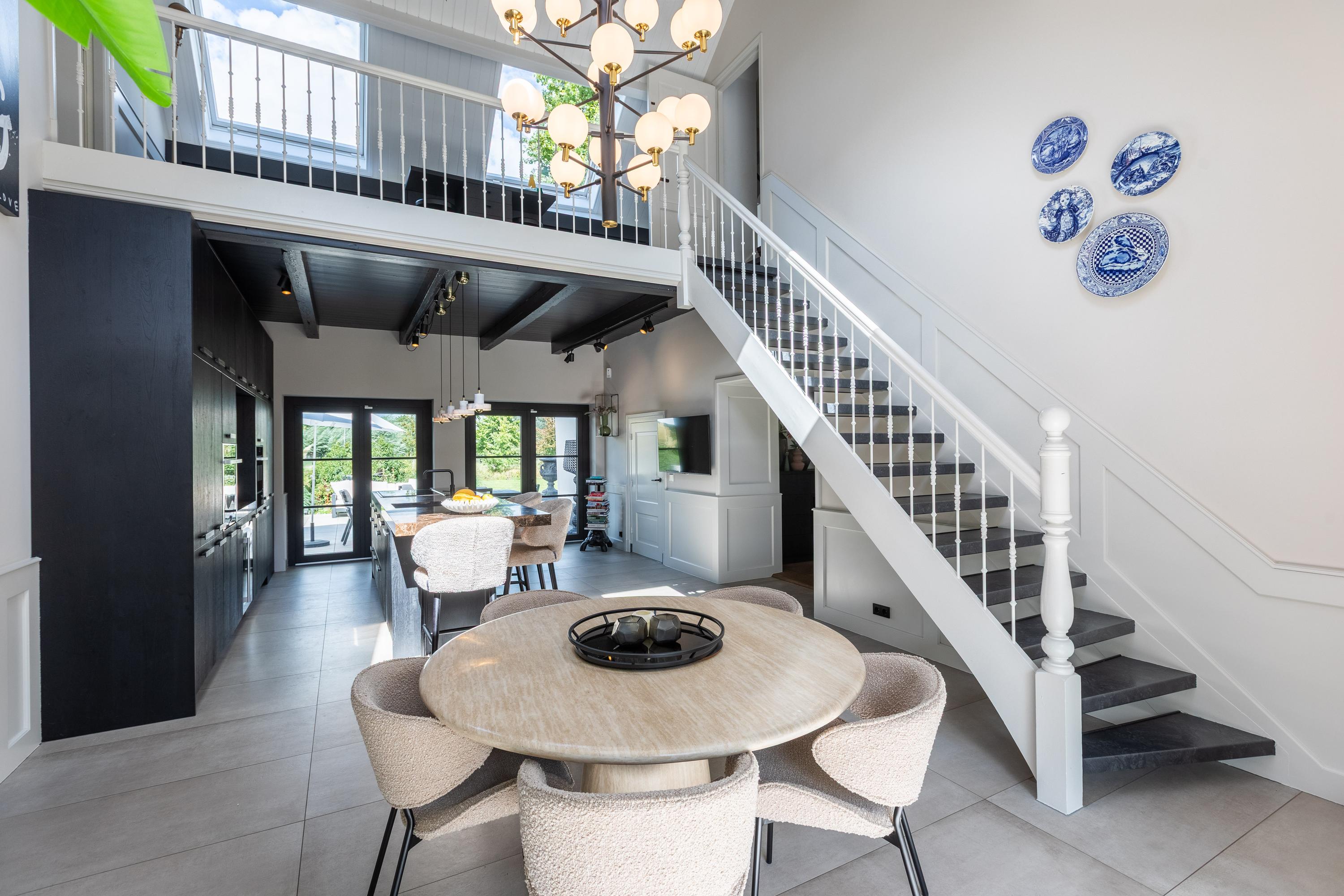 De entree is centraal gesitueerd en biedt toegang tot een royale hal met garderobe en toilet. Vanuit hier betreedt u de indrukwekkende eetkeuken van ca. 45 m², luxe uitgevoerd met kookeiland en hoogwaardige inbouwapparatuur. Dankzij de hoge nok en entresol geniet u hier van een prachtige ruimtelijke beleving.