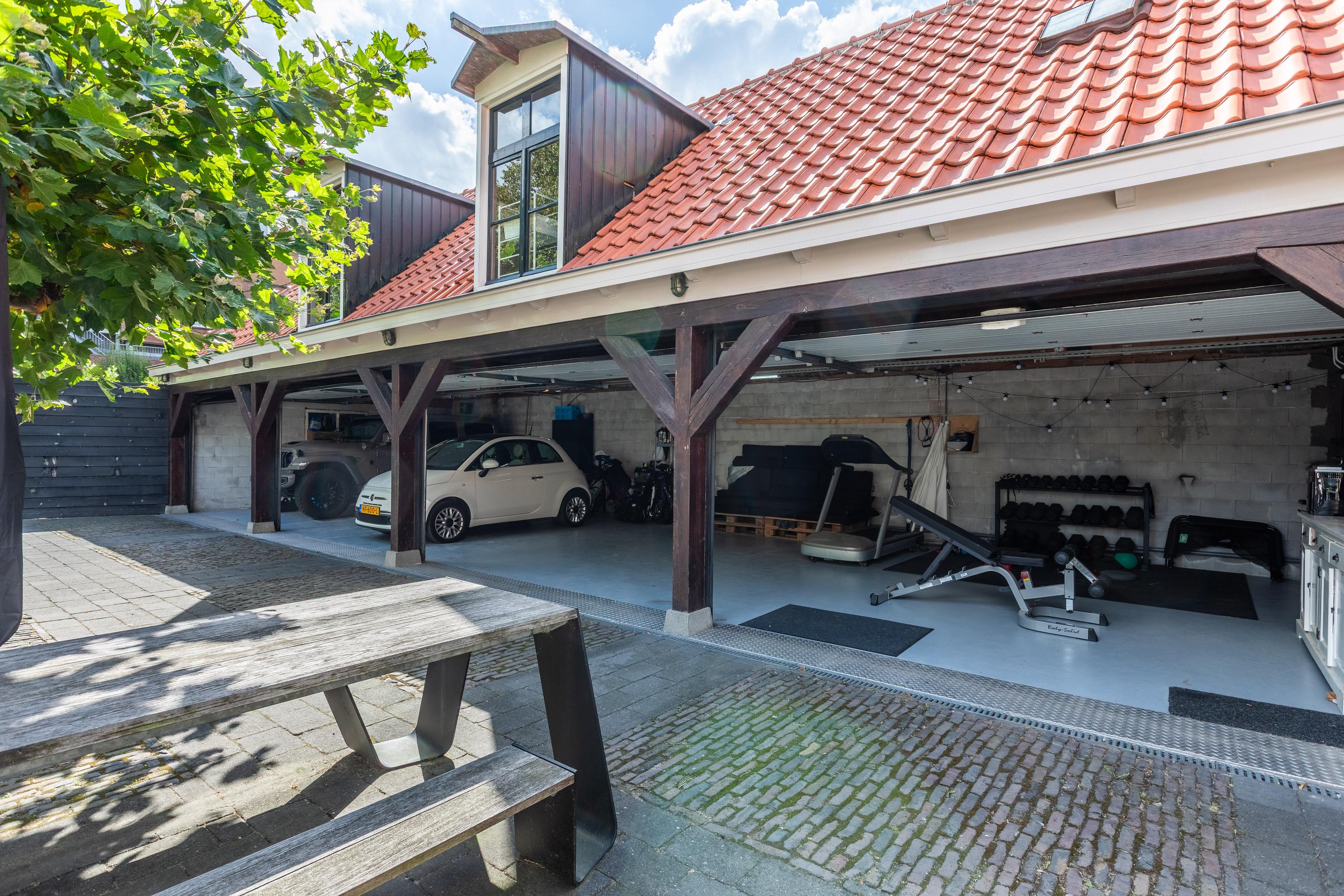 - Garage met vier deuren, gym en zolder (65 m²) met potentie tot uitbreiding met mogelijkheid tot een eigen ingang;
