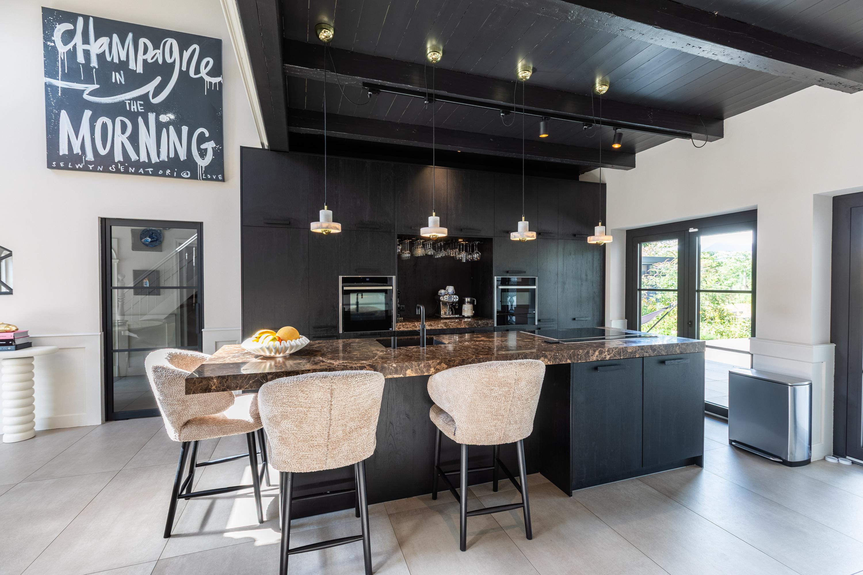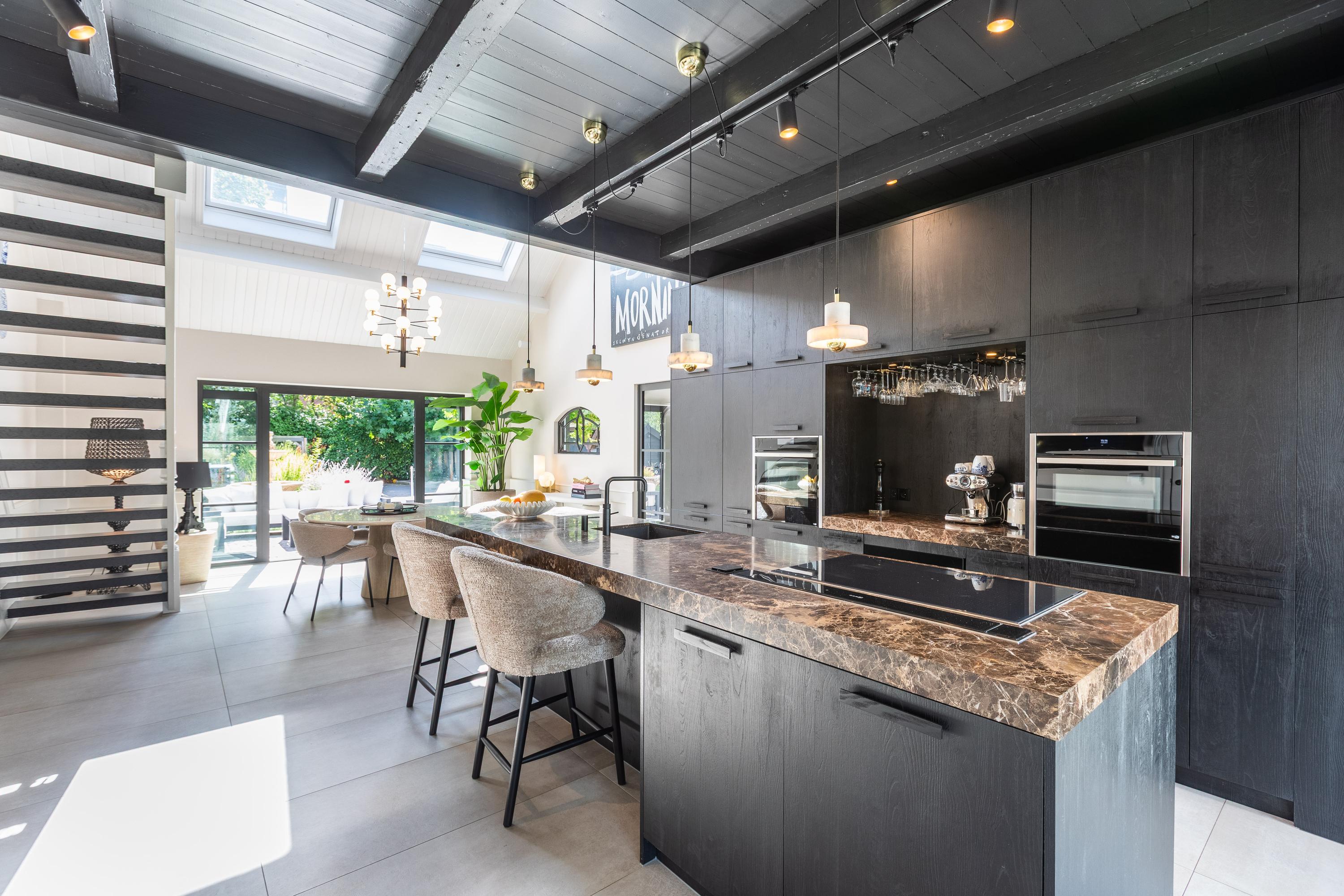 - Woonkeuken met marmeren kookeiland en entresol;