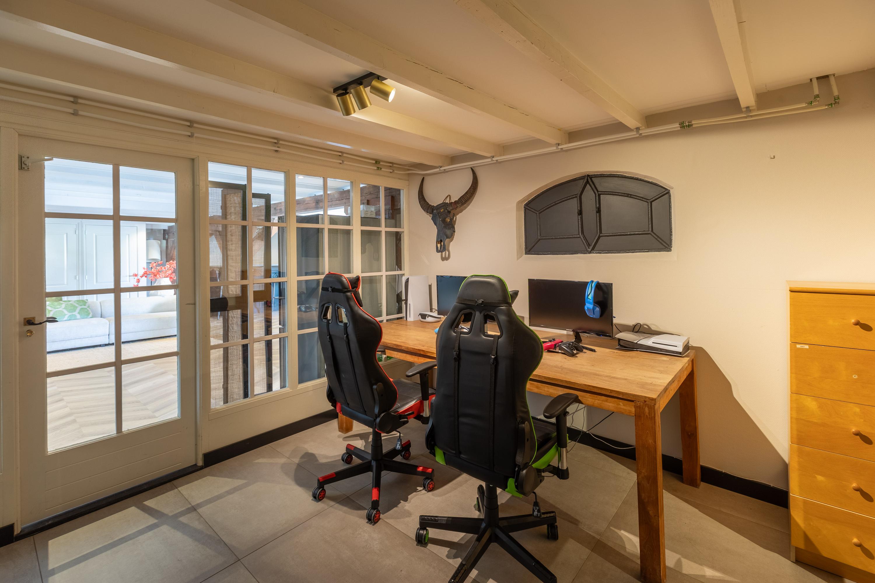 Onder de opkamer bevindt zich de voormalige kaaskelder, tegenwoordig ingericht als sfeervolle thuisbioscoop.