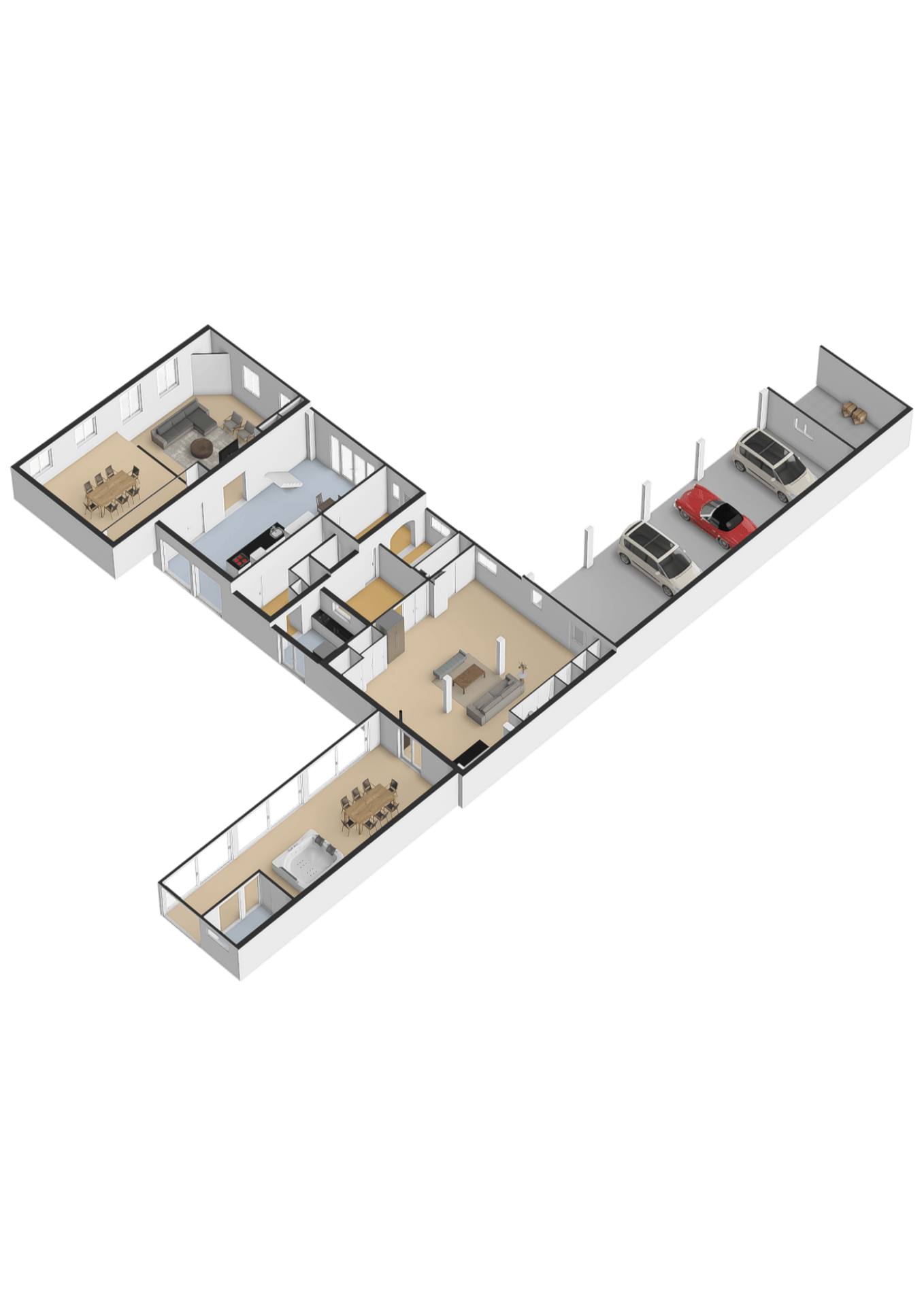 Daarnaast beschikt de begane grond over een tweede moderne keuken bij het terras en een multifunctionele ruimte van ca. 85 m² in de voormalige stal, voorzien van een bar, pantry, toilet en toegang tot de garages en bergruimte. Aan de andere zijde van deze ruimte betreedt u de royale aanbouw met wellness, compleet ingericht met jacuzzi, Finse sauna, infraroodsauna en voldoende plek voor een grote eettafel of een lounge set– een heerlijke plek om te ontspannen en samen te genieten.
