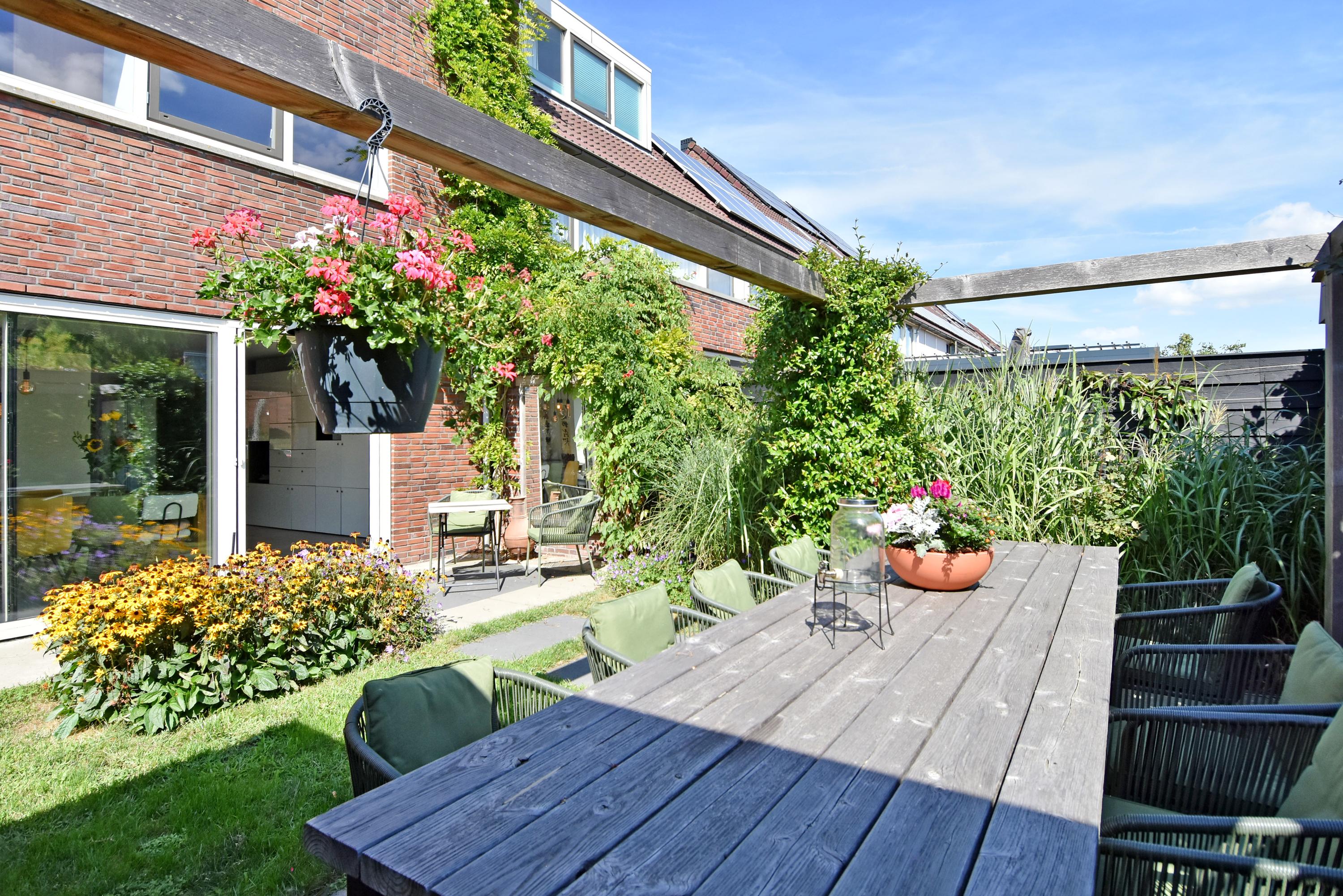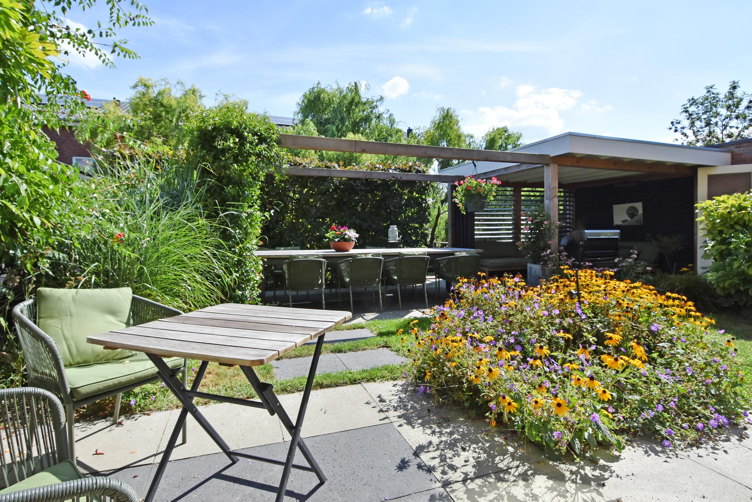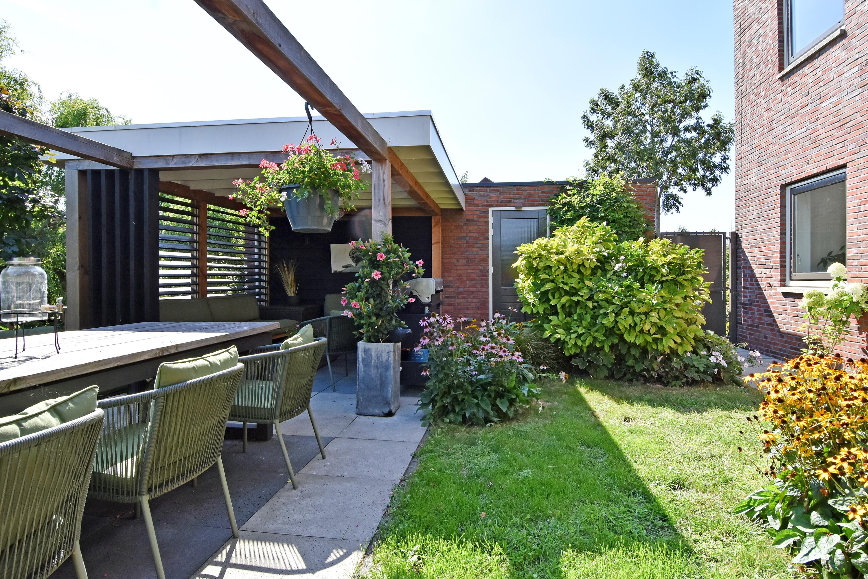 Vanuit de ruime hal kom je de sfeervolle, lichte living binnen. Deze vormt door de grote schuifpui een prachtige verbinding met de zonnige tuin. De tuin is recent fraai aangelegd en voorzien van veel groen, een gazon een zonnig terras, een veranda en overkapping: een heerlijke plek om het hele jaar door te genieten en relaxen. De tuin grenst aan het water.