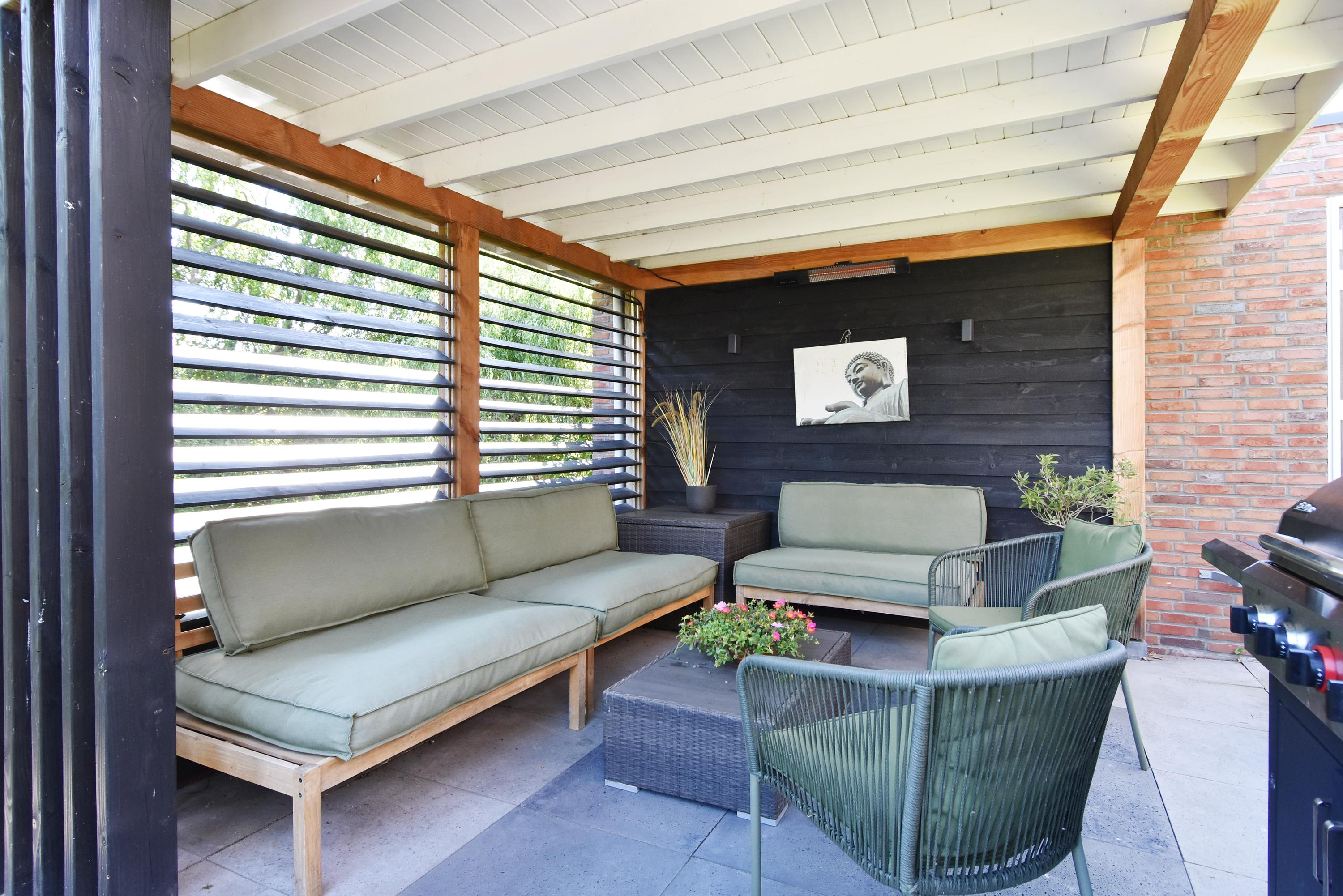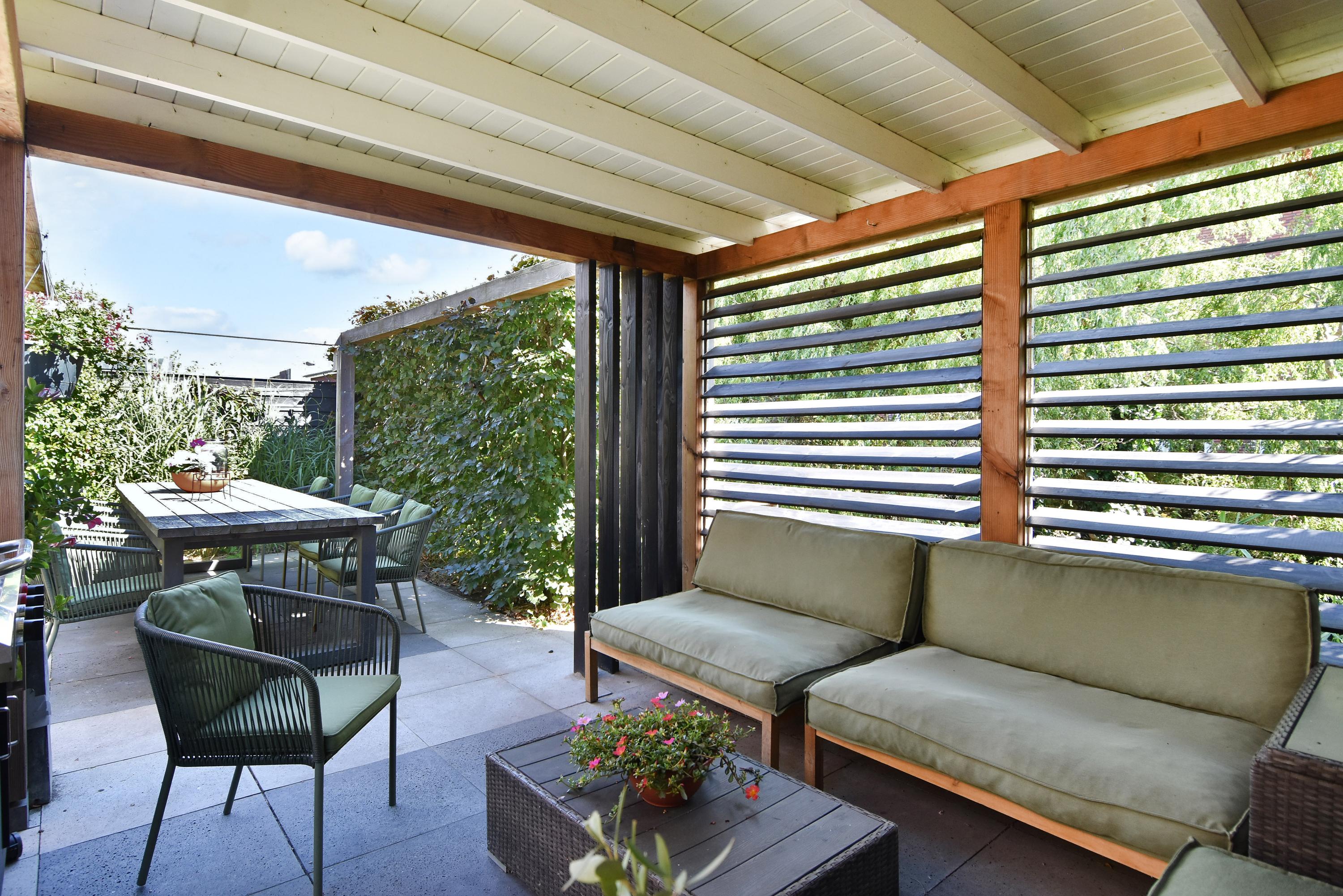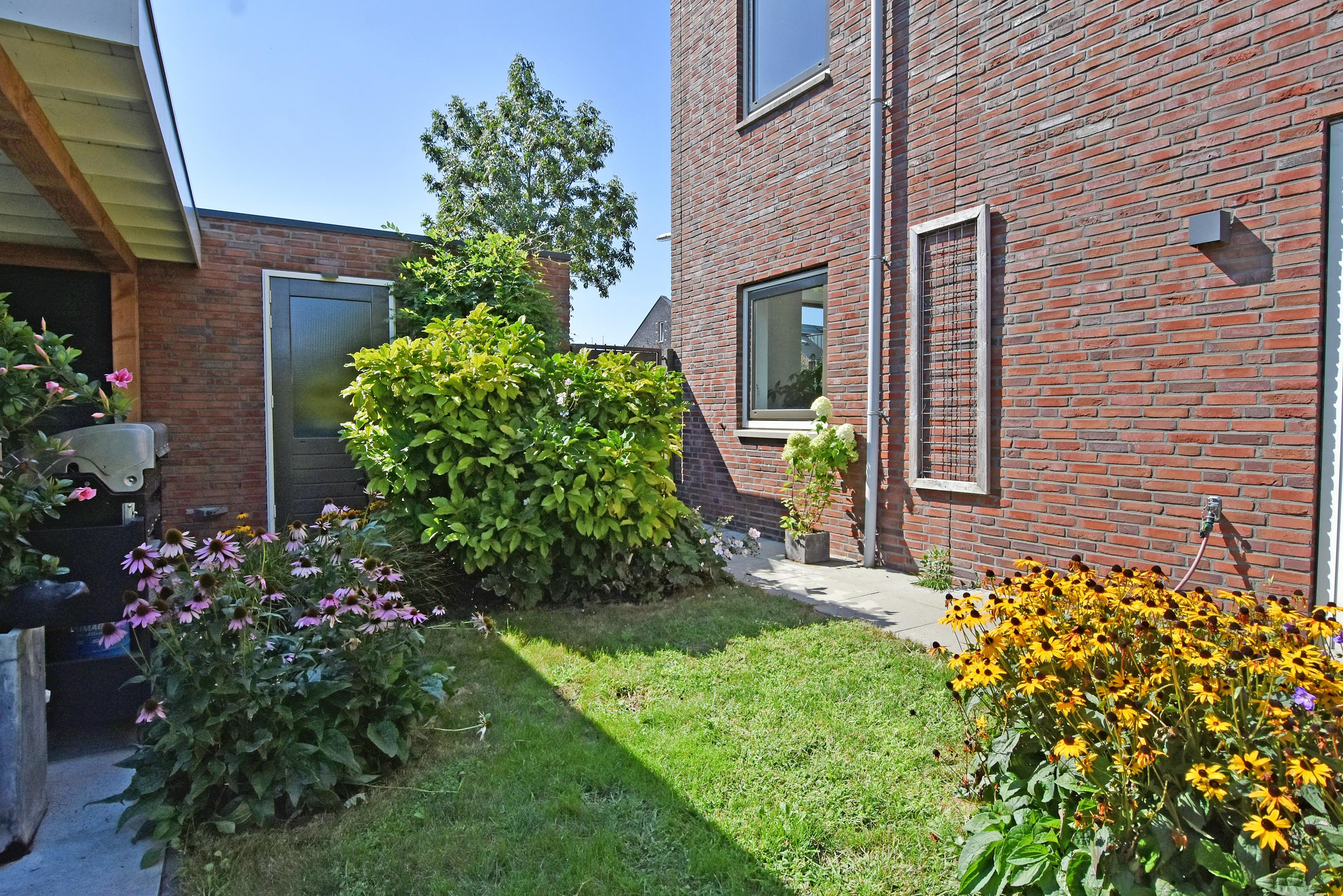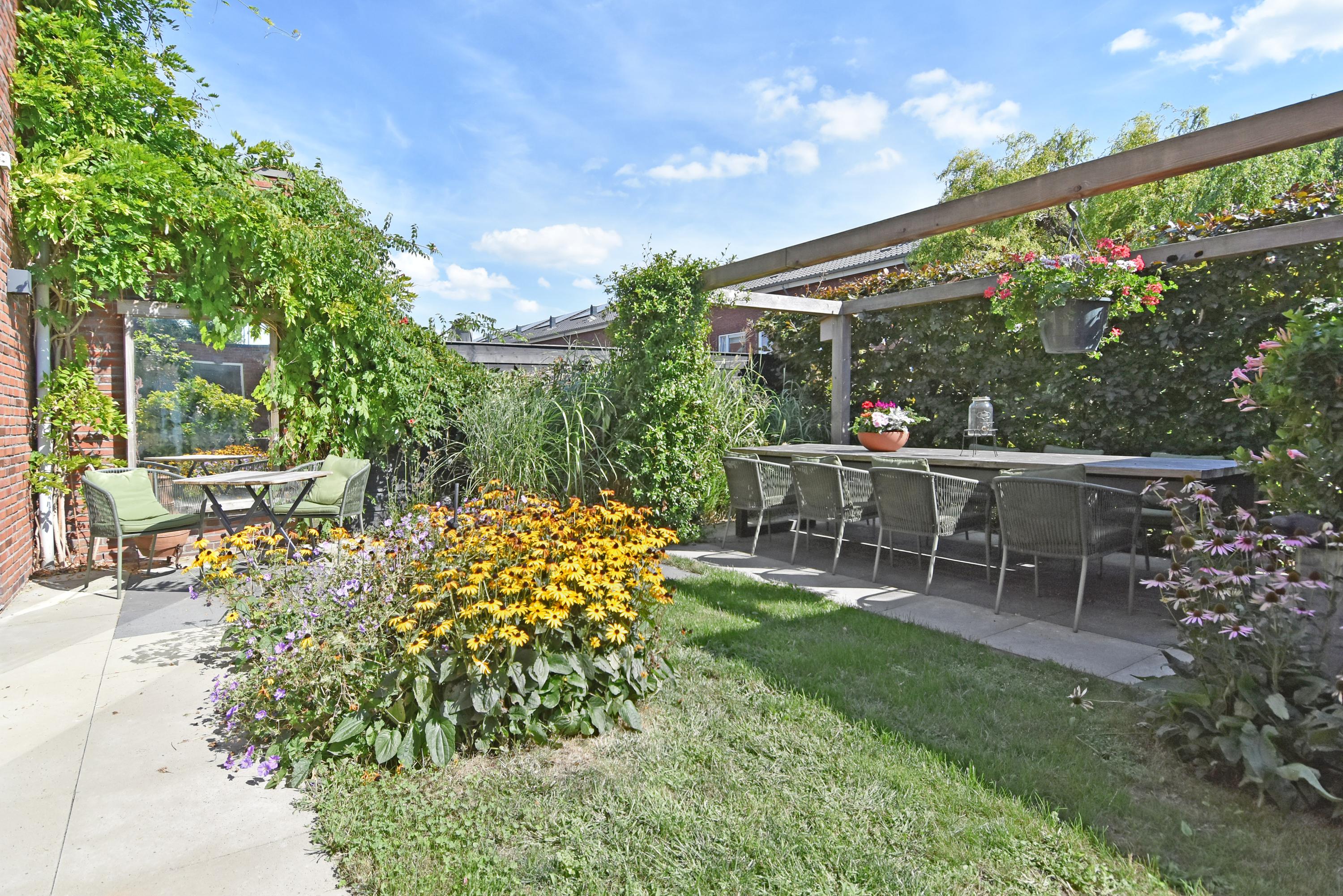 Vanuit de ruime hal kom je de sfeervolle, lichte living binnen. Deze vormt door de grote schuifpui een prachtige verbinding met de zonnige tuin. De tuin is recent fraai aangelegd en voorzien van veel groen, een gazon een zonnig terras, een veranda en overkapping: een heerlijke plek om het hele jaar door te genieten en relaxen. De tuin grenst aan het water.