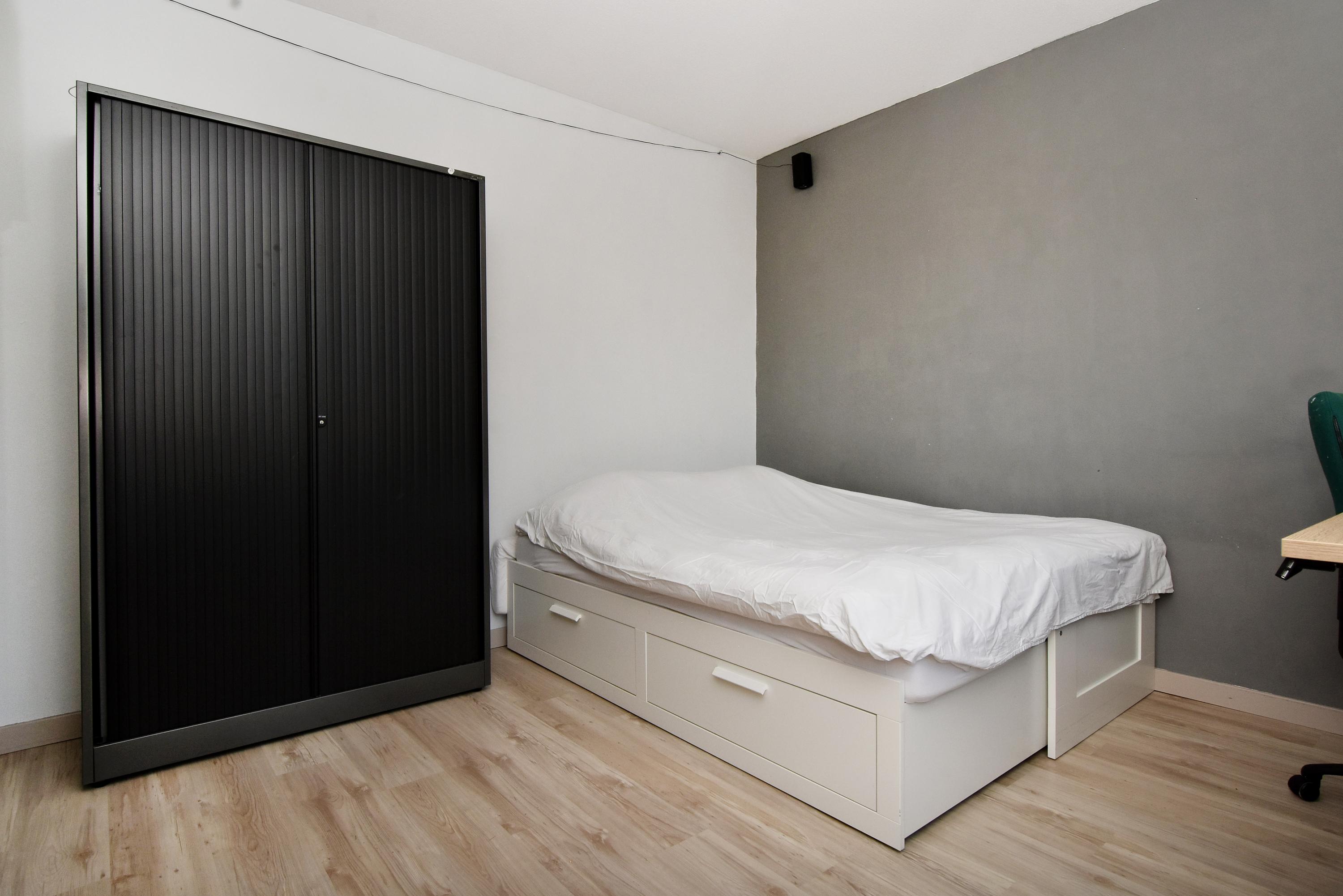 De derde slaapkamer/studio (thans ouderslaapkamer) die toegang biedt tot het terras heeft een speelse indeling met een bijzonder fraaie plafondhoogte van meer dan 4 meter (!) met een entresol en vide.